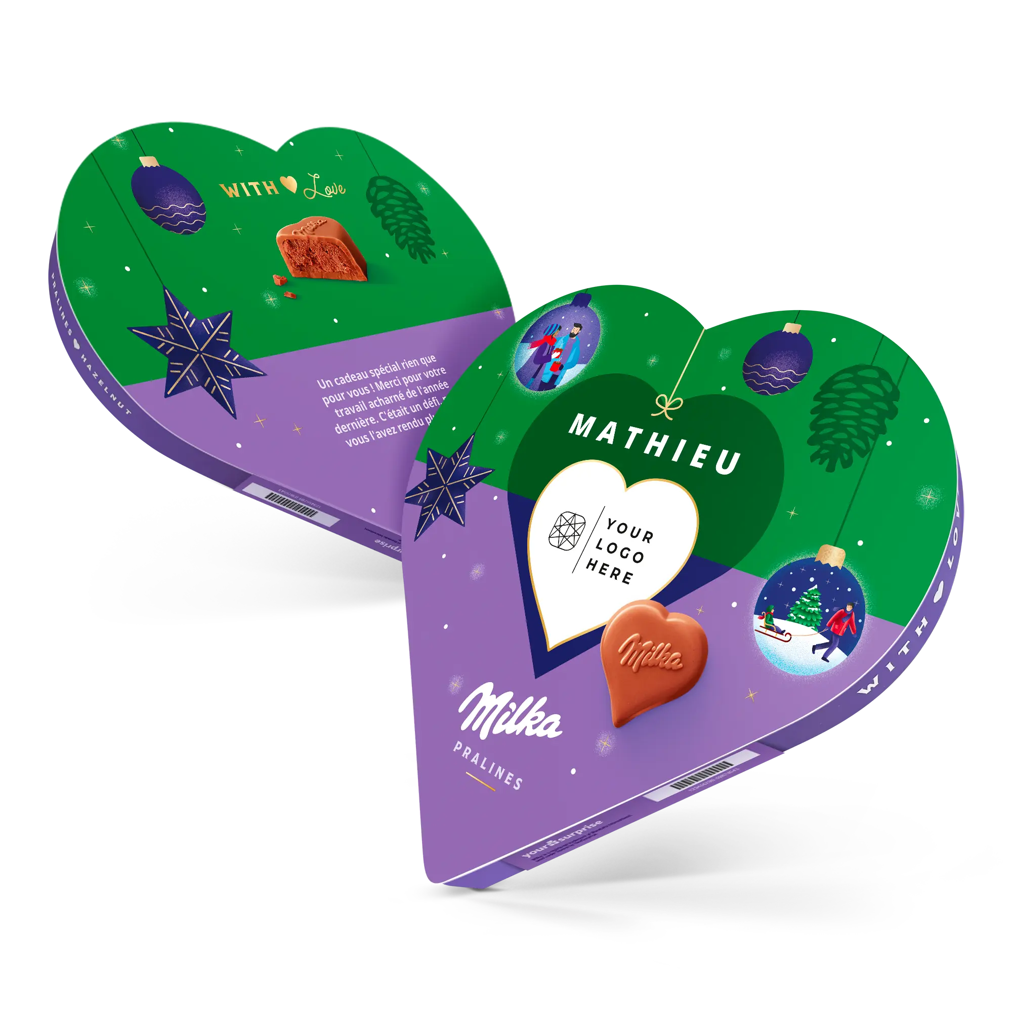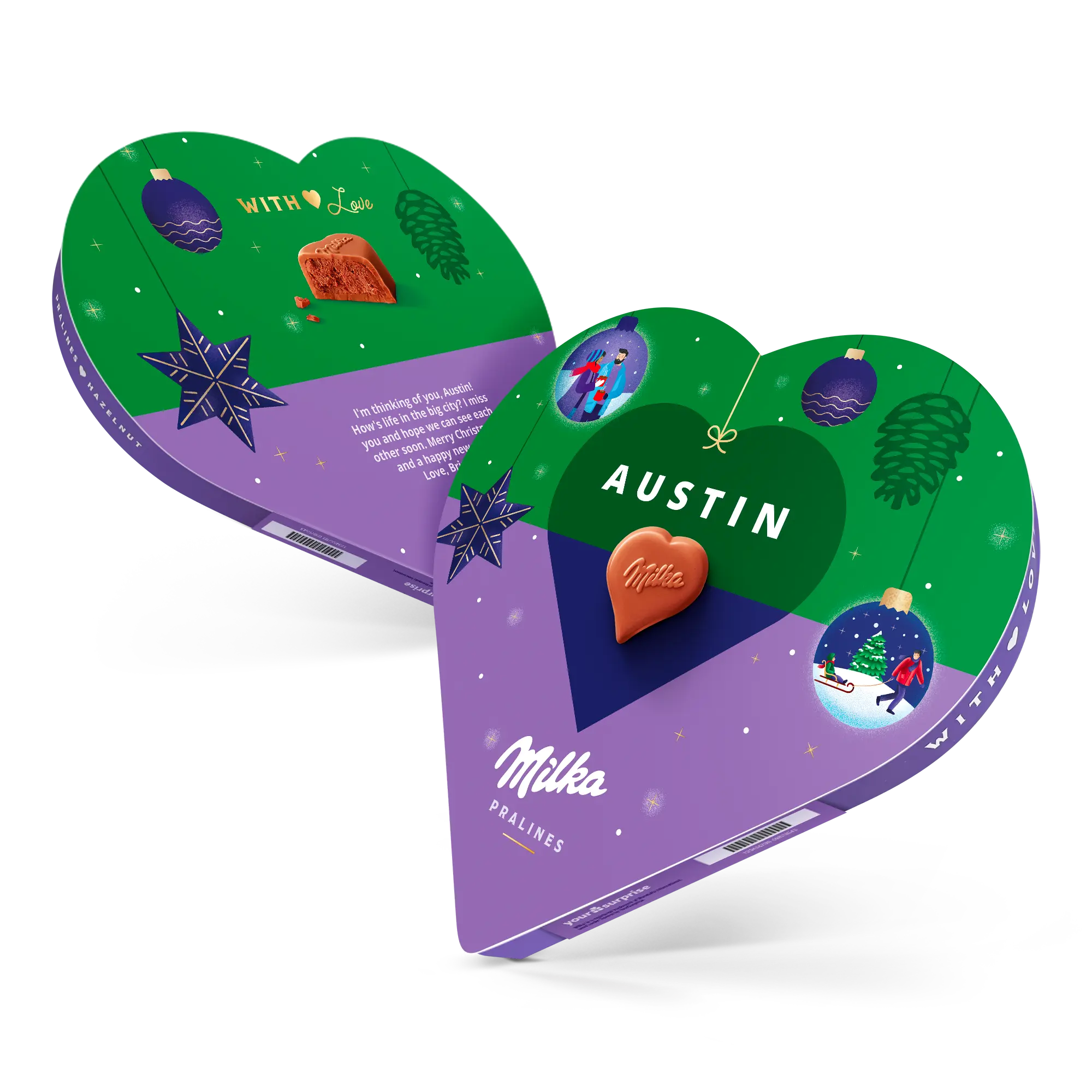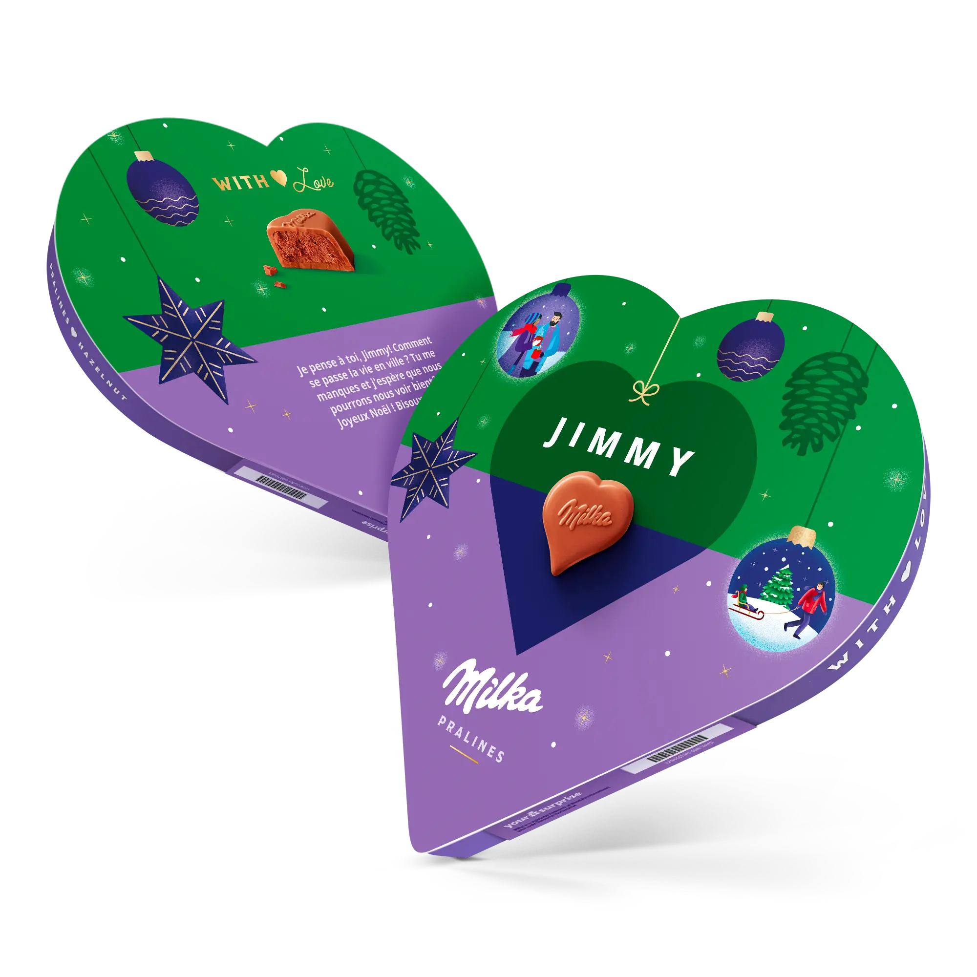 Najlepszy prezent świąteczny dla miłośników czekolady: serce Milka z imieniem i/lub zdjęciem z 30 czekoladkami.Więcej informacji na temat serca Milka:Czekolada: czekoladowe praliny w kształcie sercNadzienie: krem nugatowo-orzechowyWaga: 187 gramówWymiary: 24 x 25,5 cmPersonalizacja: zdjęciem, imieniem i wiadomościąDruk: idealny i w pełnym kolorzeZ przyczyn technicznych nie można używać znaków cyrylicy, azjatyckich, arabskich, tureckich, greckich ani znaków specjalnych.Składniki: Cukier, masło kakaowe, olej palmowy, miazga kakaowa, serwatka w proszku (mleko), odtłuszczone mleko w proszku, tłuszcz mleczny, 5% pasty z orzechów laskowych, emulgatory (lecytyna sojowa, E476), aromaty (zawierające mleko). Alergeny: Zawiera orzechy laskowe, mleko i soję. Może zawierać (śladowe ilości) innych orzechów.
