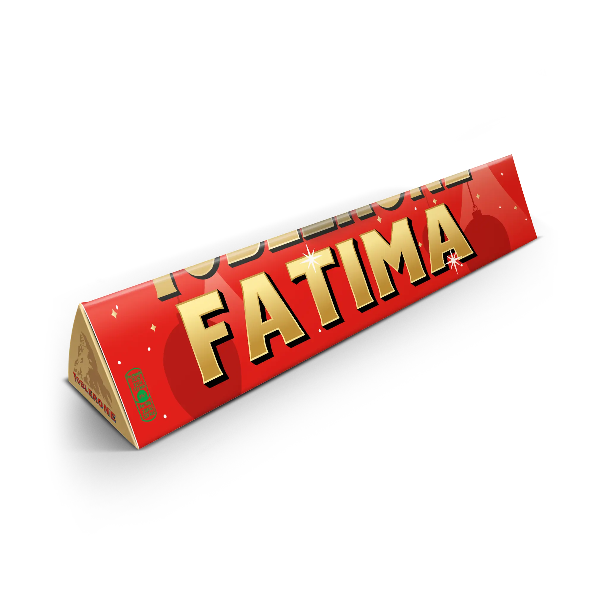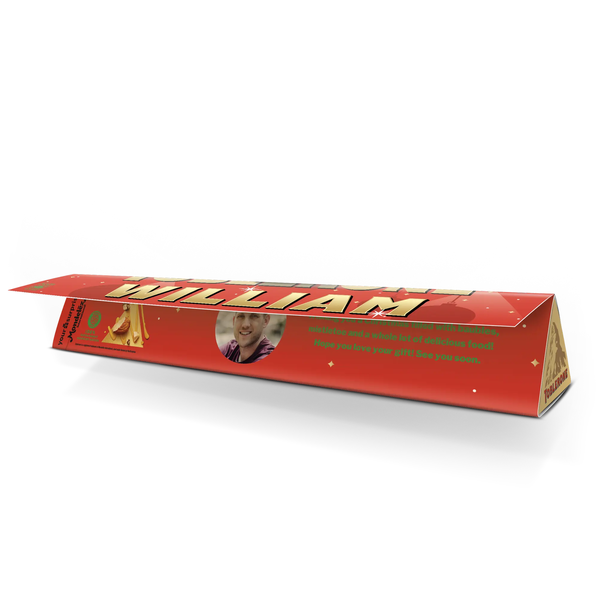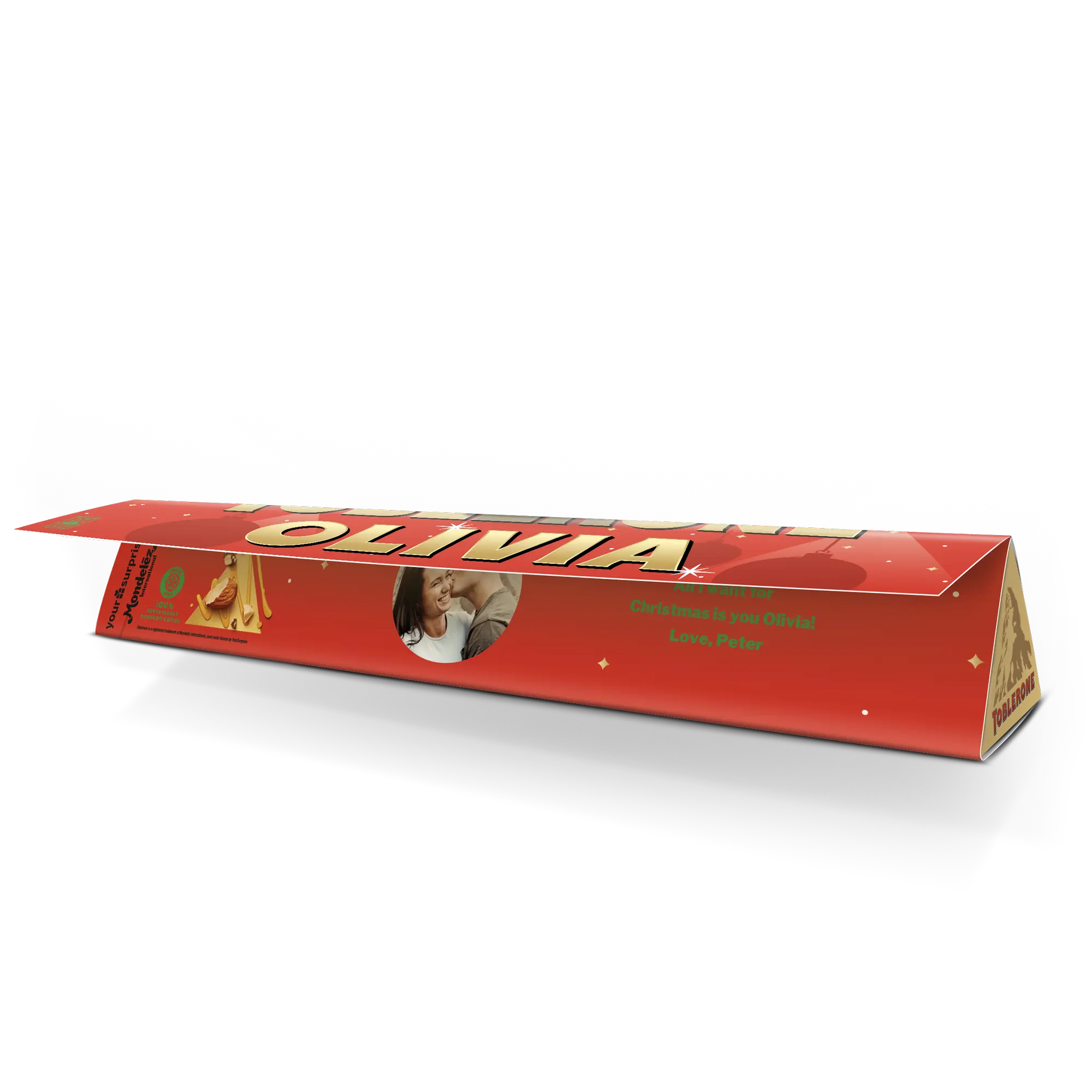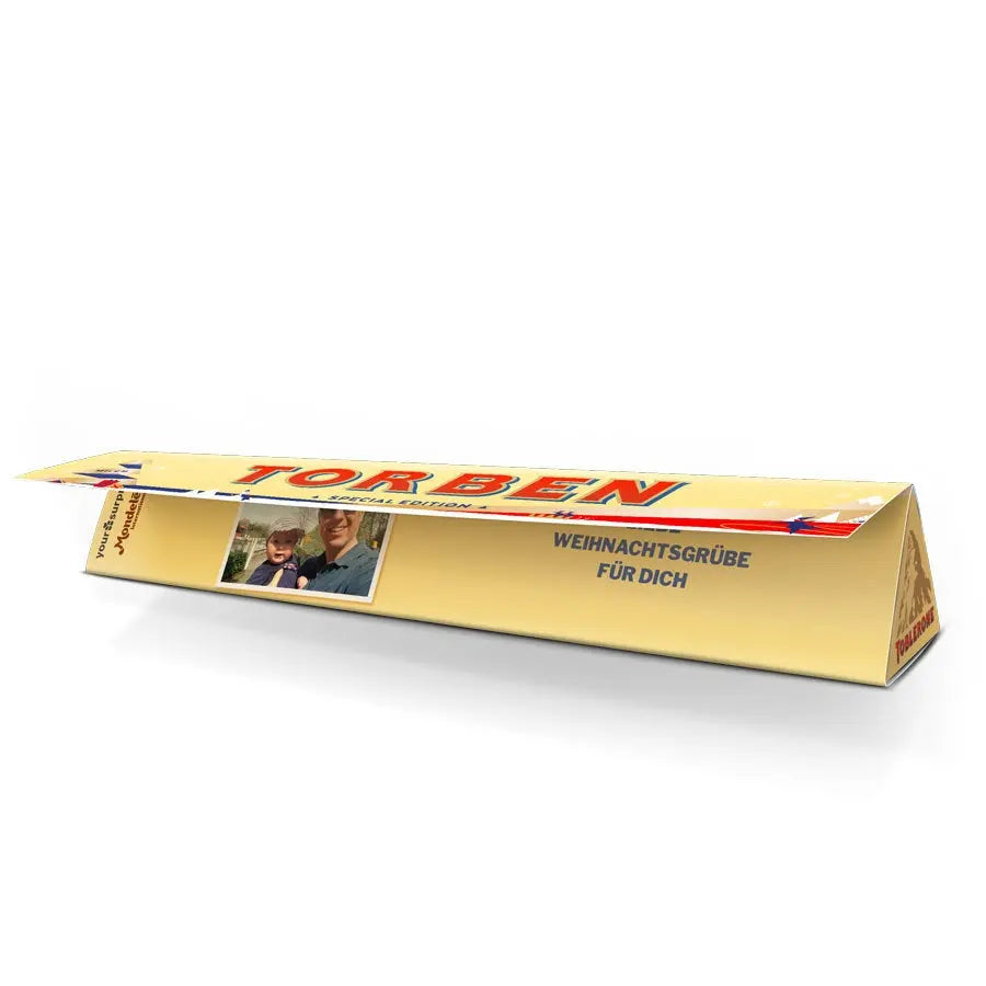 Zaskocz czekoholików w swoim życiu spersonalizowaną tabliczką Toblerone na Boże Narodzenie z wybranym przez Ciebie imieniem, zdjęciem i wiadomością!Więcej informacji na temat spersonalizowanej tabliczki Toblerone na Boże Narodzenie:Czekolada: mleczna czekolada z miodem i nugatem migdałowymWaga: 200 gramówWymiary: 27,5 x 4,5 x 4 cmPersonalizacja: zdjęciem, imieniem i wiadomościąNadruk: niezwykle ostry i w pełnym kolorzeZ przyczyn technicznych nie można używać znaków cyrylicy, tureckich, azjatyckich, arabskich, greckich ani znaków specjalnych.Składniki:Cukier, pełne mleko w proszku, masło kakaowe, miazga kakaowa, miód (3%), tłuszcz mleczny, migdały (1,6%), emulgator (lecytyna sojowa), białko jaja, aromat. Mleczna czekolada zawiera co najmniej 28% kakao. Alergeny:Zawiera jaja, mleko, soję, migdały i może zawierać śladowe ilości innych orzechów.