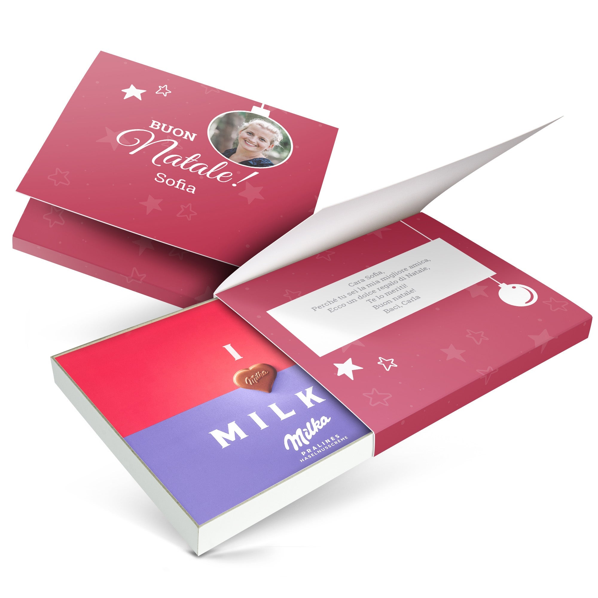 Zabawne pudełko prezentowe Milka na Boże Narodzenie. Pyszne czekoladki z nadzieniem z kremu orzechowo-nugatowego i Twoją personalizacją na pudełku. Wesołych Świąt!