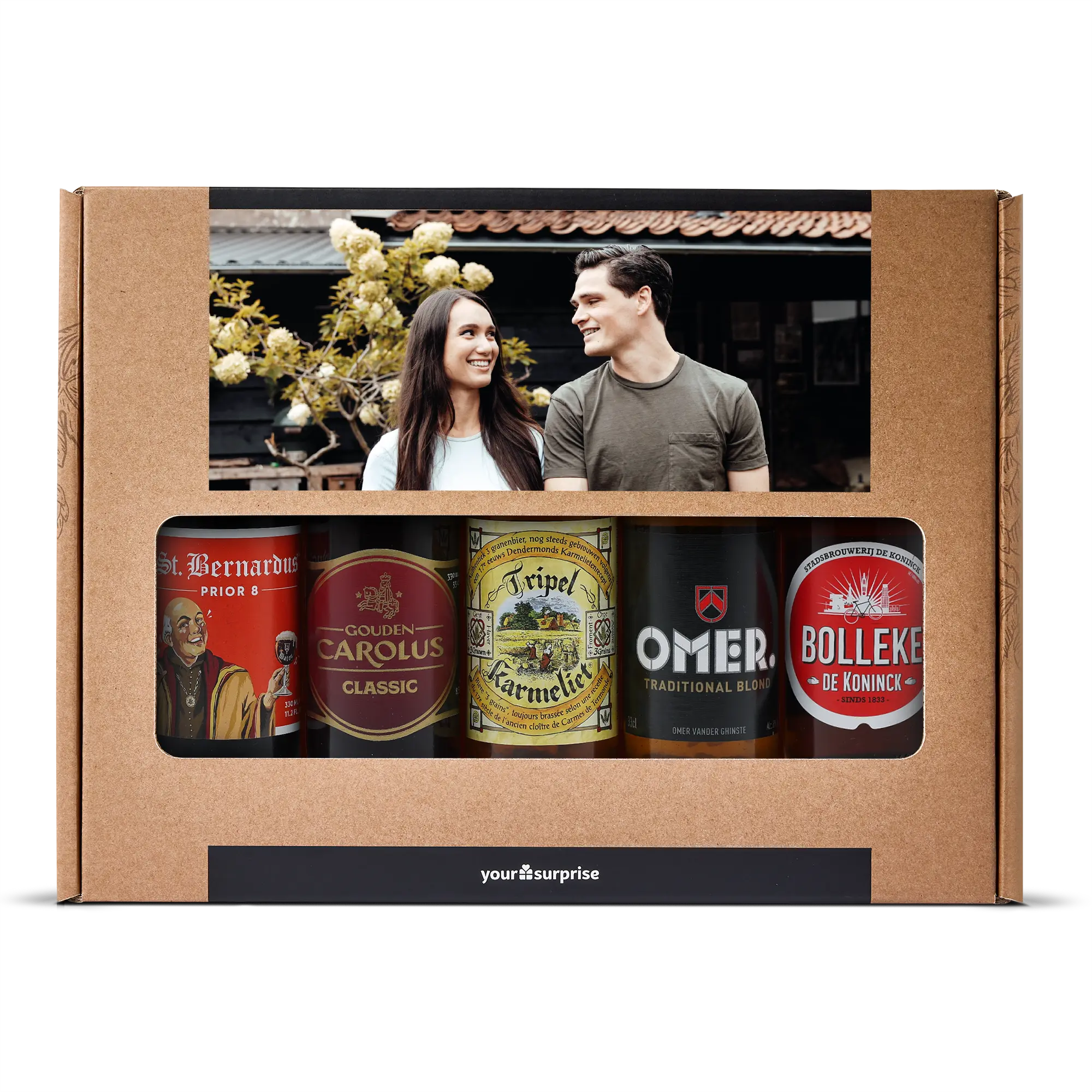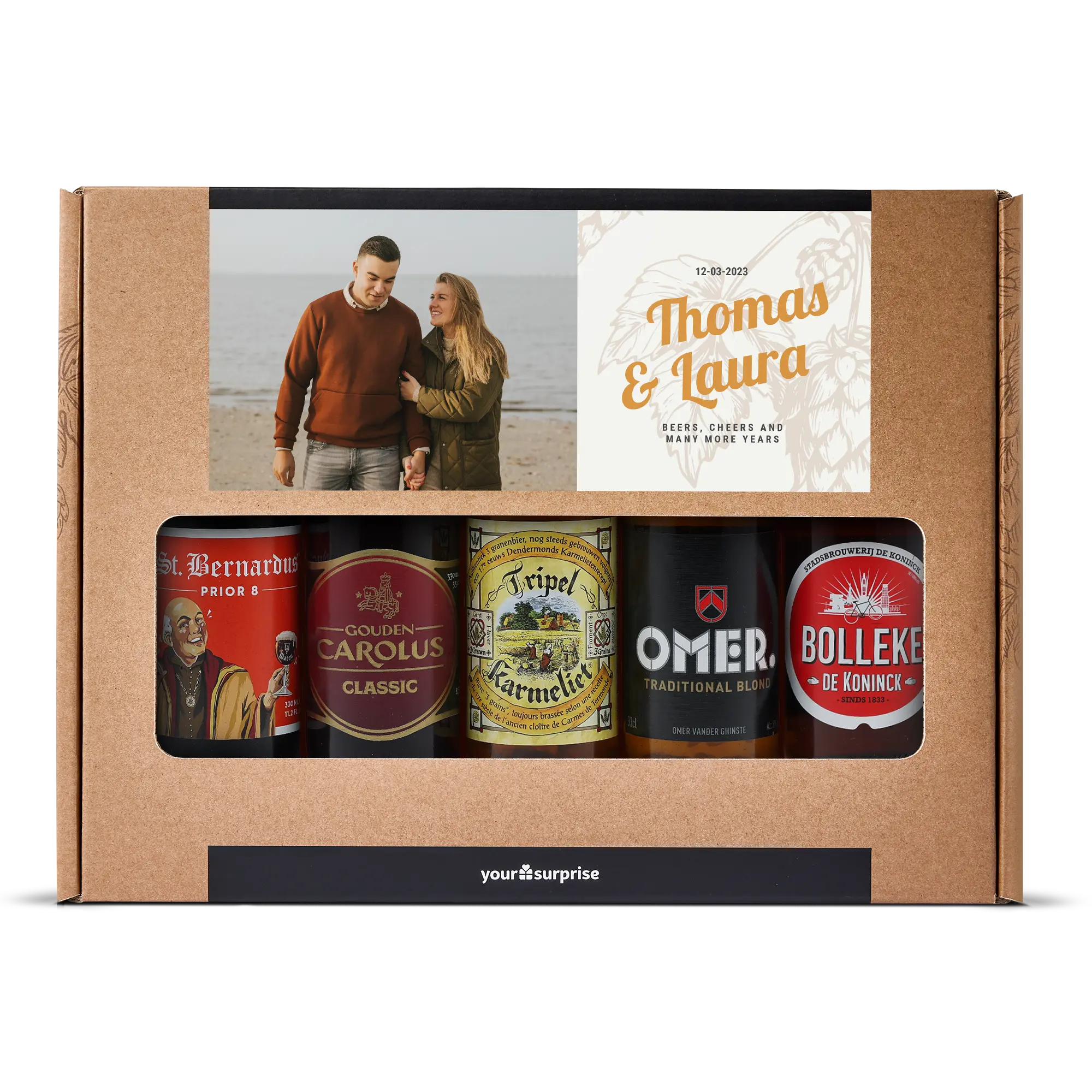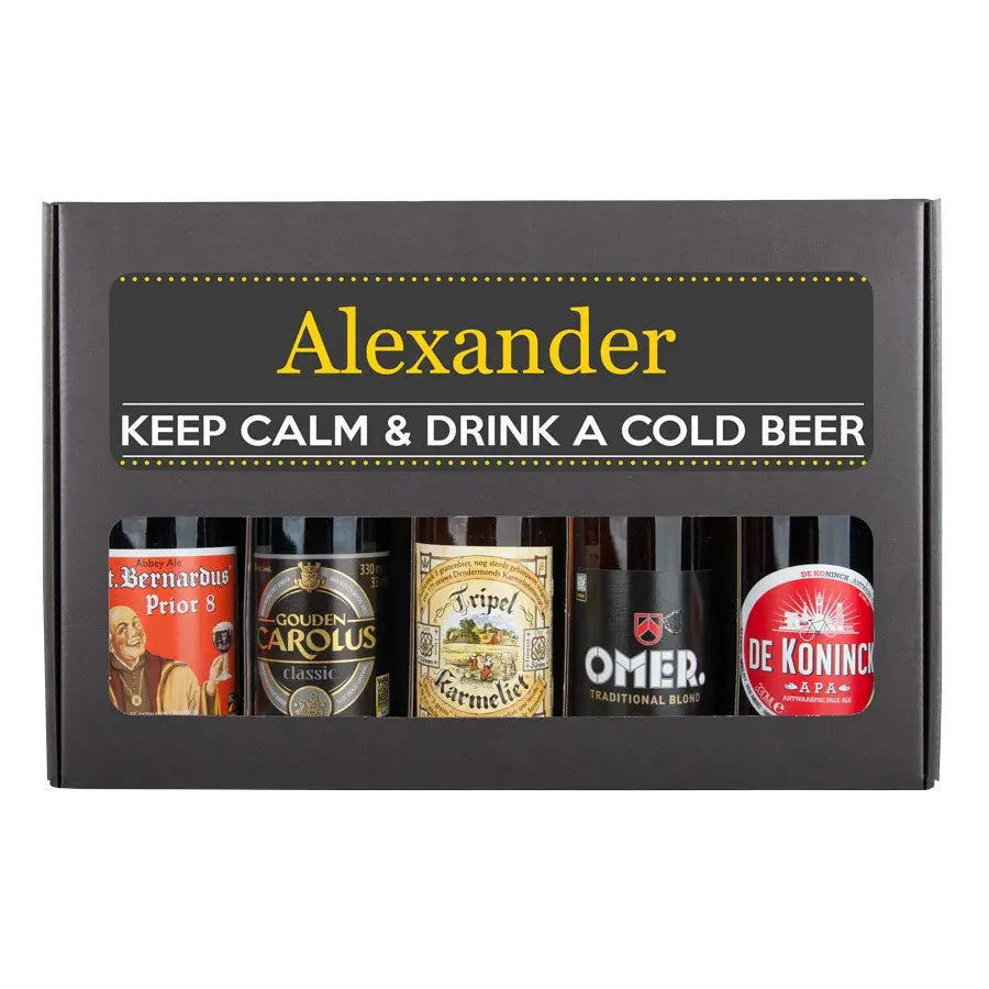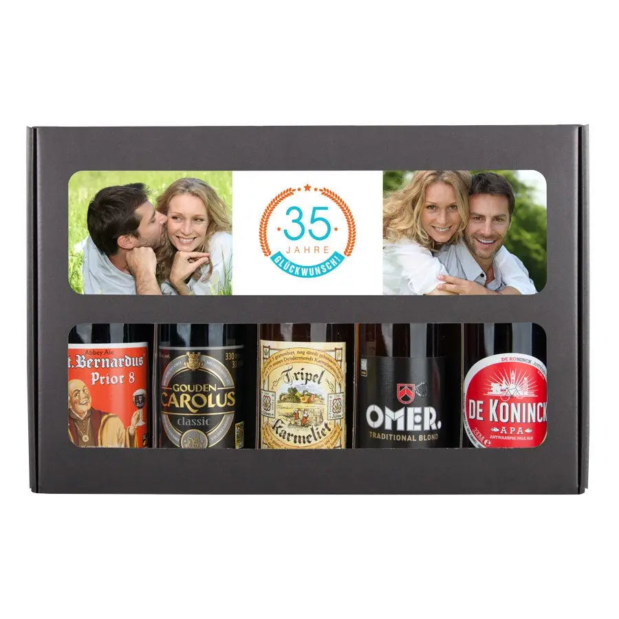 Pyszny zestaw upominkowy z piwem z Twoim zdjęciem i tekstem, wypełniony 5 różnymi belgijskimi piwami. Z personalizowanym wzorem!