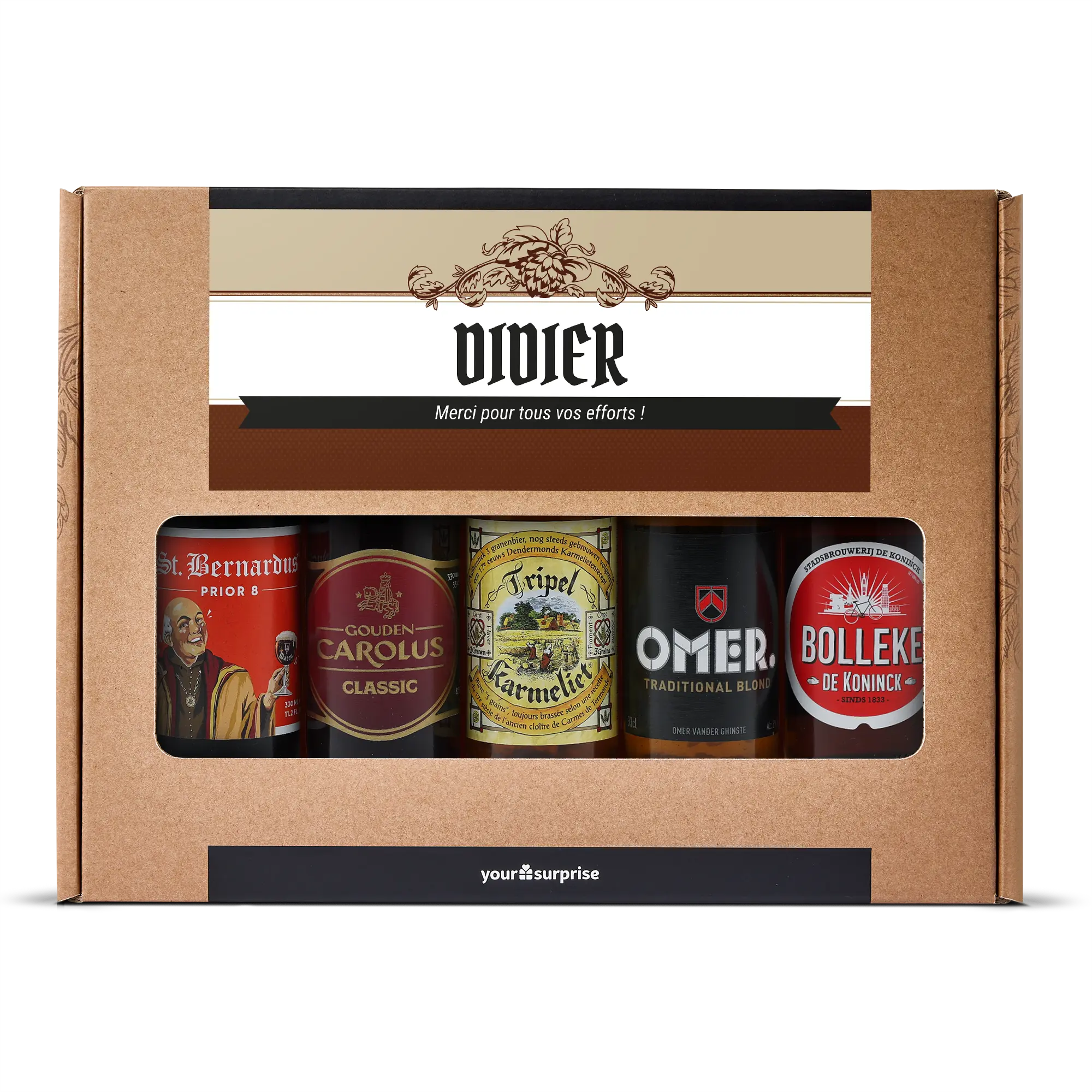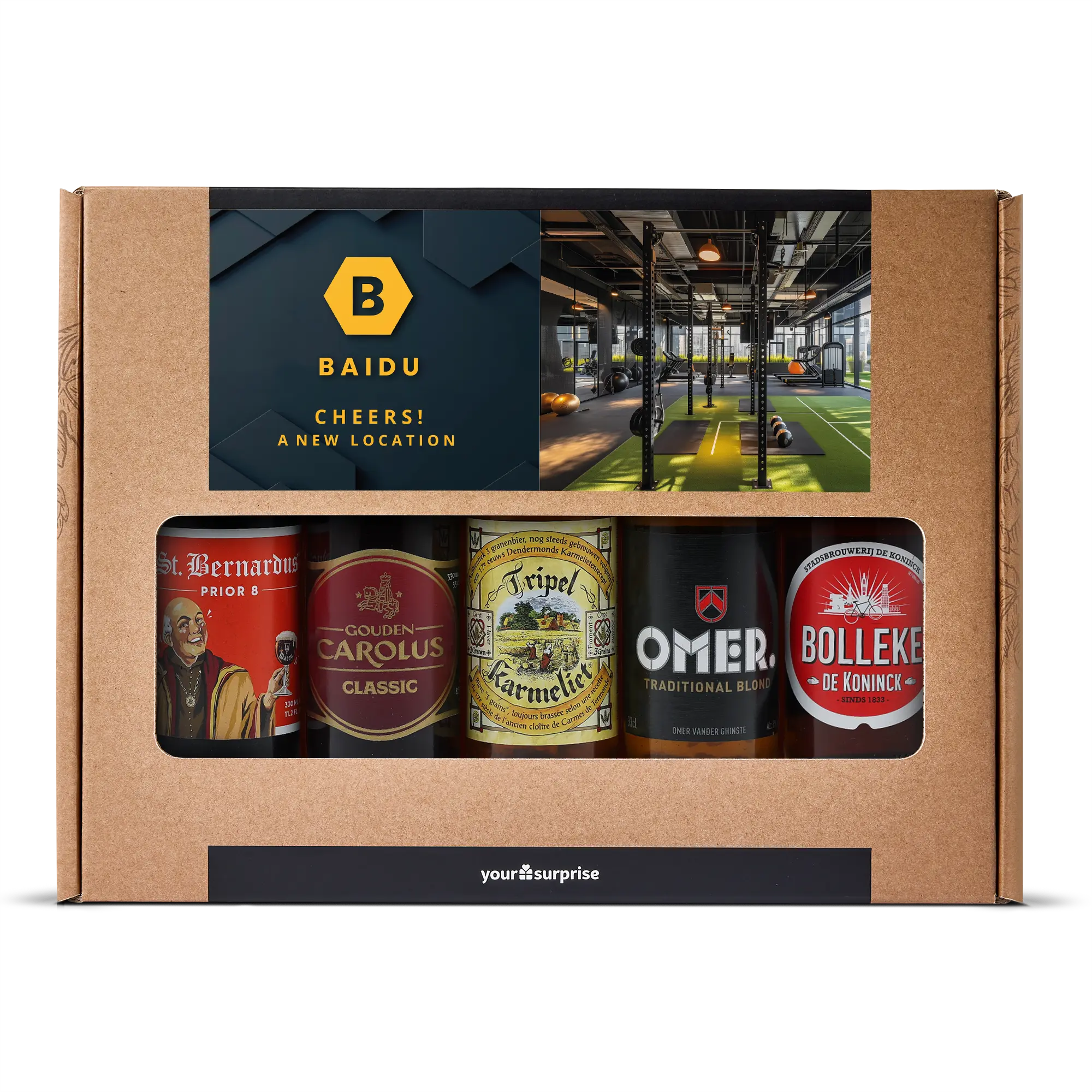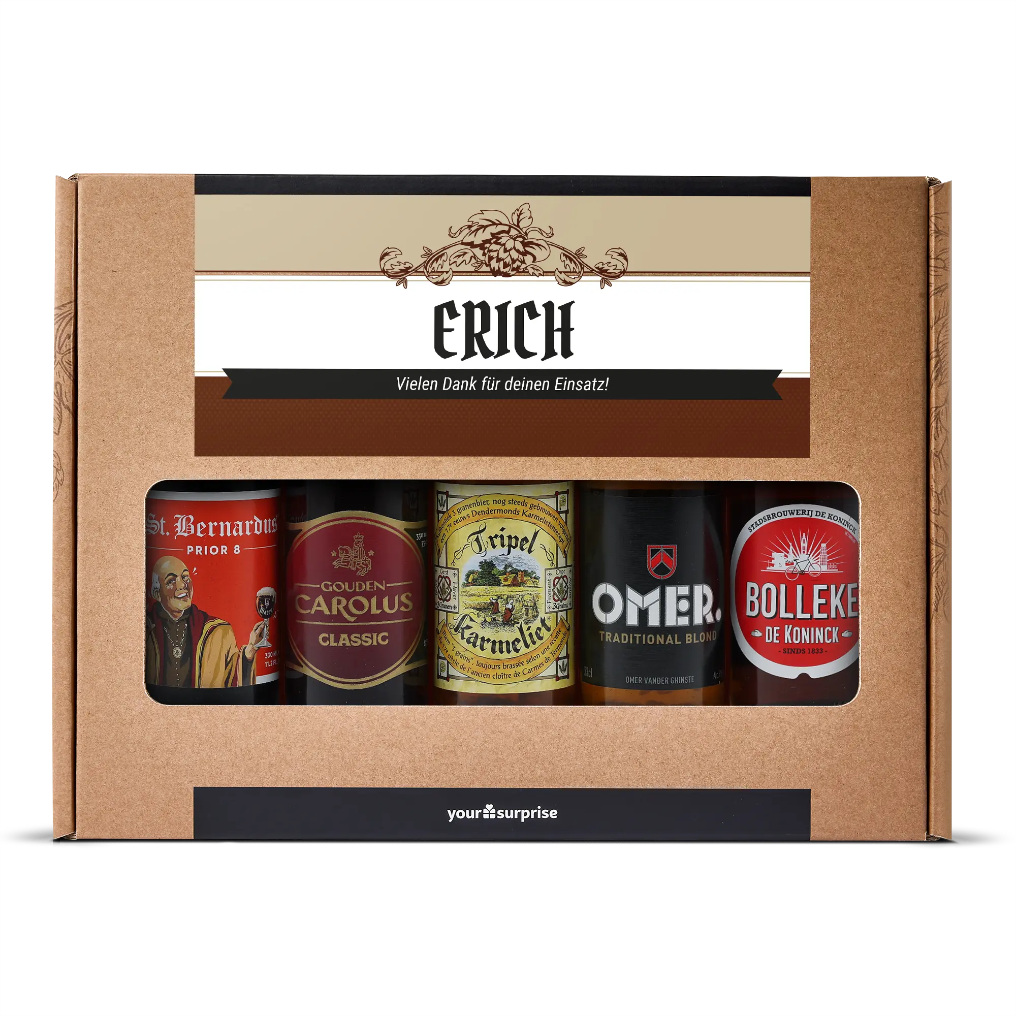 Pyszny zestaw upominkowy z piwem z Twoim zdjęciem i tekstem, wypełniony 5 różnymi belgijskimi piwami. Z personalizowanym wzorem!