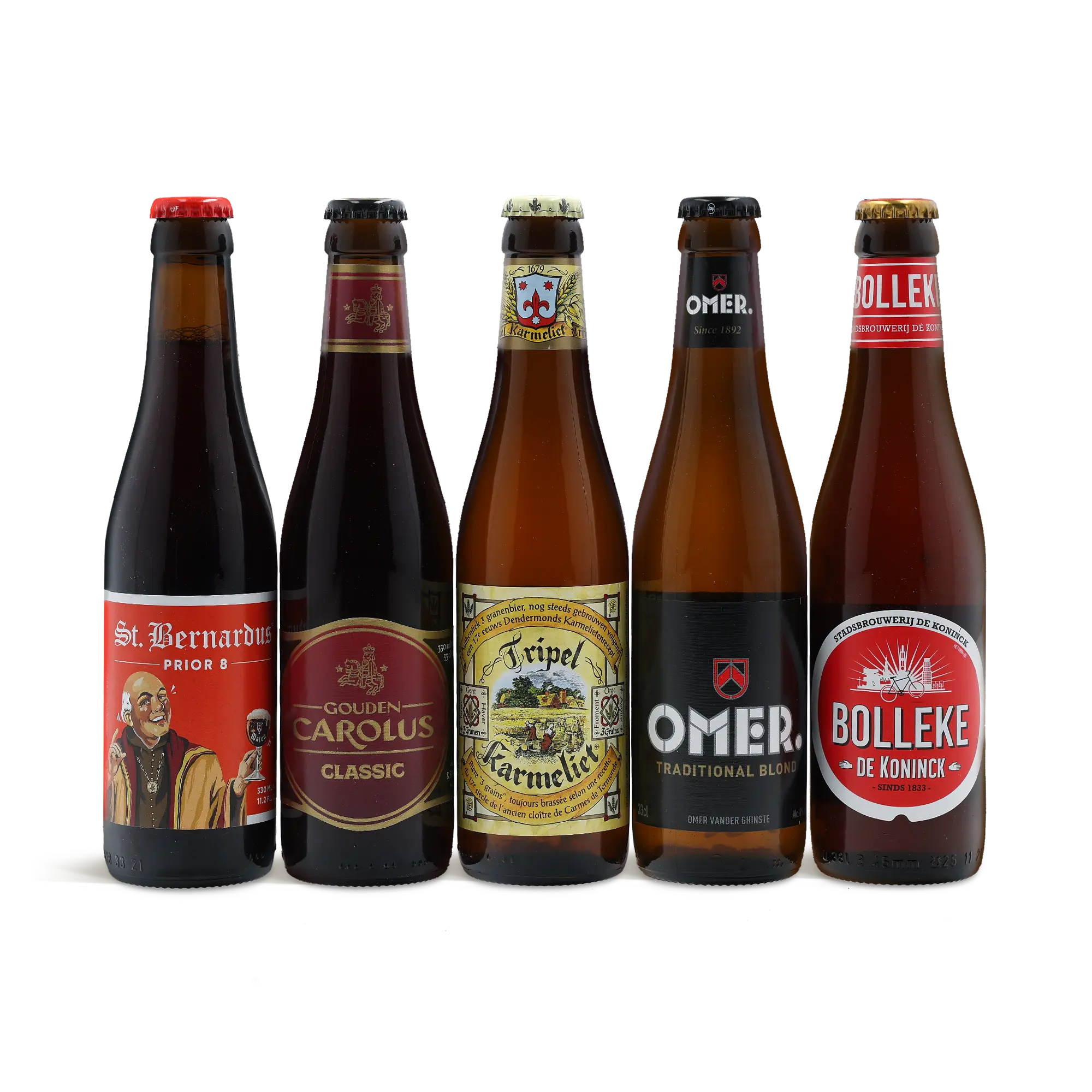 - Zawartość zestawu upominkowego: Gouden Carolus Classic (8,5%), St. Bernardus (8,0%), Omer (8,0%), Tripel Karmeliet (8,0%), De Koninck (5,0%).