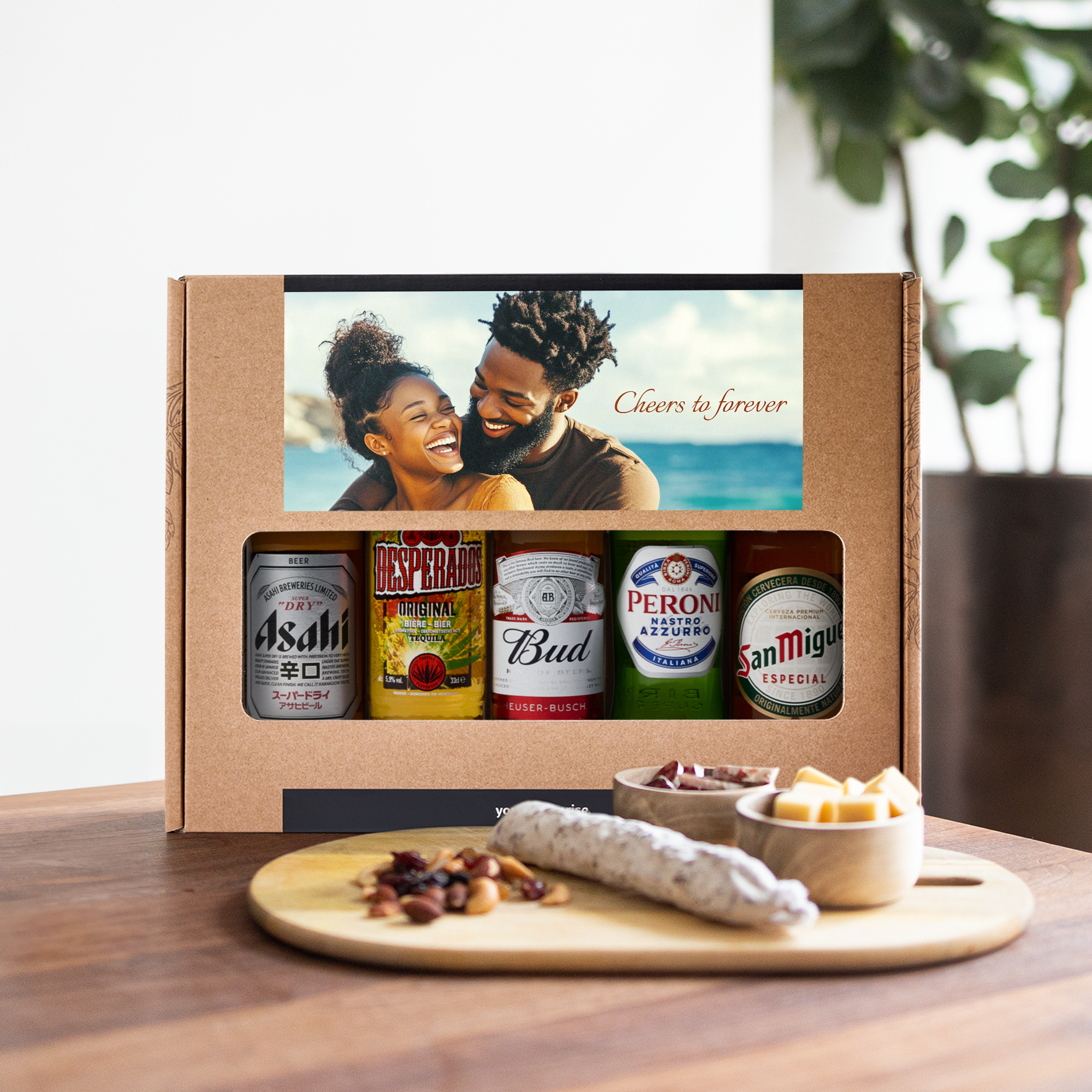Pyszny prezent w postaci piwa z Twoim zdjęciem i tekstem, wypełniony 5 różnymi piwami z całego świata. Z personalizowanym wzorem!
