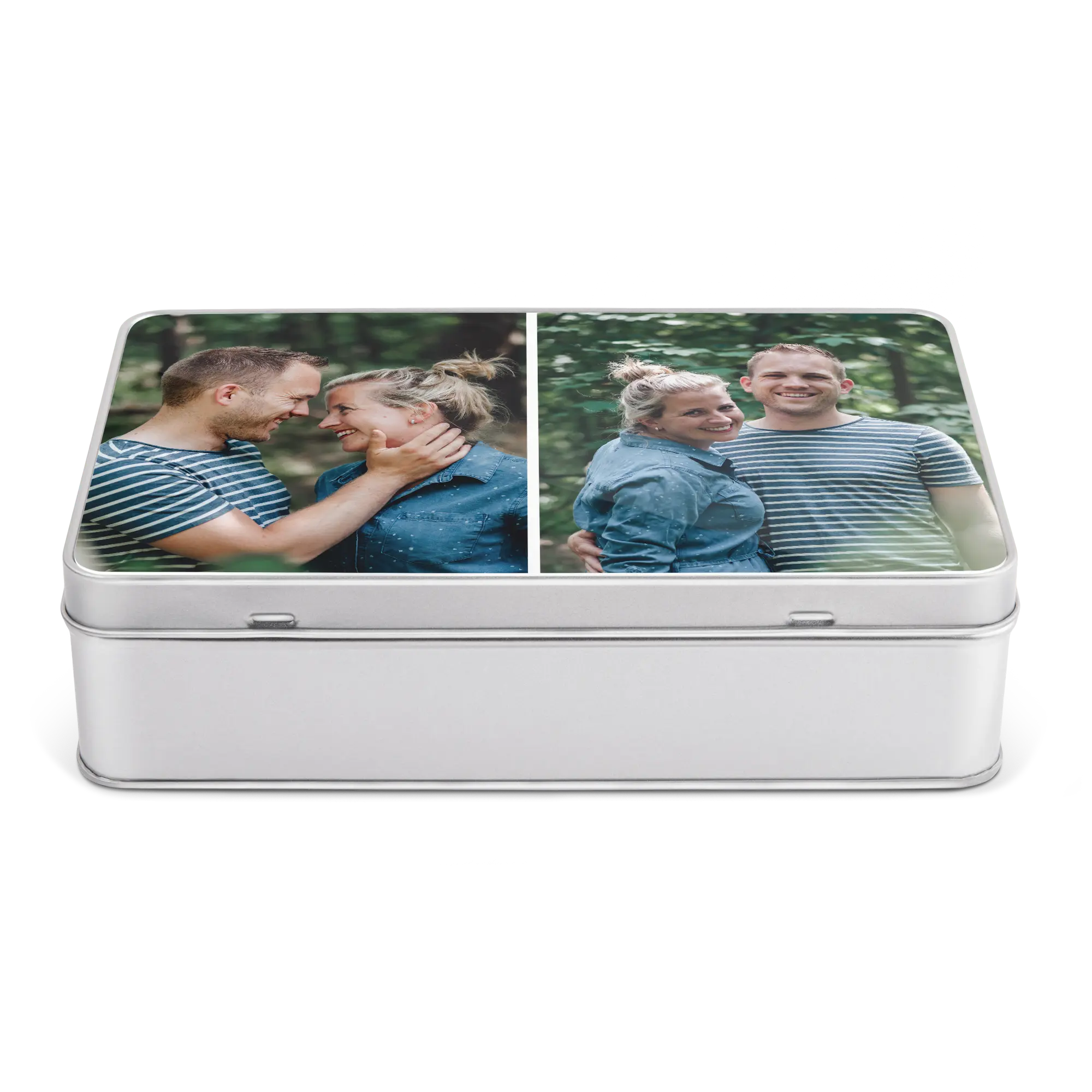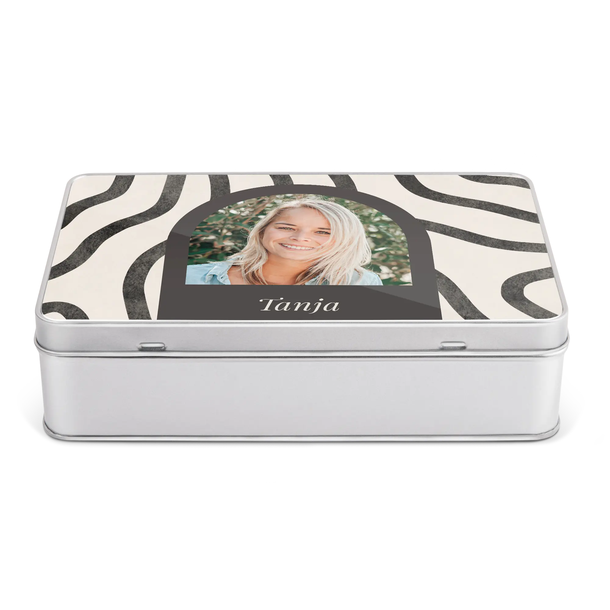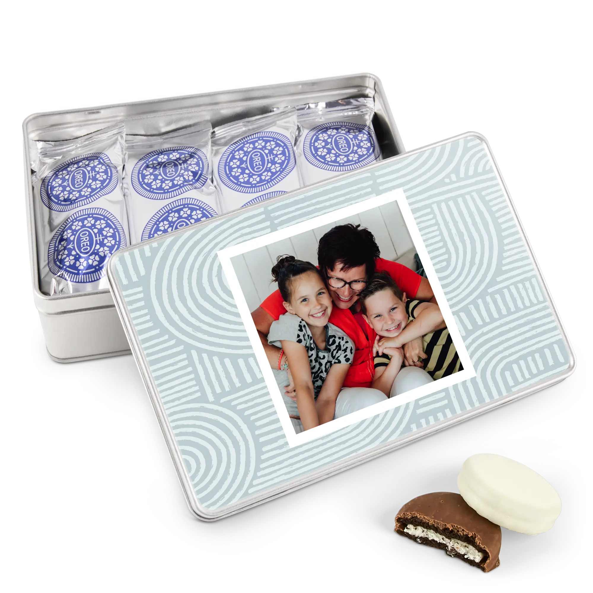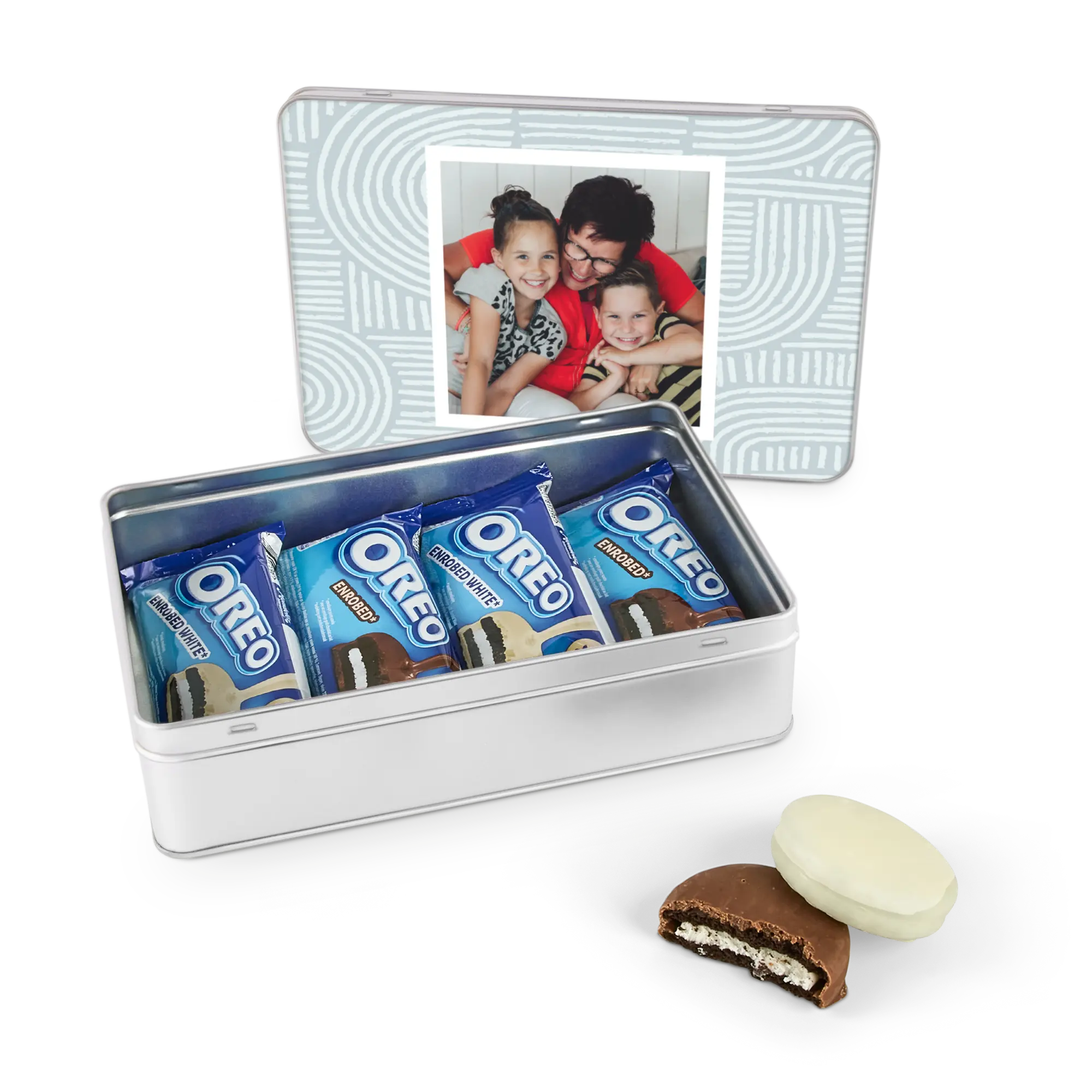 Super fajna puszka do przechowywania ze zdjęciem i/lub imieniem! Wypełniona pysznymi Oreo pokrytymi warstwą czekolady.Więcej informacji o puszce prezentowej: Kształt: prostokąt Materiał: puszka Wymiary: 20 x 12,5 x 5 cm Zawartość: Oreo w polewie i Ciasteczka Oreo w białej polewieWaga: 170 grPersonalizacja: zdjęcie i/lub tekst na aluminiowej tabliczce na pokrywceDodatkowo: zalecane mycie ręczneCiasteczka Oreo w mlecznej czekoladzie:Składniki: Cukier, mąka PSZENNA, olej palmowy, tłuszcz shea, odtłuszczone kakao w proszku 4,5%, olej rzepakowy, odtłuszczone MLEKO W PROSZKU, SKROBIA PSZENNA, laktoza (z MLEKA), syrop glukozowo-fruktozowy, emulgatory (lecytyna SOJOWA, E492, lecytyna słonecznikowa, E476), węglan amonu (węglany potasu), węglany sodu), sól, aromaty.Alergeny: zawiera mleko, soję, pszenicę, zboża zawierające gluten. Ciasteczka kakaowe (38%) z nadzieniem o smaku waniliowym (19%), oblane polewą o smaku mlecznej czekolady (43%). Ciasteczka Oreo oblane białą czekoladą: Składniki: Cukier, mąka PSZENNA, olej palmowy, tłuszcz shea, olej rzepakowy, odtłuszczone MLEKO w proszku, odtłuszczone kakao w proszku 2%, SKROBIA PSZENNA, laktoza (z MLEKA), serwatka w proszku (z MLEKA), syrop glukozowo-fruktozowy, TŁUSZCZ MLECZNY, emulgatory (lecytyna SOJOWA), lecytyna słonecznikowa, E492, substancje spulchniające (węglany potasu, węglany amonu, węglany sodu), sól, aromaty. Ciastka kakaowe (38%) z nadzieniem o smaku waniliowym (19%), oblane polewą (43%) o smaku białej czekolady. Alergeny: zawiera mleko, soję, pszenicę, zboża zawierające gluten. Niestety, w tropikalnych temperaturach powyżej 25 stopni Celsjusza nie możemy zagwarantować, że otrzymają Państwo czekoladowy prezent w idealnym stanie. W razie pytań prosimy o kontakt z naszym działem obsługi klienta. Niestety, ze względów technicznych nie jest możliwe drukowanie cyfr, cyrylicy, tureckich znaków ani znaków specjalnych.
