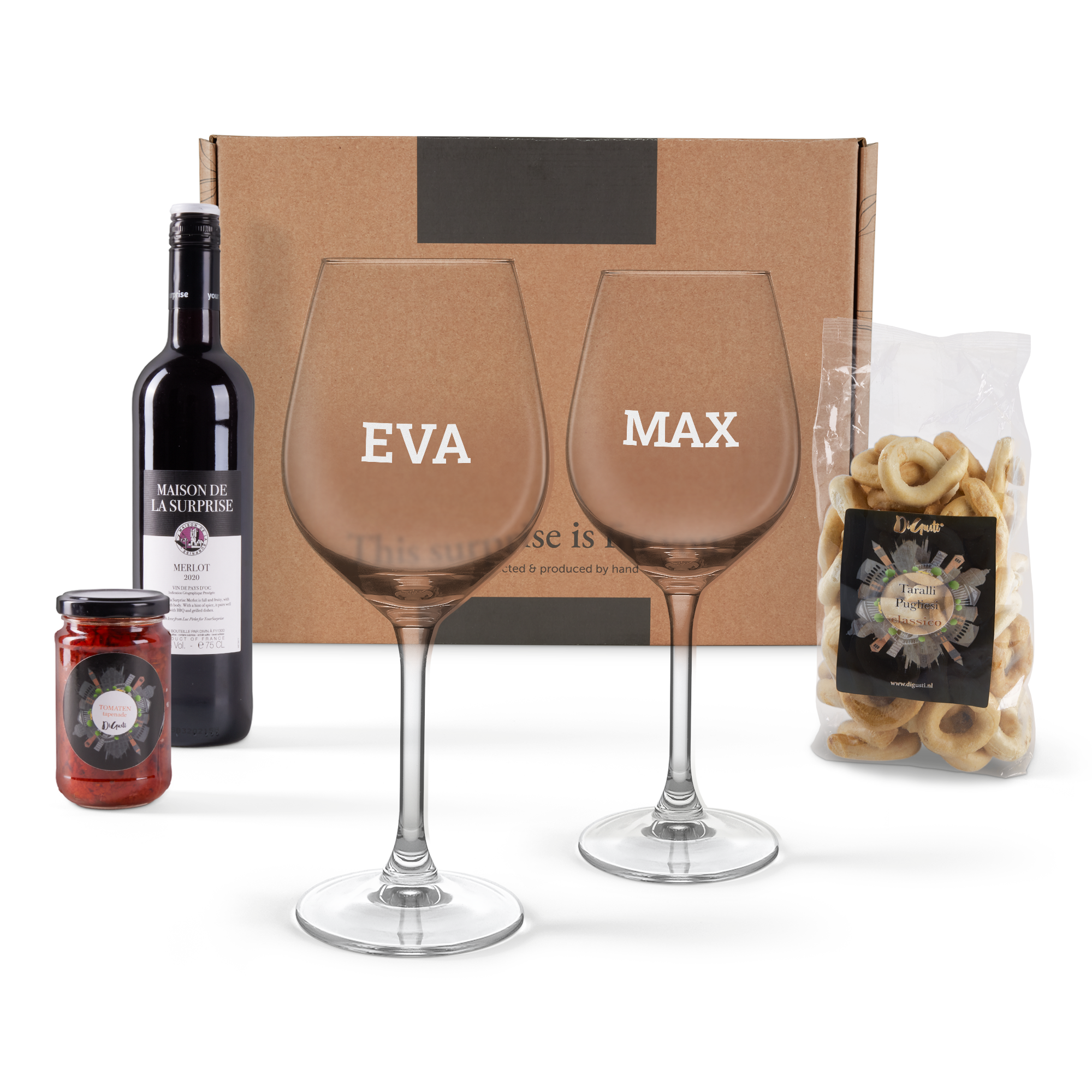 Czerwone wino Merlot, krakersy (350g), tapenada z pomidorów (212ml), dwa personalizowane kieliszki do wina.