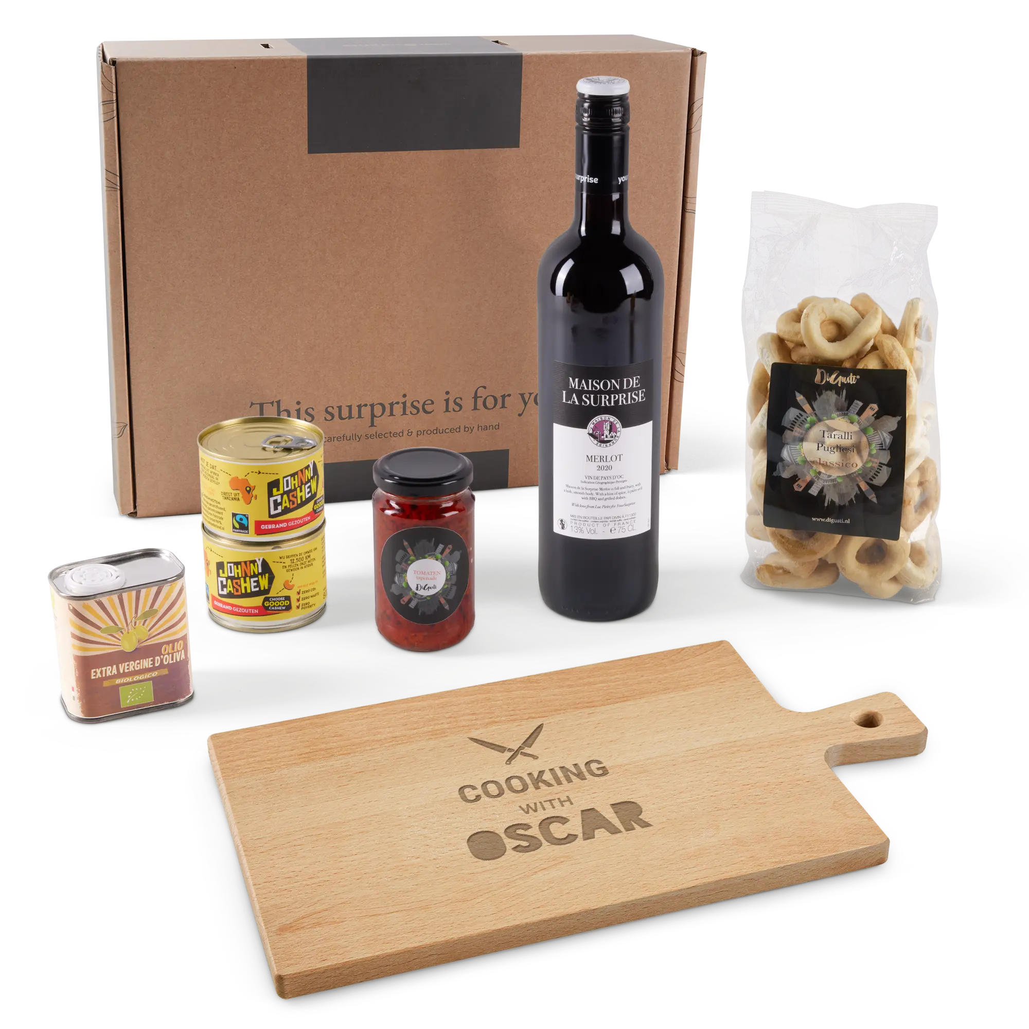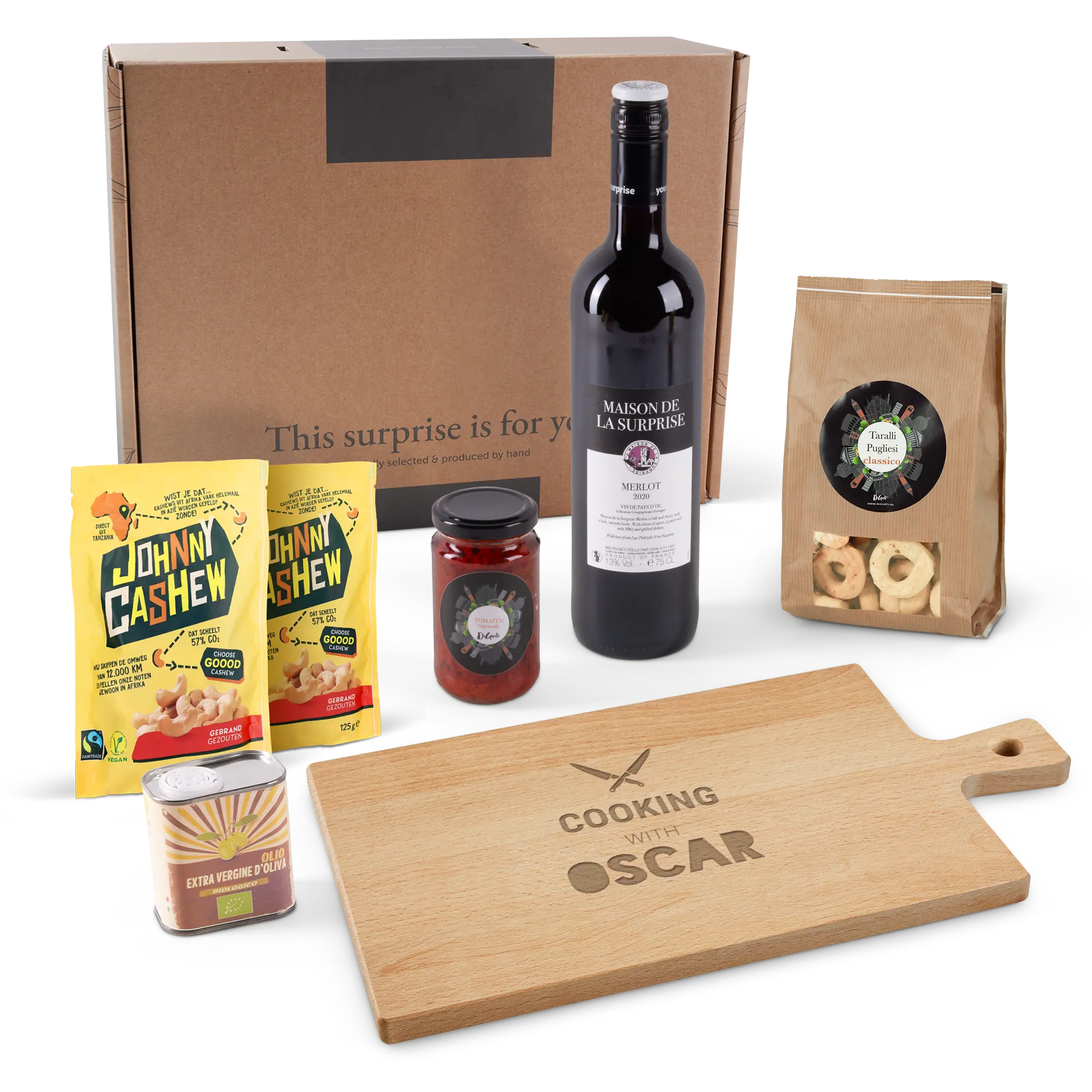 Grawerowany drewniany półmisek do serwowania czerwonego wina, orzechów, oliwy z oliwek i tapenady to idealny prezent.Więcej informacji na temat wina i Zestaw upominkowy z przekąskami:Zawiera: drewniany talerz do serwowania, oliwę z oliwek (100 ml), krakersy (350 gramów), tapenadę pomidorową (212 ml), orzechy nerkowca (2 x 80 gramów), butelkę wina Maison de la Surprise MerlotWymiary pudełka prezentowego: 39 x 30 x 11,5 cmWięcej informacji na temat drewnianego talerza do serwowania:Materiał: wysokiej jakości lite drewno bukowe z certyfikatem FSCWykończenie: olejowane i ze skórzanym paskiemWymiary: 36,5 x 20 x 1,5 cmPersonalizacja: grawerowanie tekstuKolor grawerunku: drewnoDodatkowe informacje:- nie nadaje się do mycia w zmywarce!- drewno jest produktem naturalnym, więc Twój prezent może nieznacznie różnić się od przykładu i zdjęcia podglądowego.Więcej informacji o winie:Marka: Maison de la Surprise MerlotRodzaj wina: czerwone, gładkie i owocowePojemność: 750 mlKraj pochodzenia: FrancjaOdmiana winogron: merlotCharakter: Maison de la Surprise Merlot ma intensywne nuty ciemnych owoców i odrobinę wanilii. Doskonałe do drobiu i pieczonego mięsa. Składniki: orzechy nerkowca, prażone i solone (Johnny Cashew): 96% orzechów nerkowca, 3% oleju słonecznikowego, 1% soli. Alergeny: zawiera orzechy nerkowca. Może zawierać śladowe ilości orzeszków ziemnych. Składniki: tapenada pomidorowa (DiGusti): suszone pomidory, olej słonecznikowy, sól, ocet (lonely brid), czosnek, aromaty. Składniki: krakersy (DiGusti): mąka typu ''0'', białe wino, olej słonecznikowy, oliwa z oliwek extra virgin, sól. Alergeny: zawiera zboża z glutenem i siarczynami. Może zawierać śladowe ilości nasion sezamu.