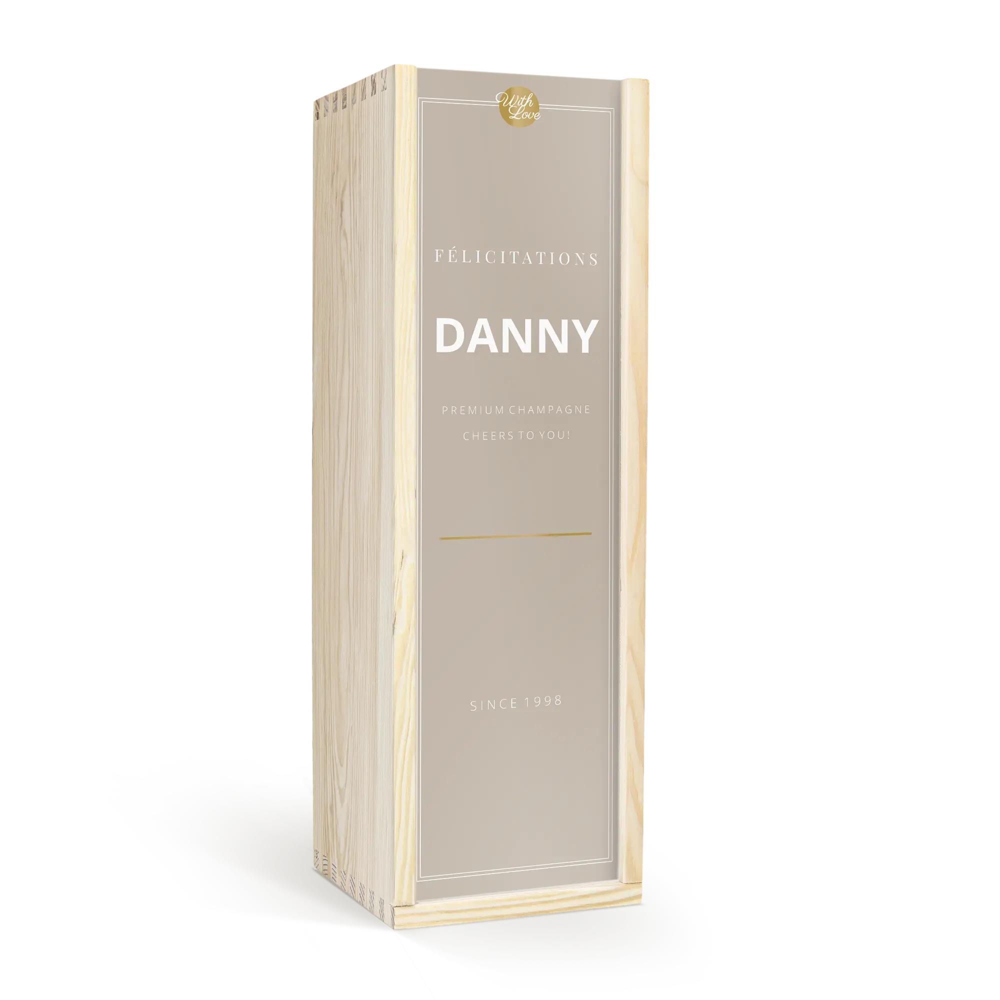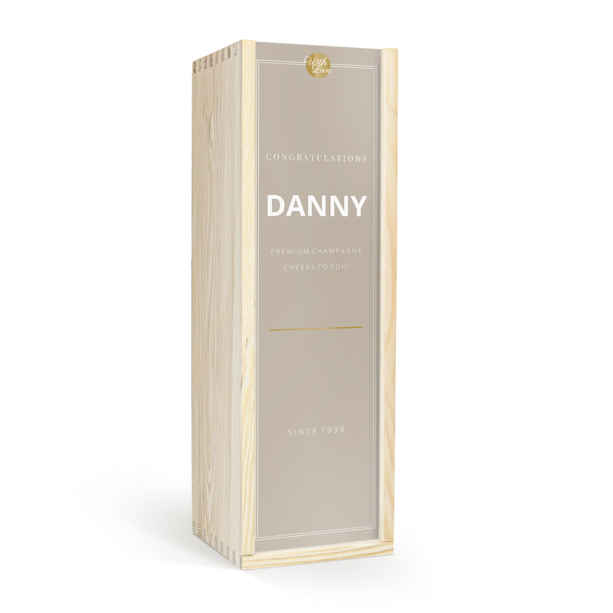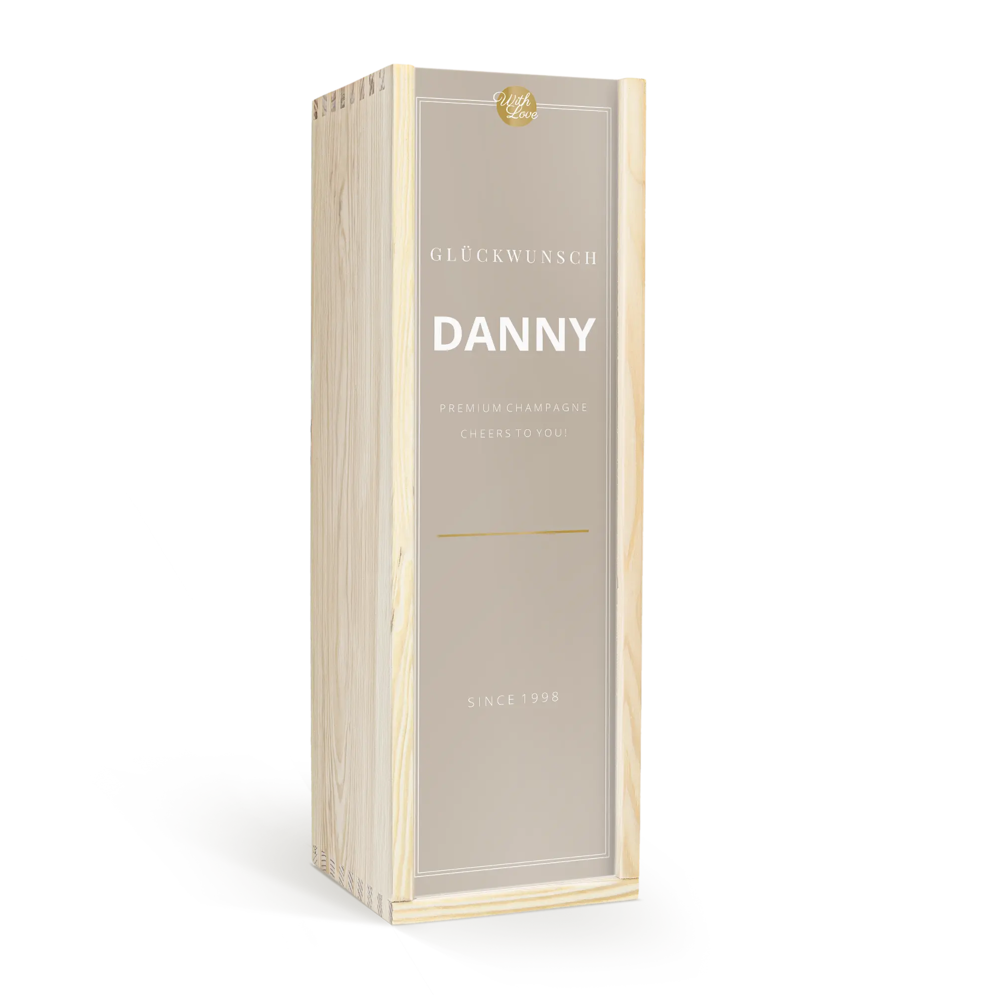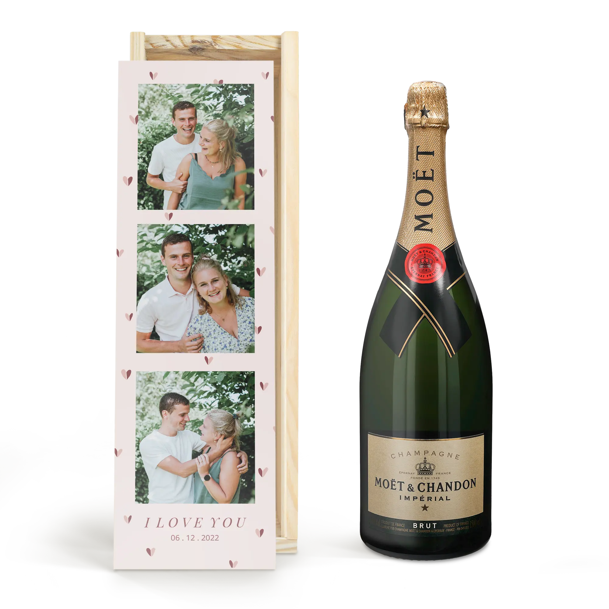 Pyszna butelka prawdziwego szampana Moët & Chandon w spersonalizowanej drewnianej skrzynce z Twoim imieniem lub tekstem. Dostępne różne rozmiary butelek!