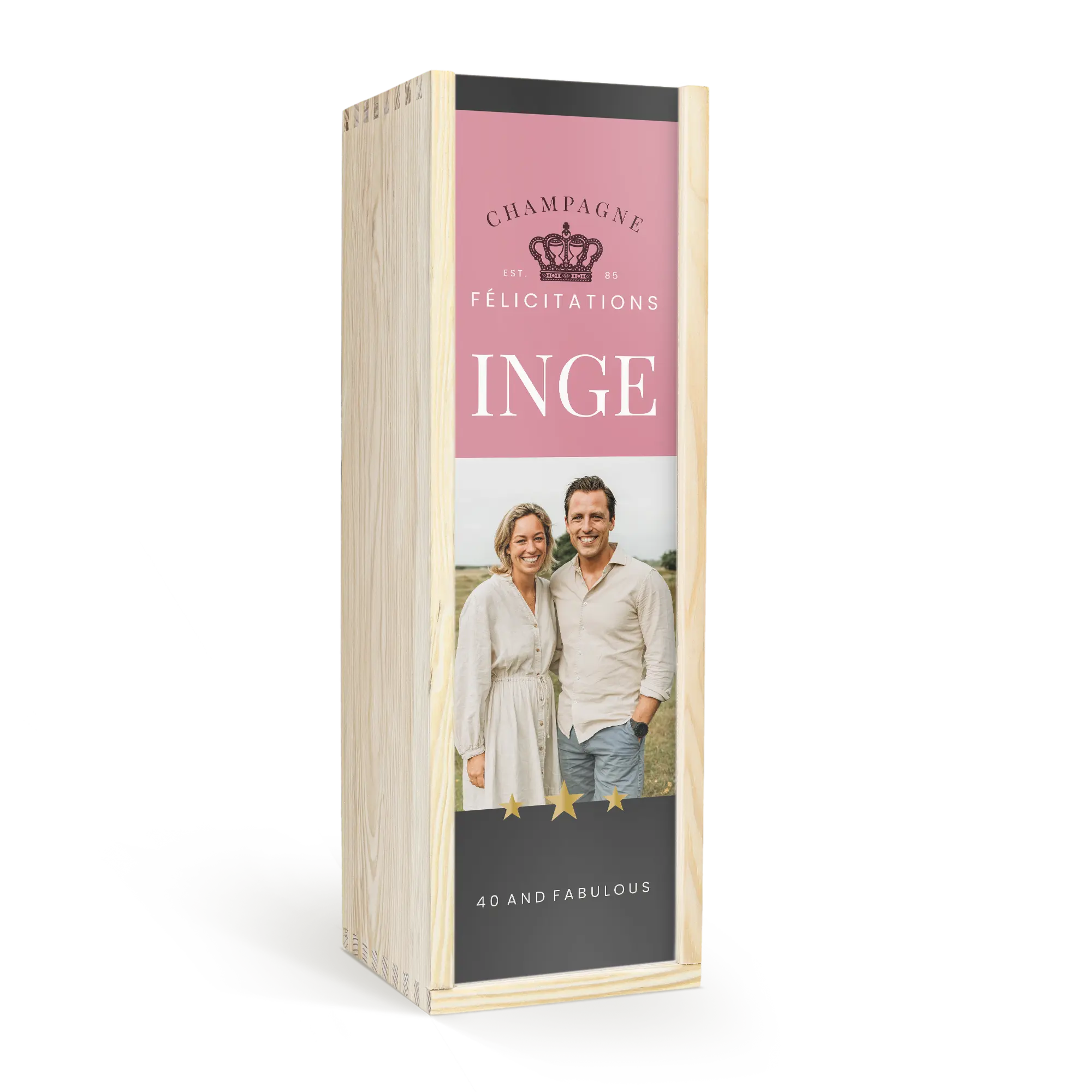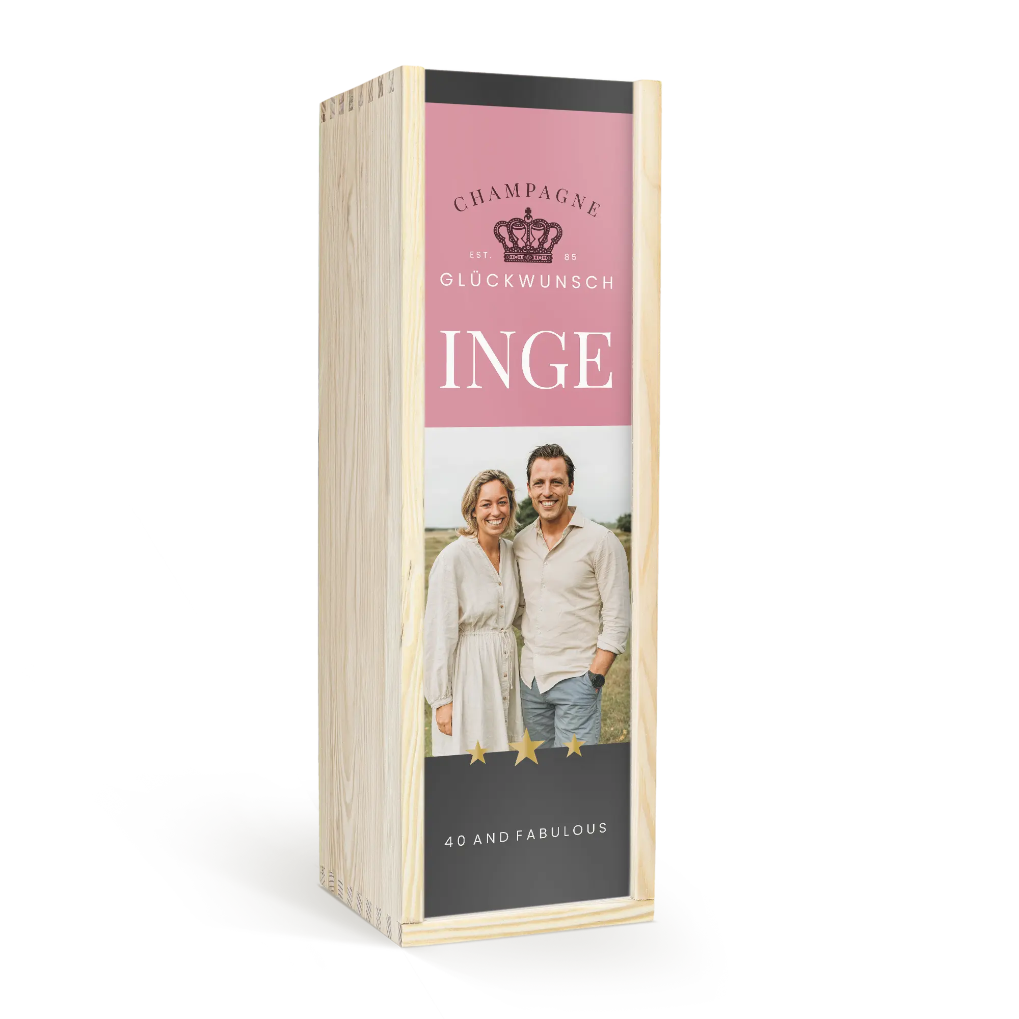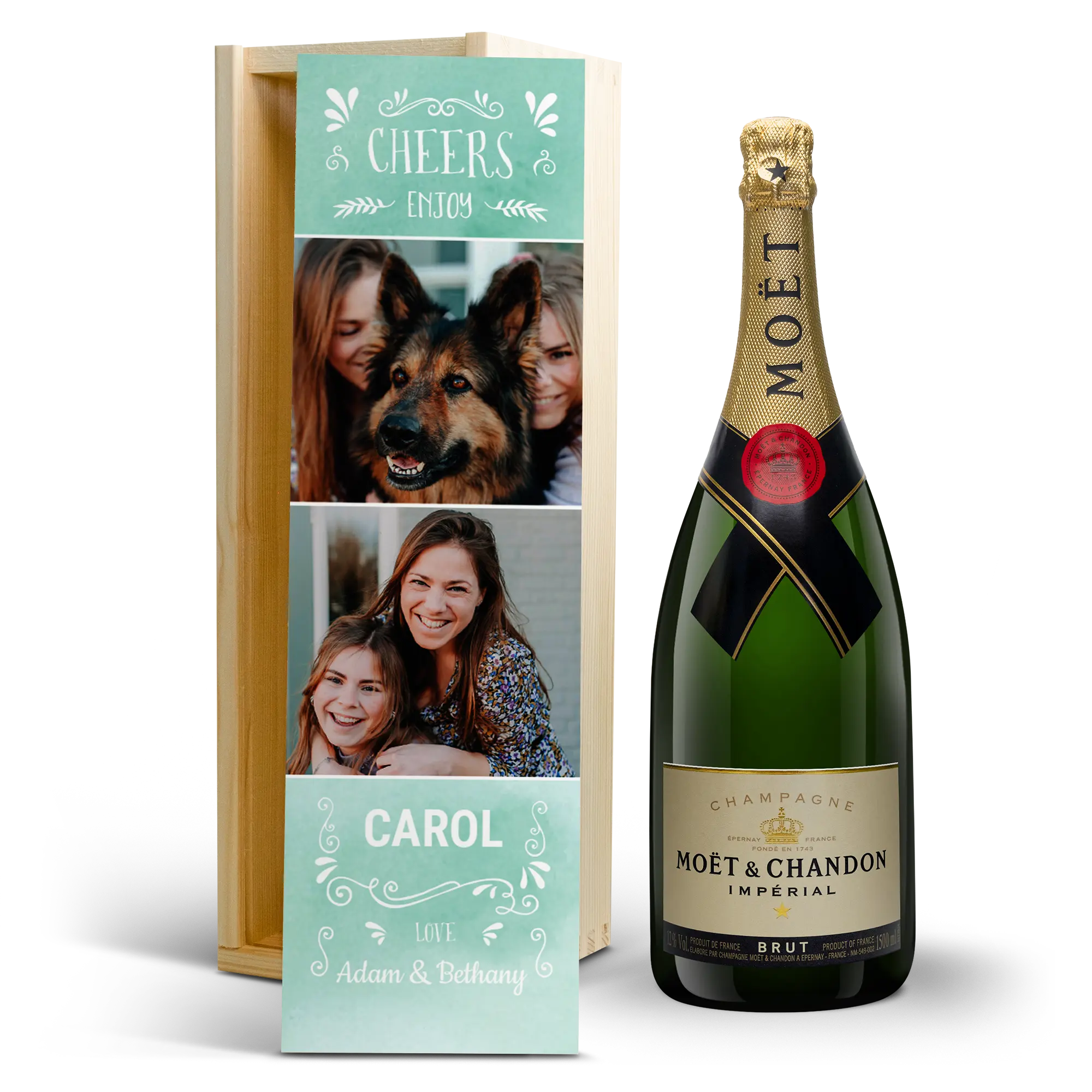 Pyszna butelka prawdziwego szampana Moët & Chandon w spersonalizowanej drewnianej skrzynce z Twoim imieniem lub tekstem. Dostępne różne rozmiary butelek!