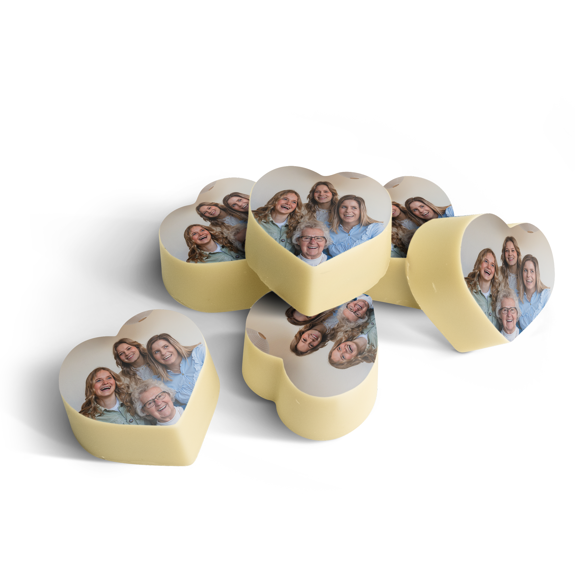 Zestaw 24 pralin w kształcie serca z mlecznej czekolady z możliwością personalizacji nadrukiem.