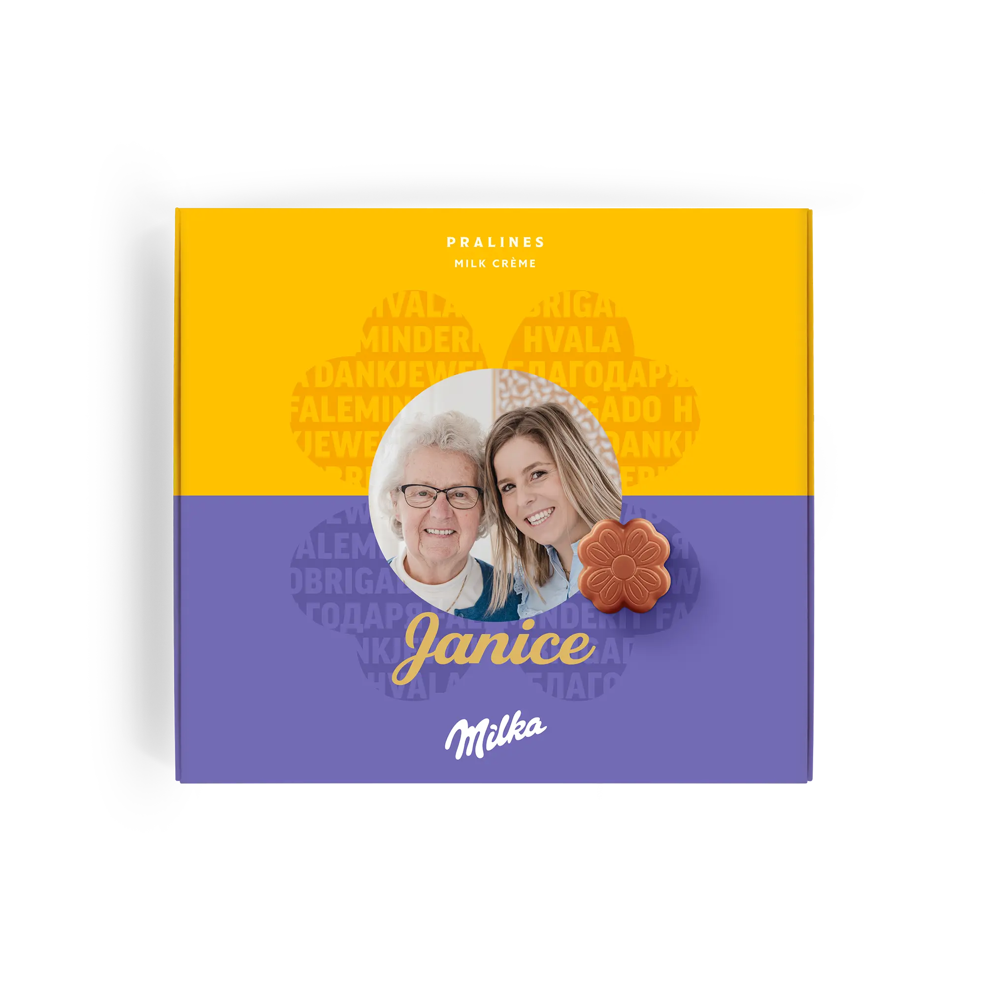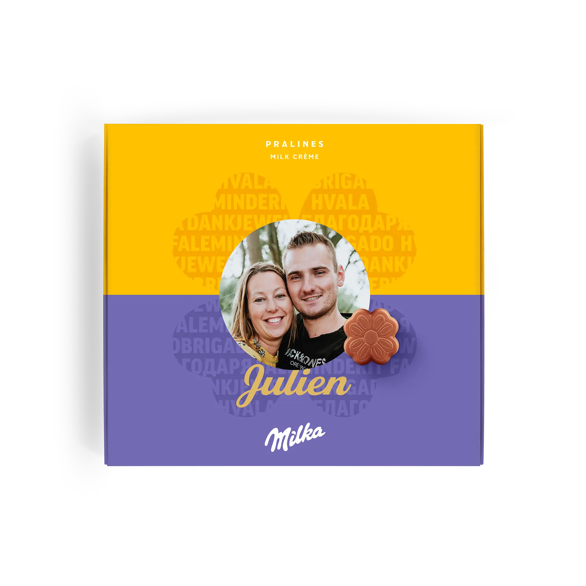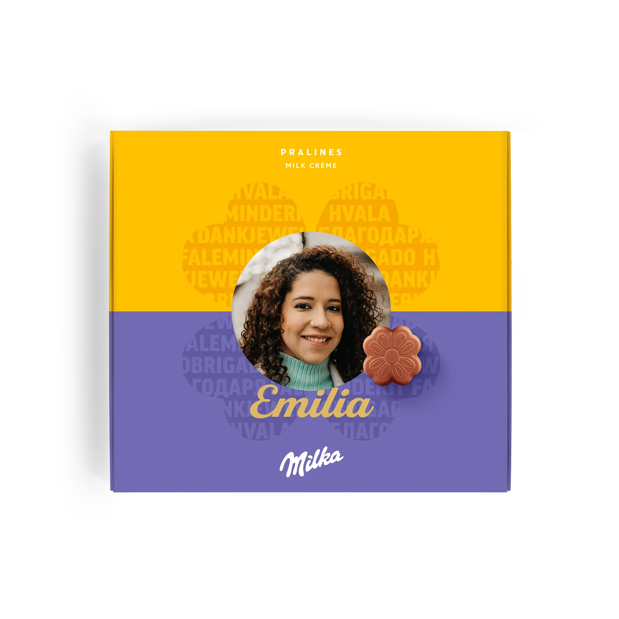 Spersonalizowane pudełko prezentowe „Powiedz to z Milką” to najpyszniejsze podziękowanie. Spersonalizowany czekoladowy upominek z imieniem, zdjęciem i wiadomością.Więcej informacji na temat podziękowania Milka:Czekolada: Alpejska czekolada mleczna z kremowym nadzieniemKształt praliny: kwiatyIlość pralin: 20Waga: 110 gramówWymiary: 19,50 x 18 x 2 cmPersonalizacja: zdjęcie, imię i osobista wiadomośćDruk: idealny i w pełnym kolorzeSkładniki: Cukier, olej palmowy, masło kakaowe, odtłuszczone mleko w proszku, serwatka (mleko) w proszku, miazga kakaowa, tłuszcz mleczny, emulgatory (lecytyna sojowa, E476), pasta z orzechów laskowych, aromaty. 7% odtłuszczonego mleka w proszku w nadzieniu z kremu mlecznego.Alergeny: Zawiera orzechy laskowe, mleko i soję. Może zawierać inne orzechy i gluten. Warto wiedzieć: Przy temperaturze zewnętrznej 25 stopni Celsjusza lub wyższej nie gwarantujemy jakości czekolady. W razie pytań dotyczących zamówień prosimy o kontakt z naszym działem obsługi klienta. Ze względów technicznych nie jest możliwe przetwarzanie znaków cyrylicy, tureckich, arabskich, azjatyckich ani znaków specjalnych.