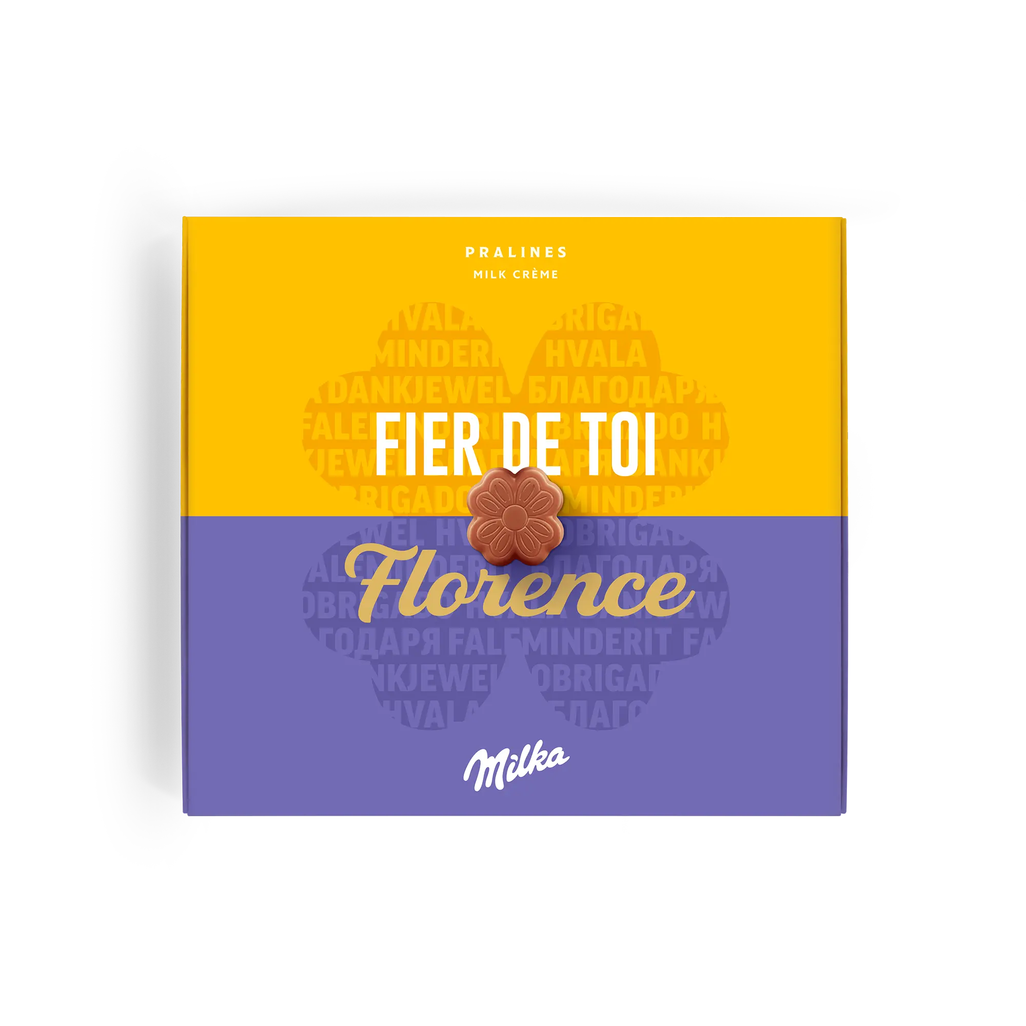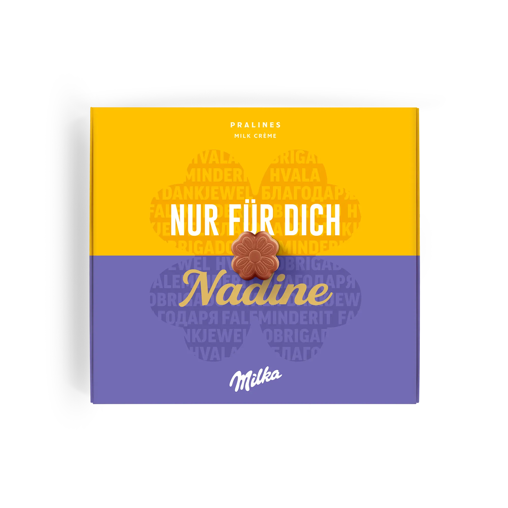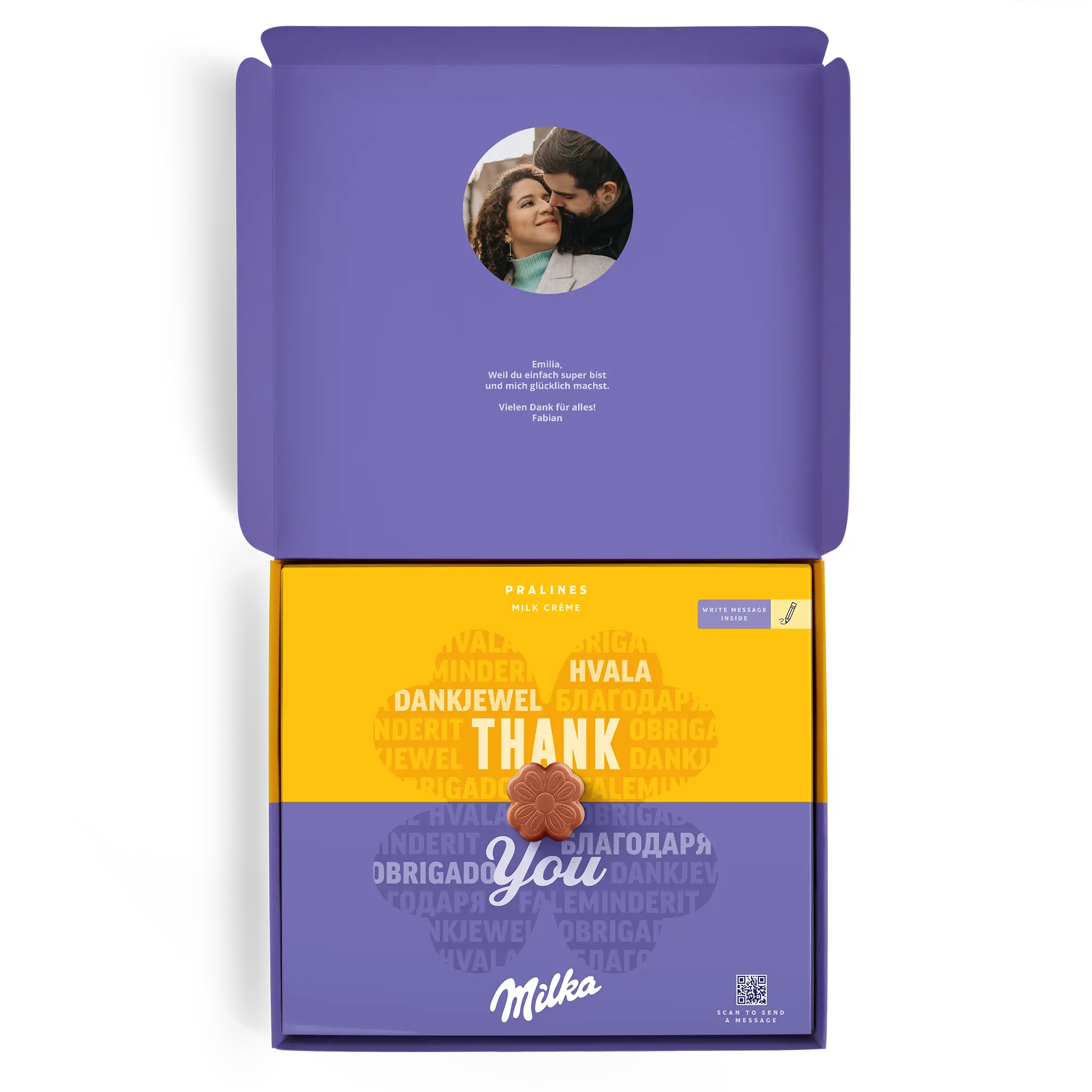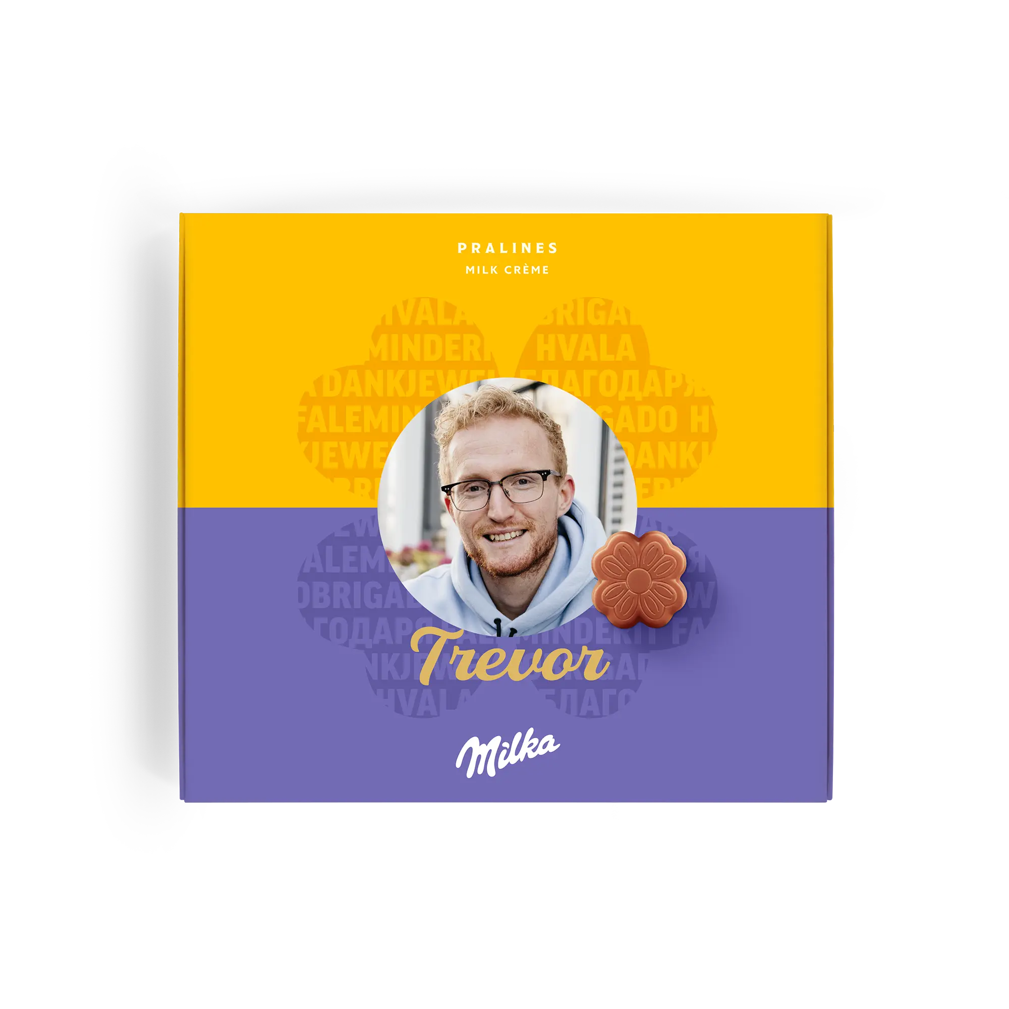 Spersonalizowane pudełko prezentowe „Powiedz to z Milką” to najpyszniejsze podziękowanie. Spersonalizowany czekoladowy upominek z imieniem, zdjęciem i wiadomością.Więcej informacji na temat podziękowania Milka:Czekolada: Alpejska czekolada mleczna z kremowym nadzieniemKształt praliny: kwiatyIlość pralin: 20Waga: 110 gramówWymiary: 19,50 x 18 x 2 cmPersonalizacja: zdjęcie, imię i osobista wiadomośćDruk: idealny i w pełnym kolorzeSkładniki: Cukier, olej palmowy, masło kakaowe, odtłuszczone mleko w proszku, serwatka (mleko) w proszku, miazga kakaowa, tłuszcz mleczny, emulgatory (lecytyna sojowa, E476), pasta z orzechów laskowych, aromaty. 7% odtłuszczonego mleka w proszku w nadzieniu z kremu mlecznego.Alergeny: Zawiera orzechy laskowe, mleko i soję. Może zawierać inne orzechy i gluten. Warto wiedzieć: Przy temperaturze zewnętrznej 25 stopni Celsjusza lub wyższej nie gwarantujemy jakości czekolady. W razie pytań dotyczących zamówień prosimy o kontakt z naszym działem obsługi klienta. Ze względów technicznych nie jest możliwe przetwarzanie znaków cyrylicy, tureckich, arabskich, azjatyckich ani znaków specjalnych.