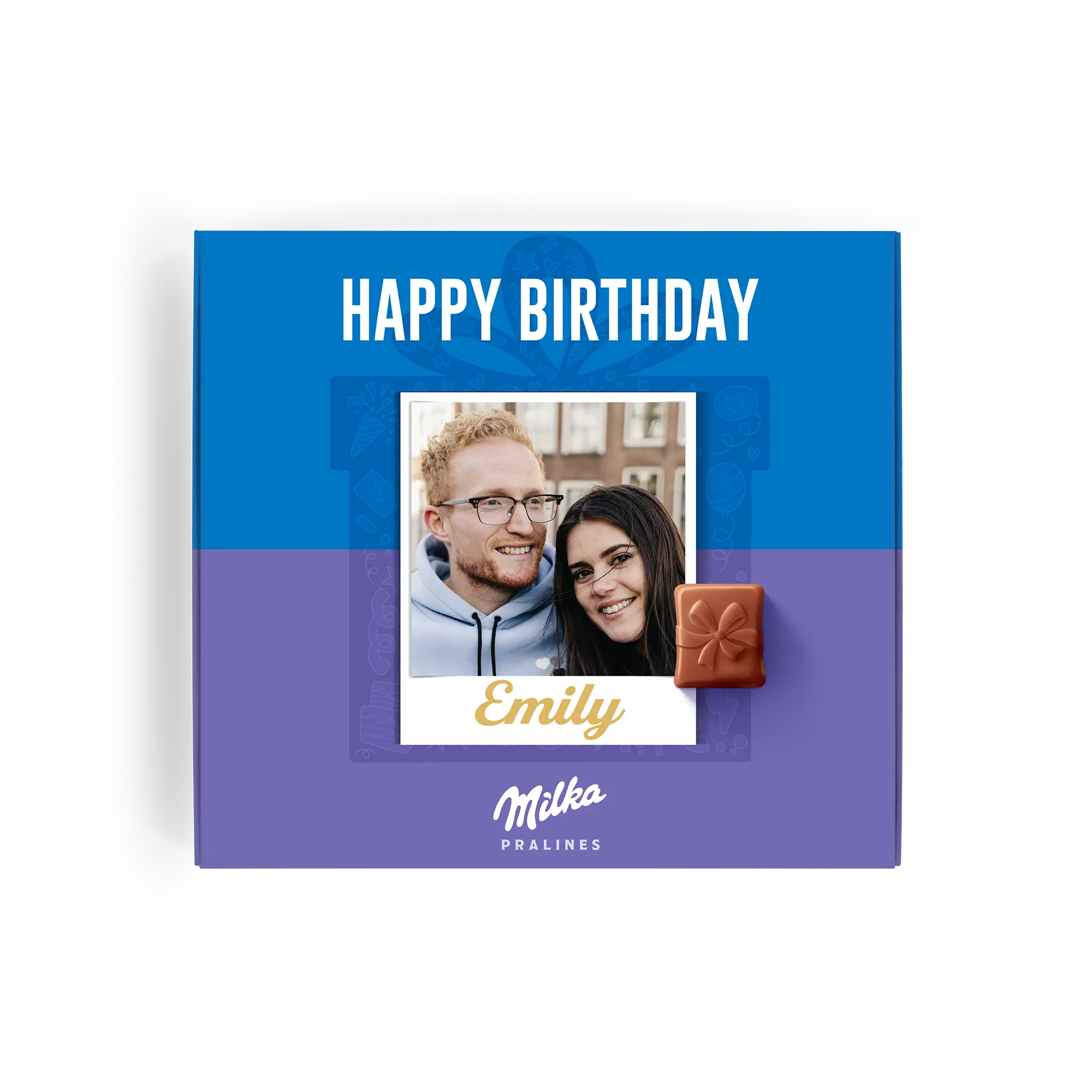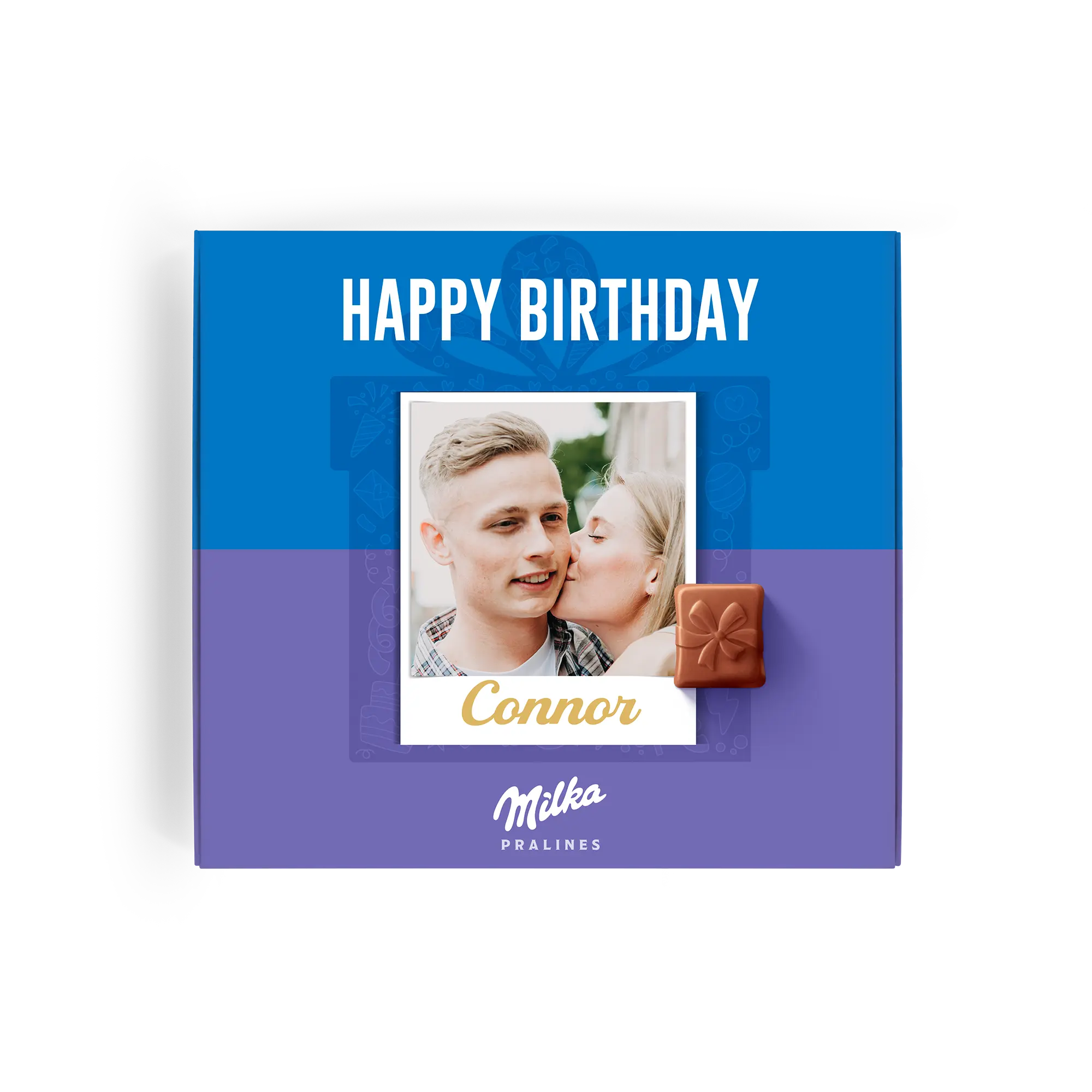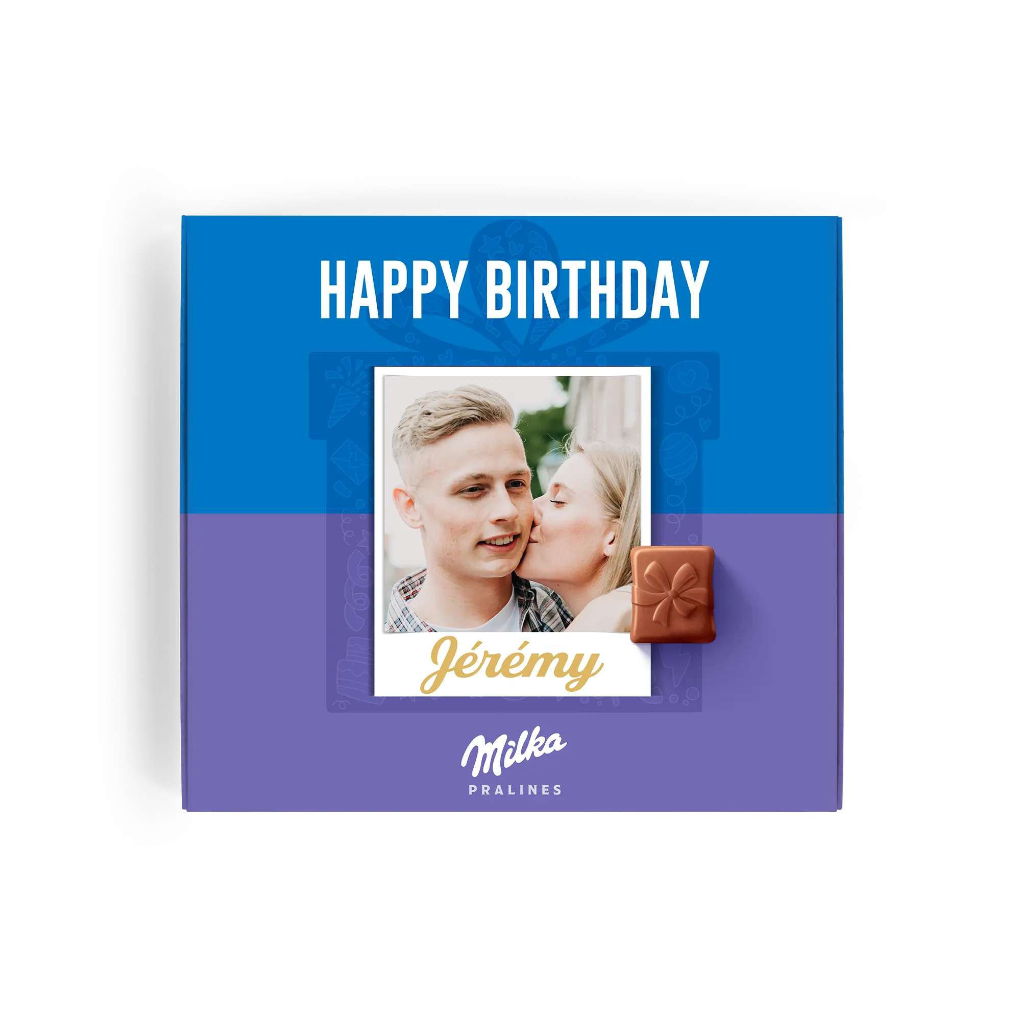 Spersonalizowane pudełko prezentowe z czekoladkami Milka „Wszystkiego najlepszego z okazji urodzin” ze zdjęciem, imieniem i osobistą wiadomością do wyboru!Więcej informacji na temat prezentu Milka:Czekolada: praliny z mlecznej czekolady z nadzieniem z kremu mlecznegoKształt praliny: prezentyLiczba pralin: 20Waga: 110 gramówWymiary: 19,5 x 18 x 2 cmPersonalizacja: zdjęcie, imię i osobista wiadomośćNadruk: idealny, w pełnym kolorzeUwaga: Nie gwarantujemy jakości czekolady, jeśli temperatura na zewnątrz wynosi 25 stopni Celsjusza lub więcej. W razie pytań dotyczących zamówień czekoladek prosimy o kontakt z naszym działem obsługi klienta. Ze względów technicznych nie obsługujemy znaków cyrylicy, tureckich, arabskich, azjatyckich ani znaków specjalnych. Składniki: Cukier, olej palmowy, masło kakaowe, odtłuszczone mleko w proszku, serwatka w proszku (z mleka), miazga kakaowa, tłuszcz mleczny, emulgatory (lecytyna sojowa, E476), pasta z orzechów laskowych, aromaty (zawierające mleko). 7% odtłuszczonego mleka w proszku w nadzieniu z kremu mlecznego. Alergeny: Zawiera orzechy laskowe, mleko i soję. Może zawierać (śladowe ilości) innych orzechów.