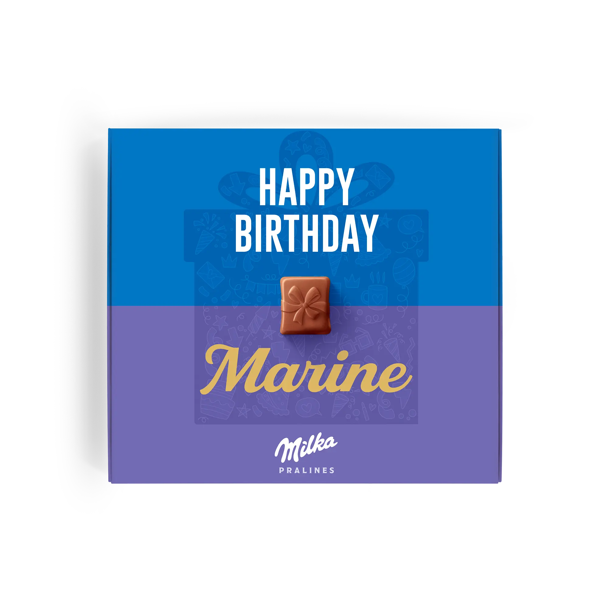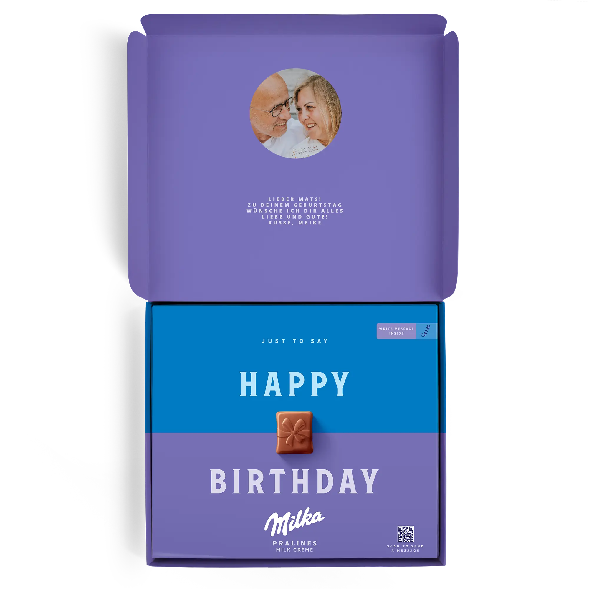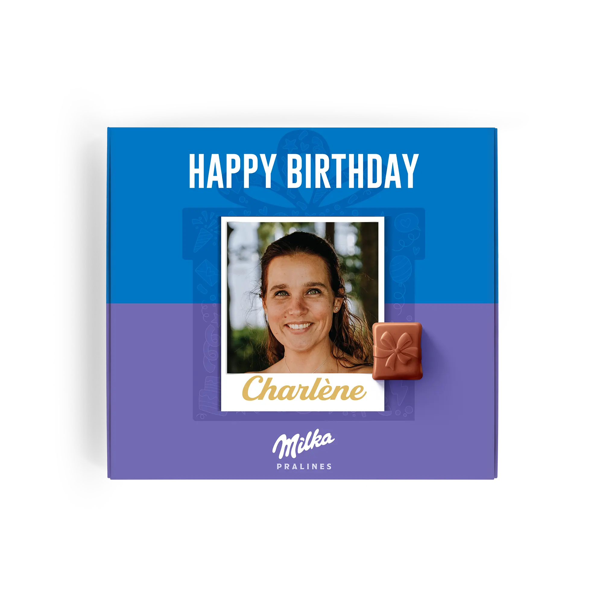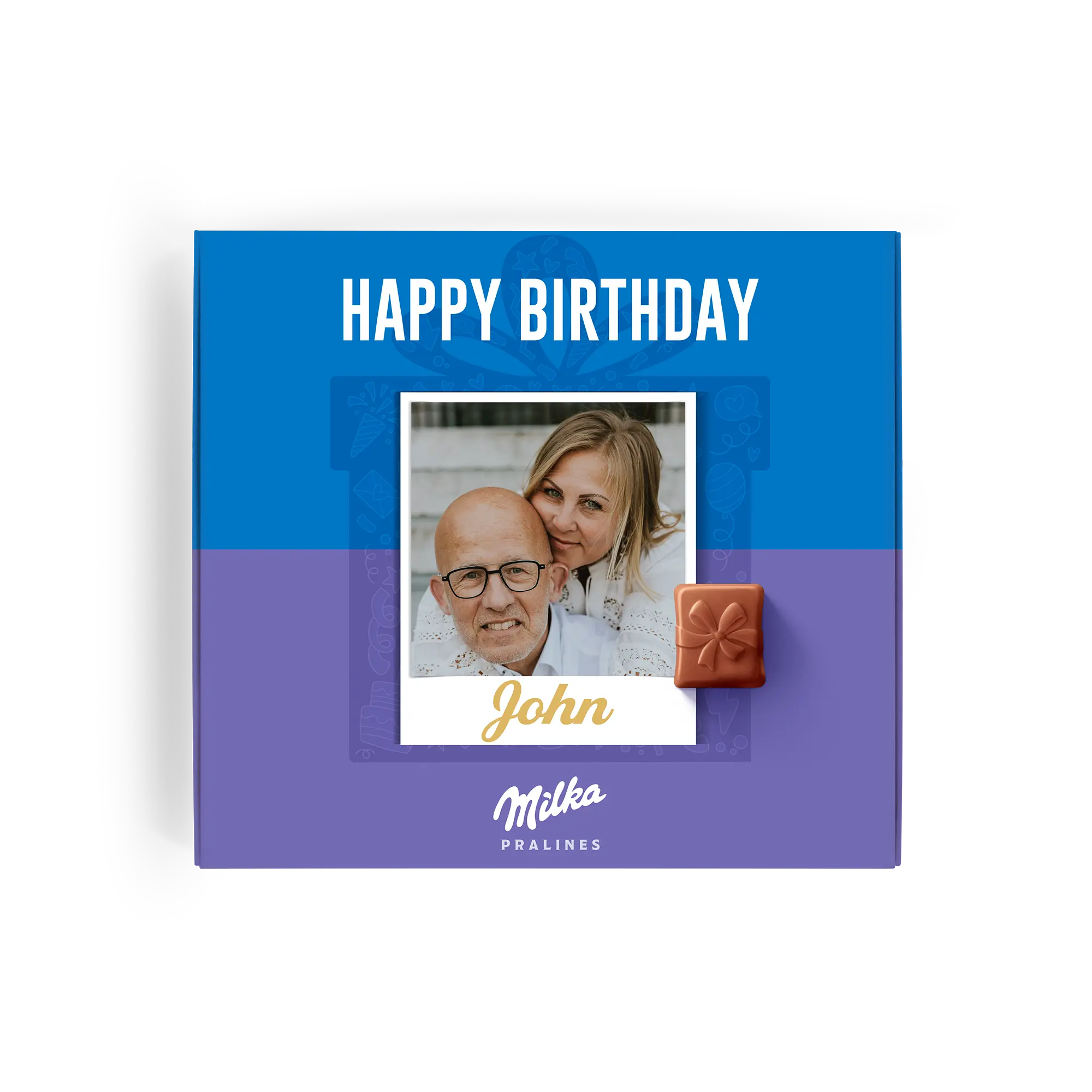 Spersonalizowane pudełko prezentowe z czekoladkami Milka „Wszystkiego najlepszego z okazji urodzin” ze zdjęciem, imieniem i osobistą wiadomością do wyboru!Więcej informacji na temat prezentu Milka:Czekolada: praliny z mlecznej czekolady z nadzieniem z kremu mlecznegoKształt praliny: prezentyLiczba pralin: 20Waga: 110 gramówWymiary: 19,5 x 18 x 2 cmPersonalizacja: zdjęcie, imię i osobista wiadomośćNadruk: idealny, w pełnym kolorzeUwaga: Nie gwarantujemy jakości czekolady, jeśli temperatura na zewnątrz wynosi 25 stopni Celsjusza lub więcej. W razie pytań dotyczących zamówień czekoladek prosimy o kontakt z naszym działem obsługi klienta. Ze względów technicznych nie obsługujemy znaków cyrylicy, tureckich, arabskich, azjatyckich ani znaków specjalnych. Składniki: Cukier, olej palmowy, masło kakaowe, odtłuszczone mleko w proszku, serwatka w proszku (z mleka), miazga kakaowa, tłuszcz mleczny, emulgatory (lecytyna sojowa, E476), pasta z orzechów laskowych, aromaty (zawierające mleko). 7% odtłuszczonego mleka w proszku w nadzieniu z kremu mlecznego. Alergeny: Zawiera orzechy laskowe, mleko i soję. Może zawierać (śladowe ilości) innych orzechów.