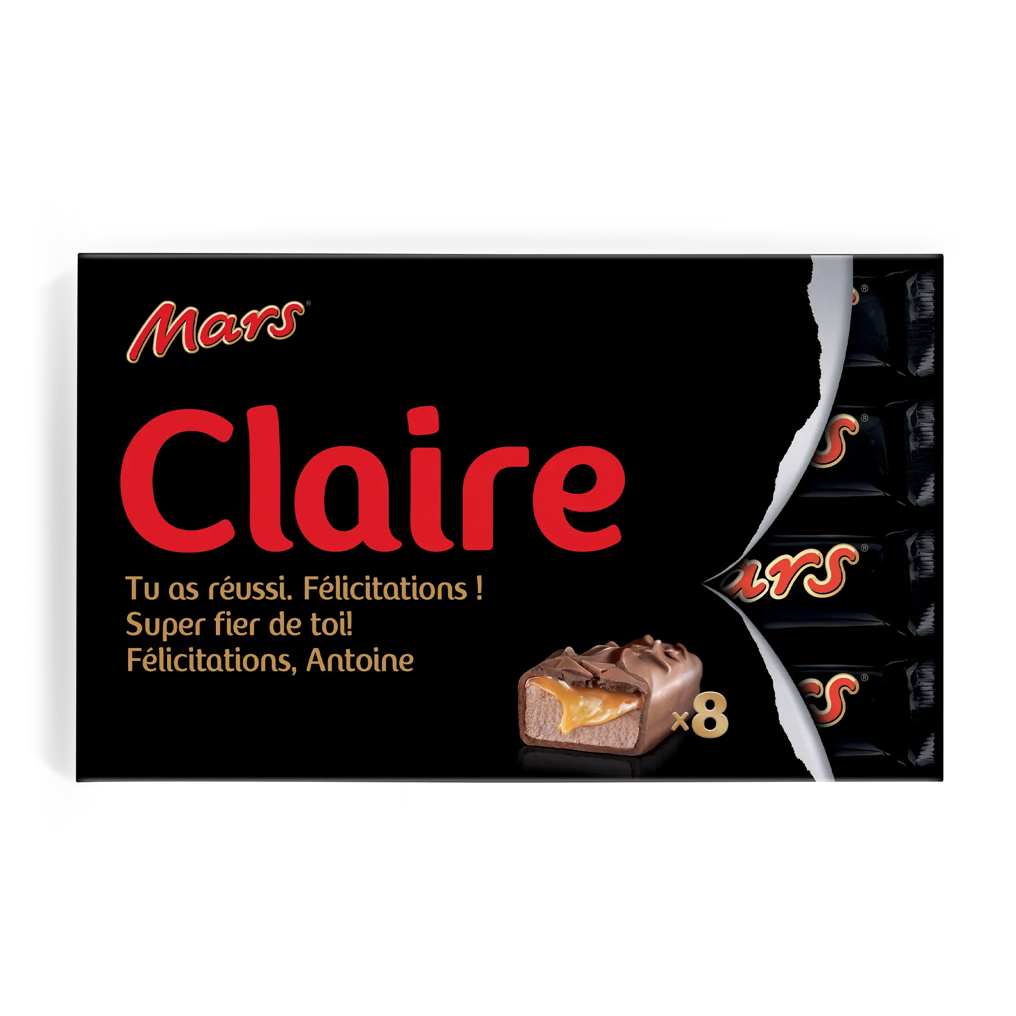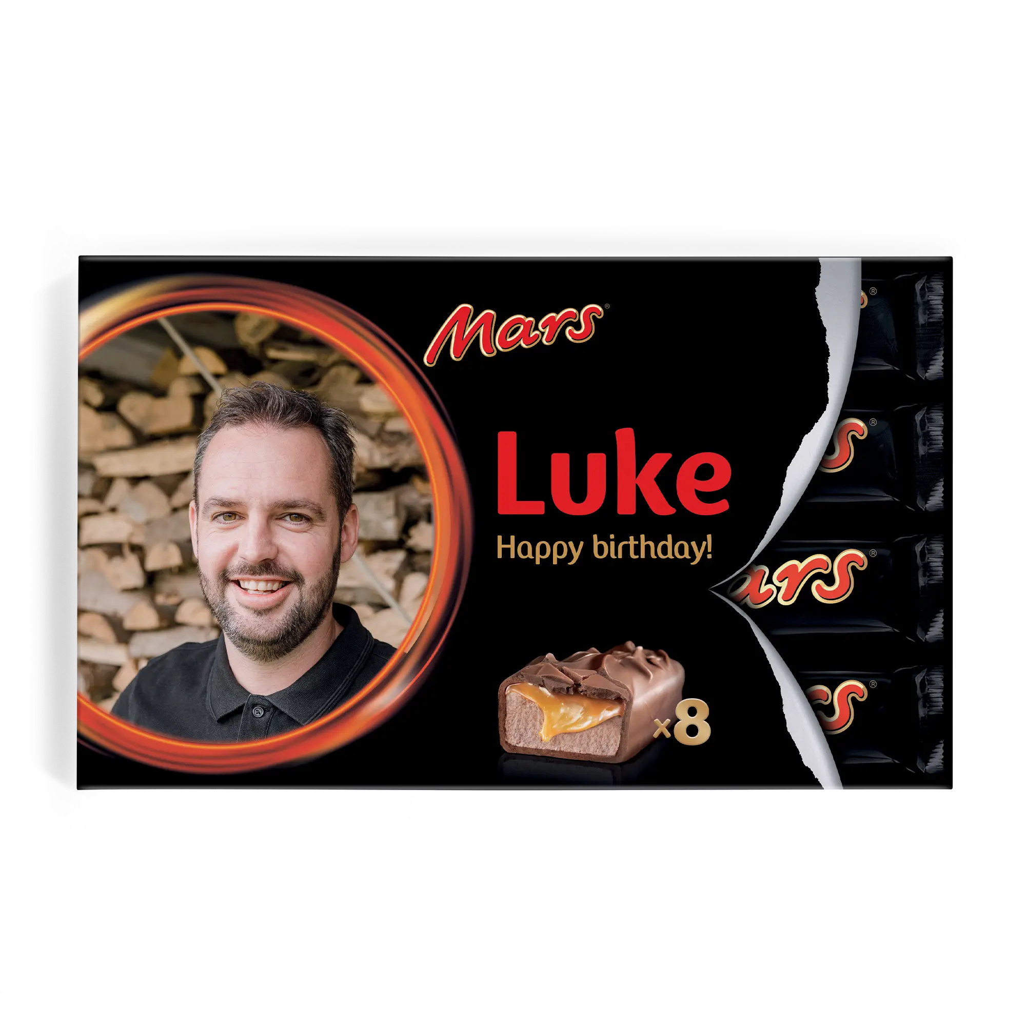 Spersonalizowane pudełko prezentowe Mars ze zdjęciem, imieniem i/lub osobistym napisem do wyboru – idealne dla miłośników czekolady!Więcej informacji o pudełku prezentowym Mars: Wymiary: 24,2 x 14,5 x 2,4 cm Waga: 8 x 51 gramów Personalizacja: imieniem, zdjęciem i/lub tekstem Nadruk: perfekcyjny i pełnokolorowy Składniki: Cukier, syrop glukozowy, pełne MLEKO w proszku, masło kakaowe, miazga kakaowa, olej słonecznikowy, odtłuszczone MLEKO w proszku, LAKTOZA, permeat serwatkowy, odtłuszczone kakao, ekstrakt słodowy JĘCZMIENNY, tłuszcz maślany MLECZNY, emulgator (lecytyna SOJOWA), sól, proszek drobiowy, EGG CLARA, tłuszcz palmowy, skrobia. Alergeny: może zawierać orzechy laskowe, orzeszki ziemne i inne orzechy.