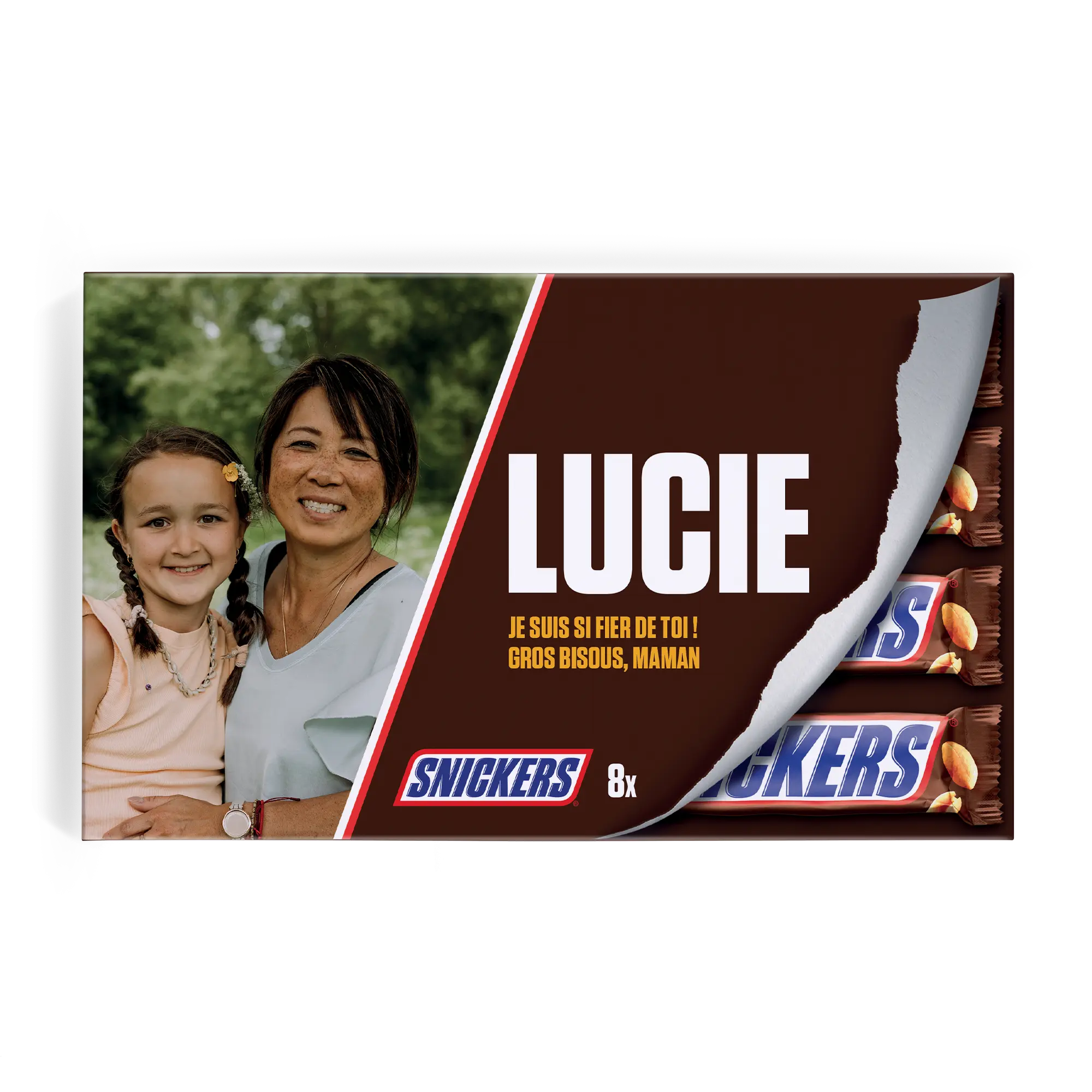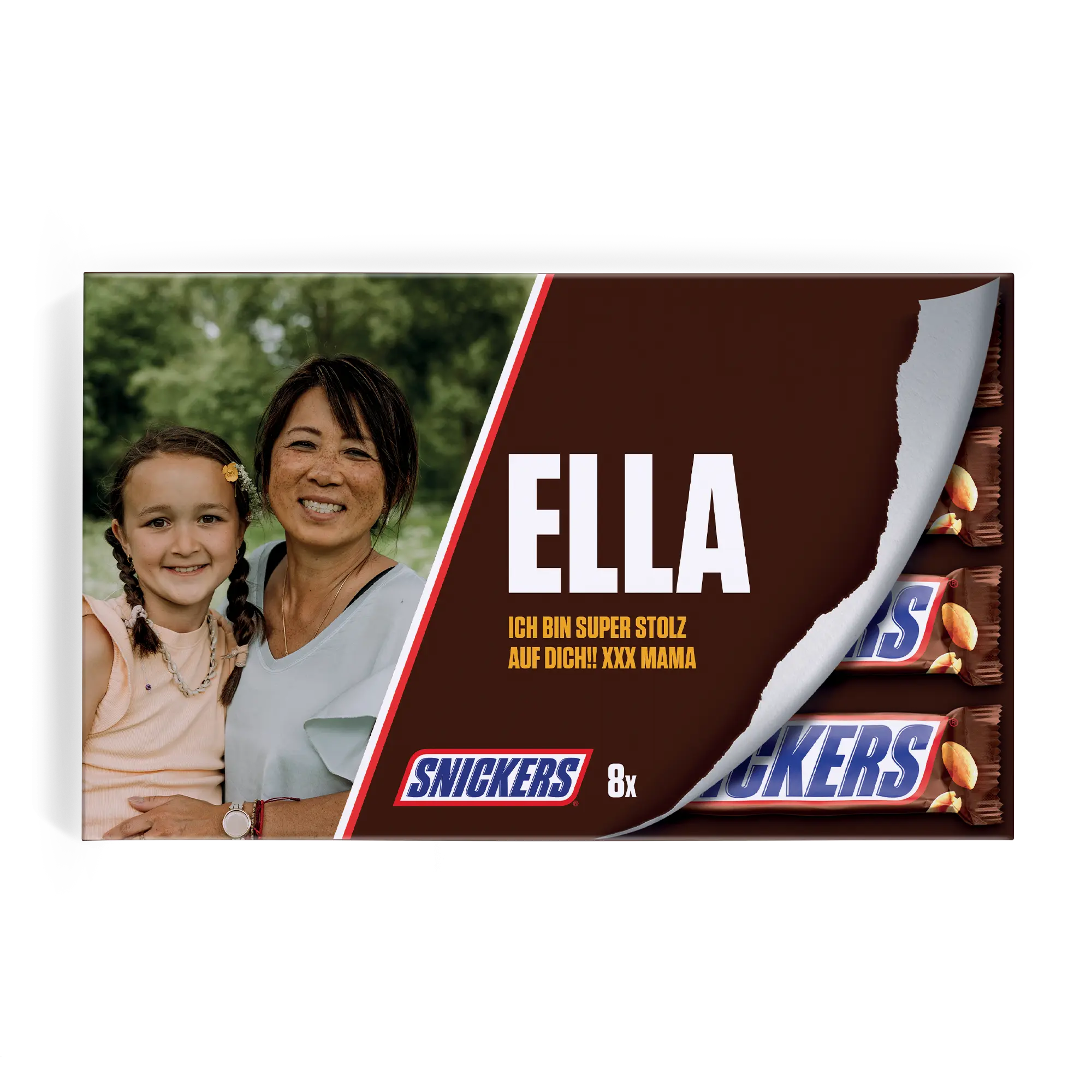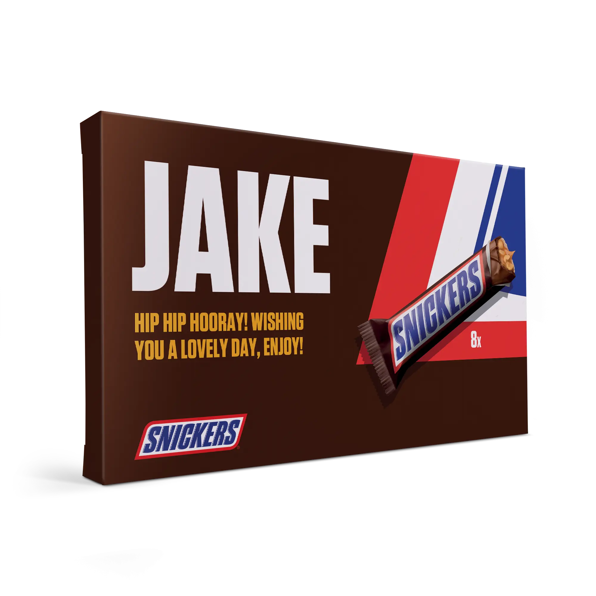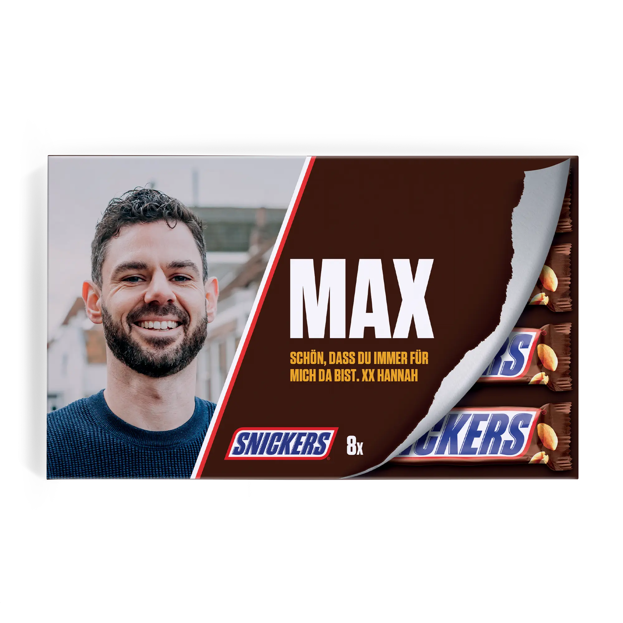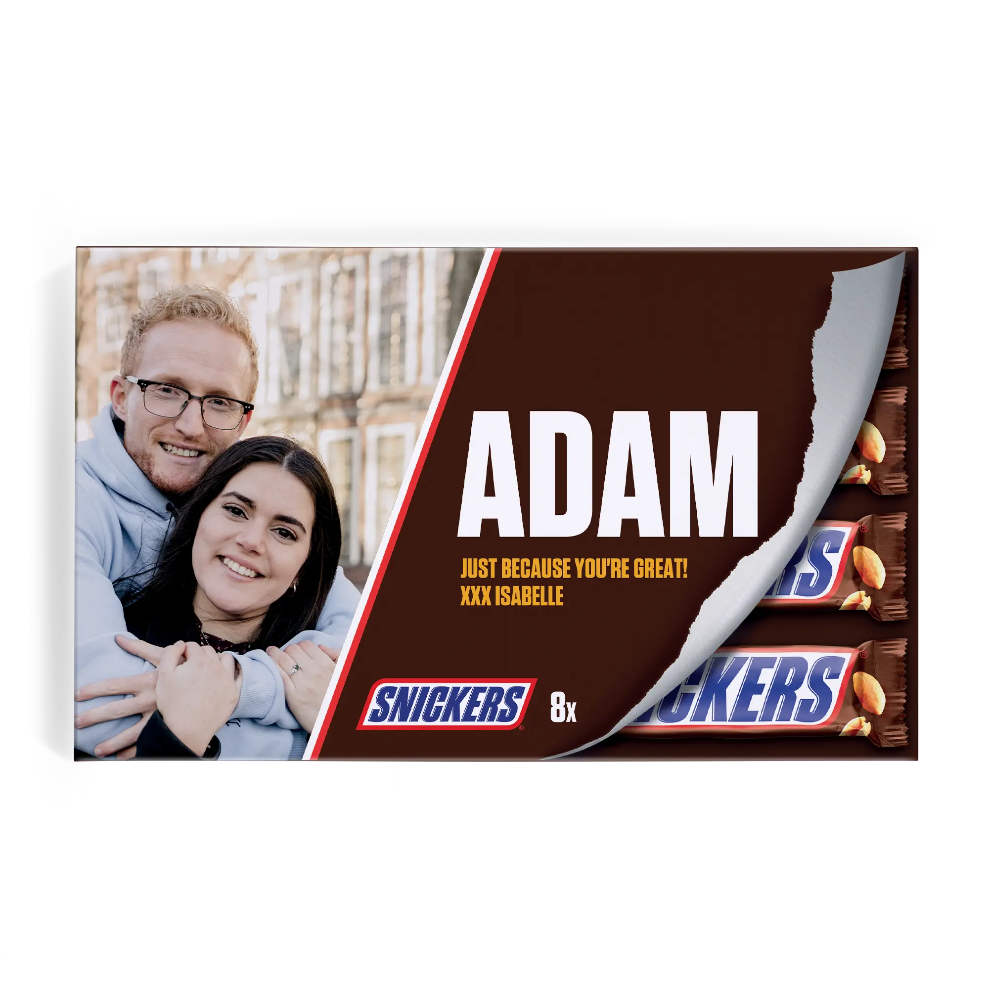 Spersonalizowane pudełko prezentowe Snickers ze zdjęciem, imieniem i/lub osobistym napisem do wyboru – idealne dla miłośników czekolady!Więcej informacji o pudełku prezentowym Snickers: Wymiary: 24,2 x 14,5 x 2,4 cm Waga: 8 x 50 gramów Personalizacja: imieniem, zdjęciem i/lub tekstem Nadruk: perfekcyjny i pełnokolorowy Składniki: Cukier, syrop glukozowy, orzeszki ziemne, odtłuszczone MLEKO w proszku, masło kakaowe, miazga kakaowa, laktoza, olej słonecznikowy, tłuszcz mleczny, serwatka w proszku, tłuszcz palmowy, sól, emulgator (lecytyna sojowa), proszek z białek jaj kurzych, hydrolizowany olej kokosowy, białko mleka, naturalny ekstrakt waniliowy. Alergeny: może zawierać orzechy laskowe