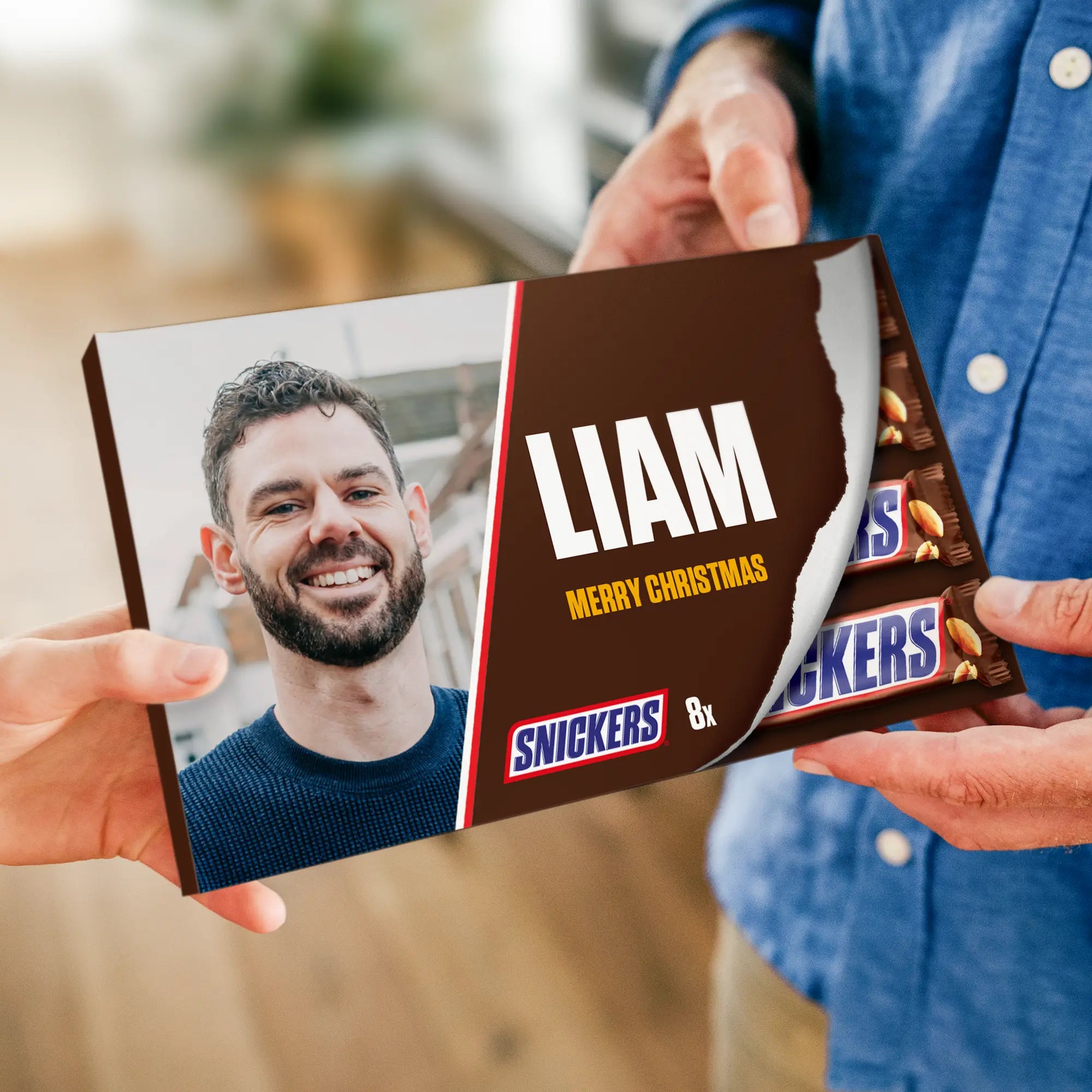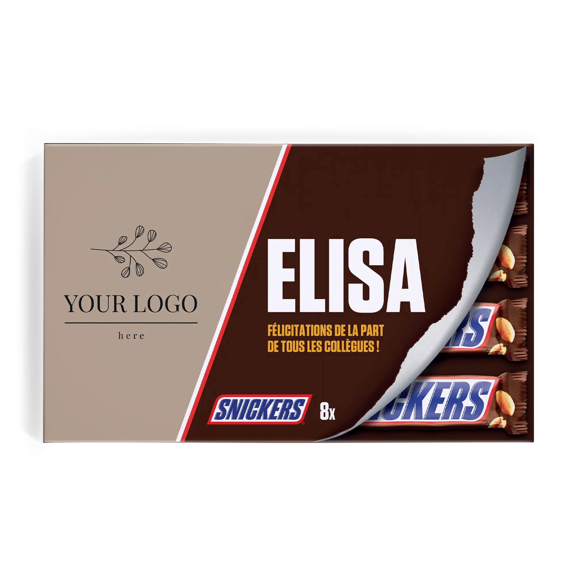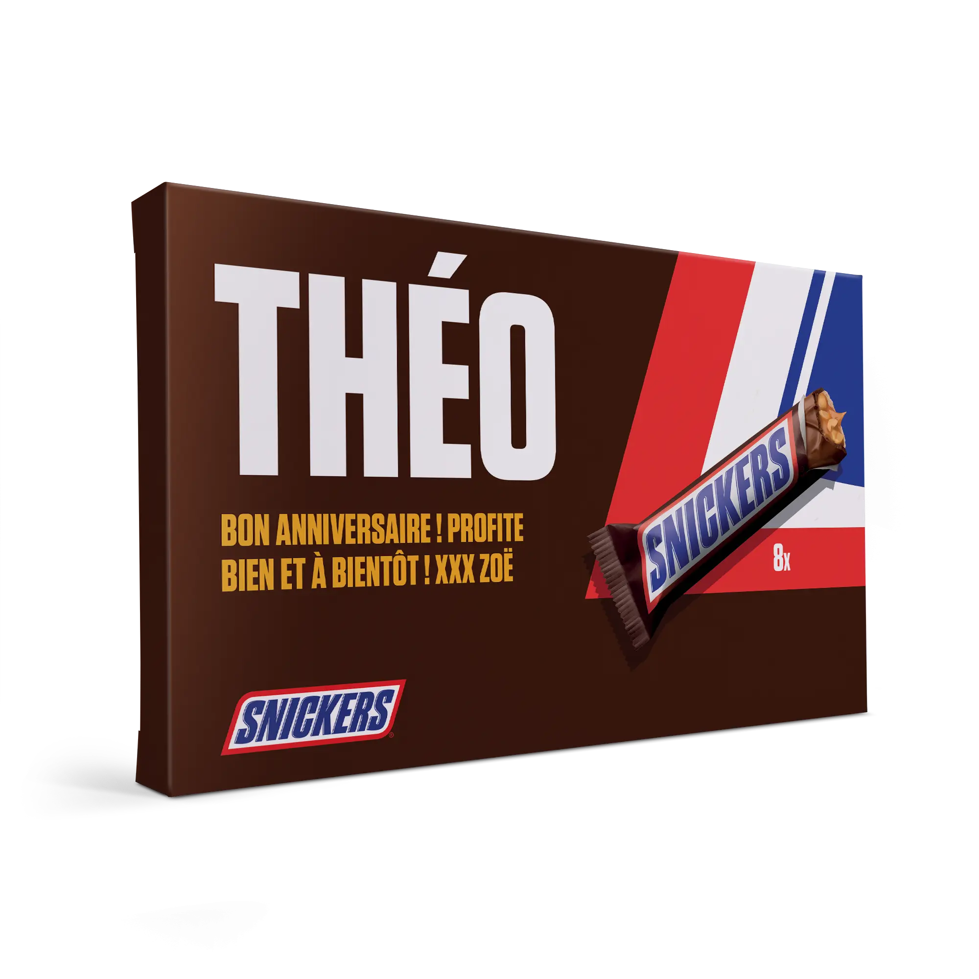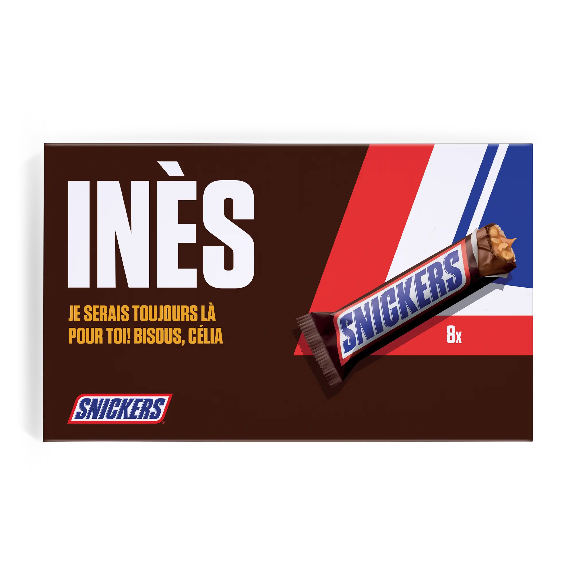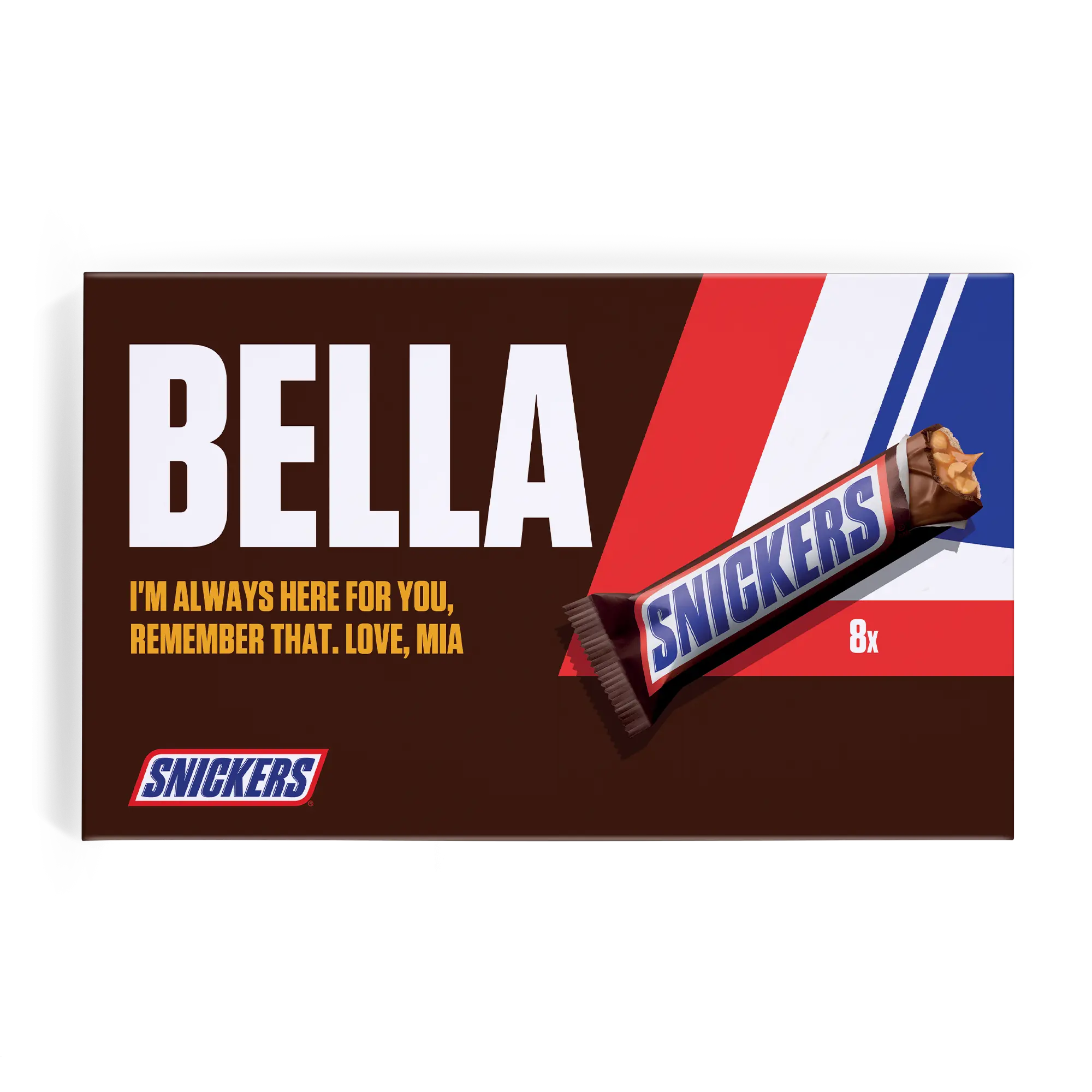 Spersonalizowane pudełko prezentowe Snickers ze zdjęciem, imieniem i/lub osobistym napisem do wyboru – idealne dla miłośników czekolady!Więcej informacji o pudełku prezentowym Snickers: Wymiary: 24,2 x 14,5 x 2,4 cm Waga: 8 x 50 gramów Personalizacja: imieniem, zdjęciem i/lub tekstem Nadruk: perfekcyjny i pełnokolorowy Składniki: Cukier, syrop glukozowy, orzeszki ziemne, odtłuszczone MLEKO w proszku, masło kakaowe, miazga kakaowa, laktoza, olej słonecznikowy, tłuszcz mleczny, serwatka w proszku, tłuszcz palmowy, sól, emulgator (lecytyna sojowa), proszek z białek jaj kurzych, hydrolizowany olej kokosowy, białko mleka, naturalny ekstrakt waniliowy. Alergeny: może zawierać orzechy laskowe