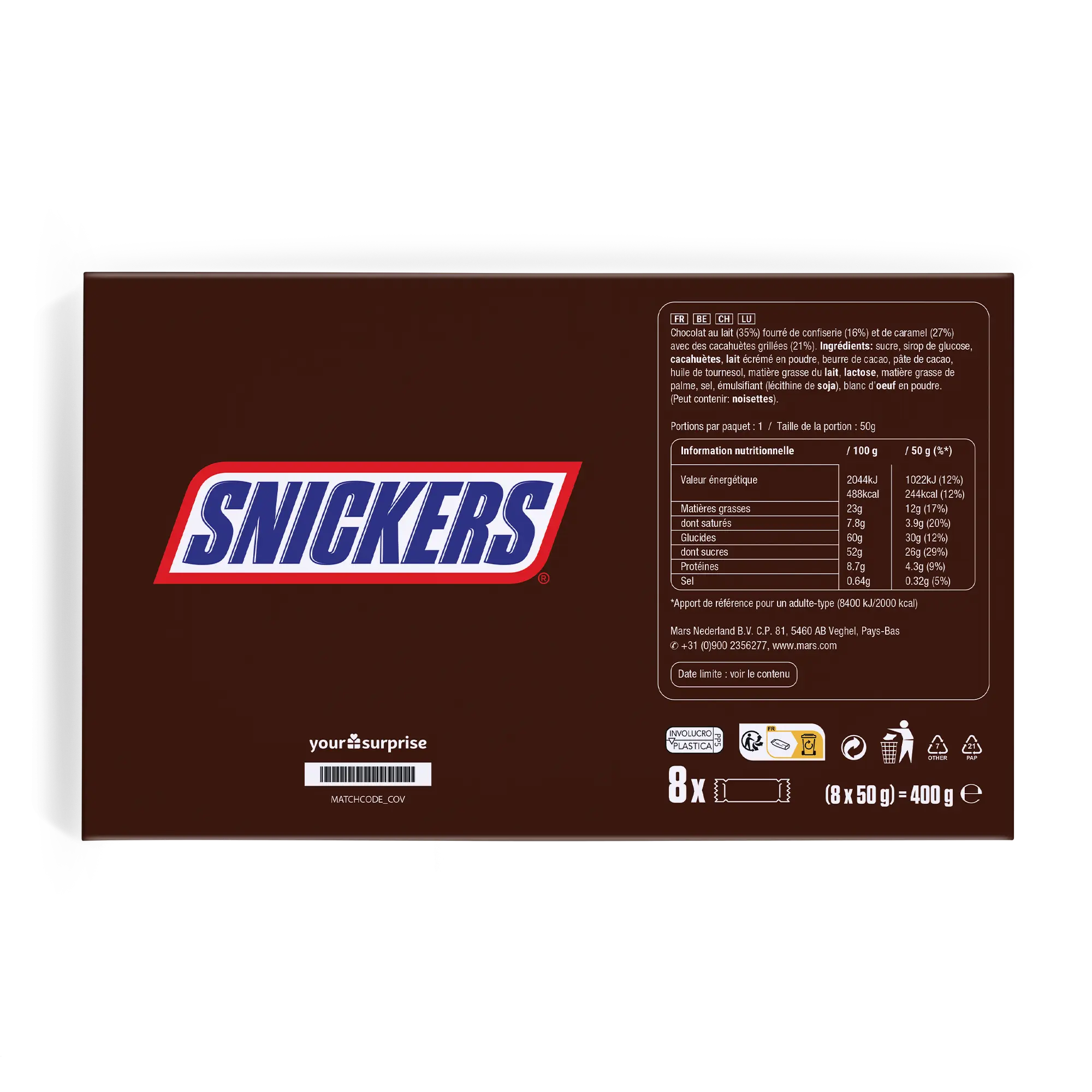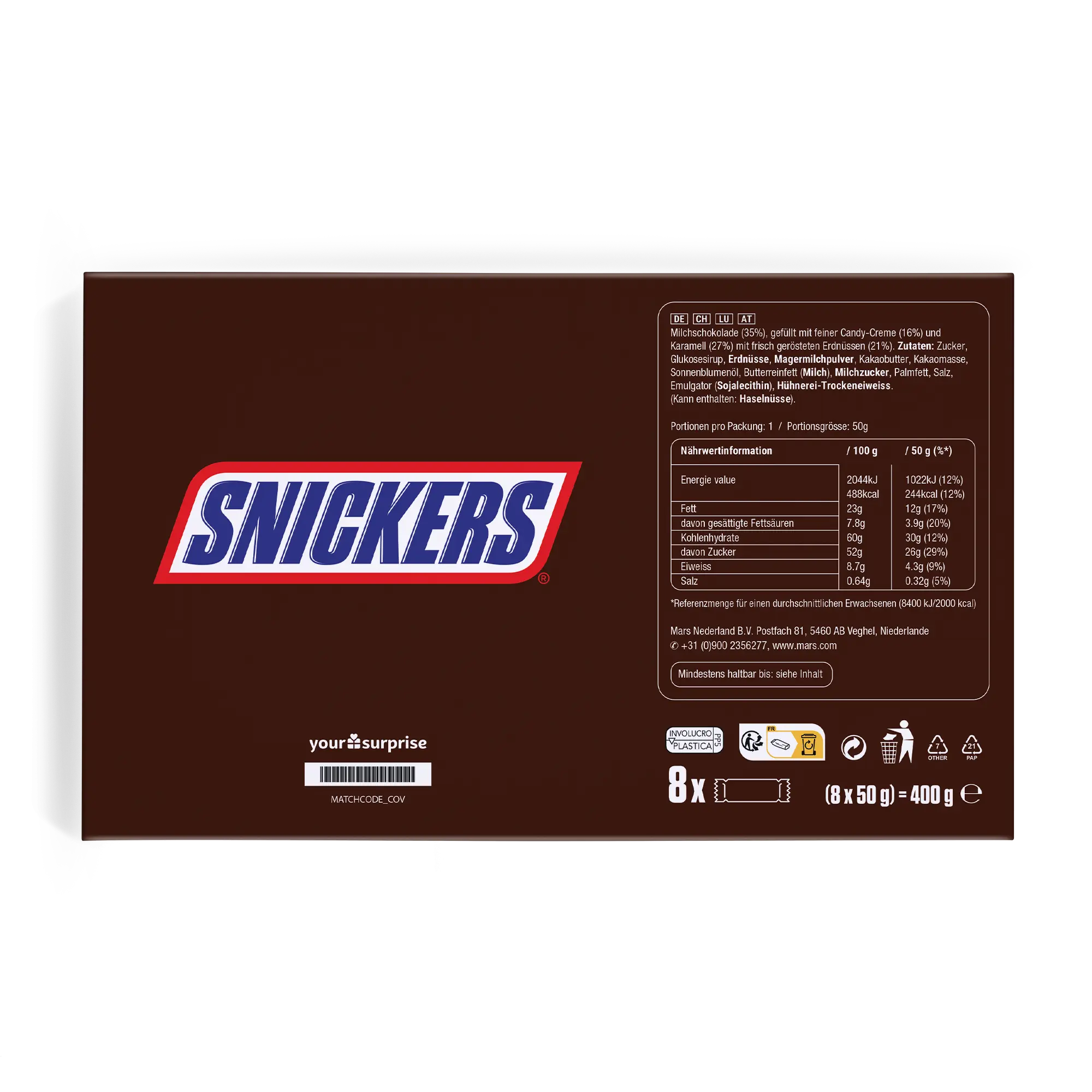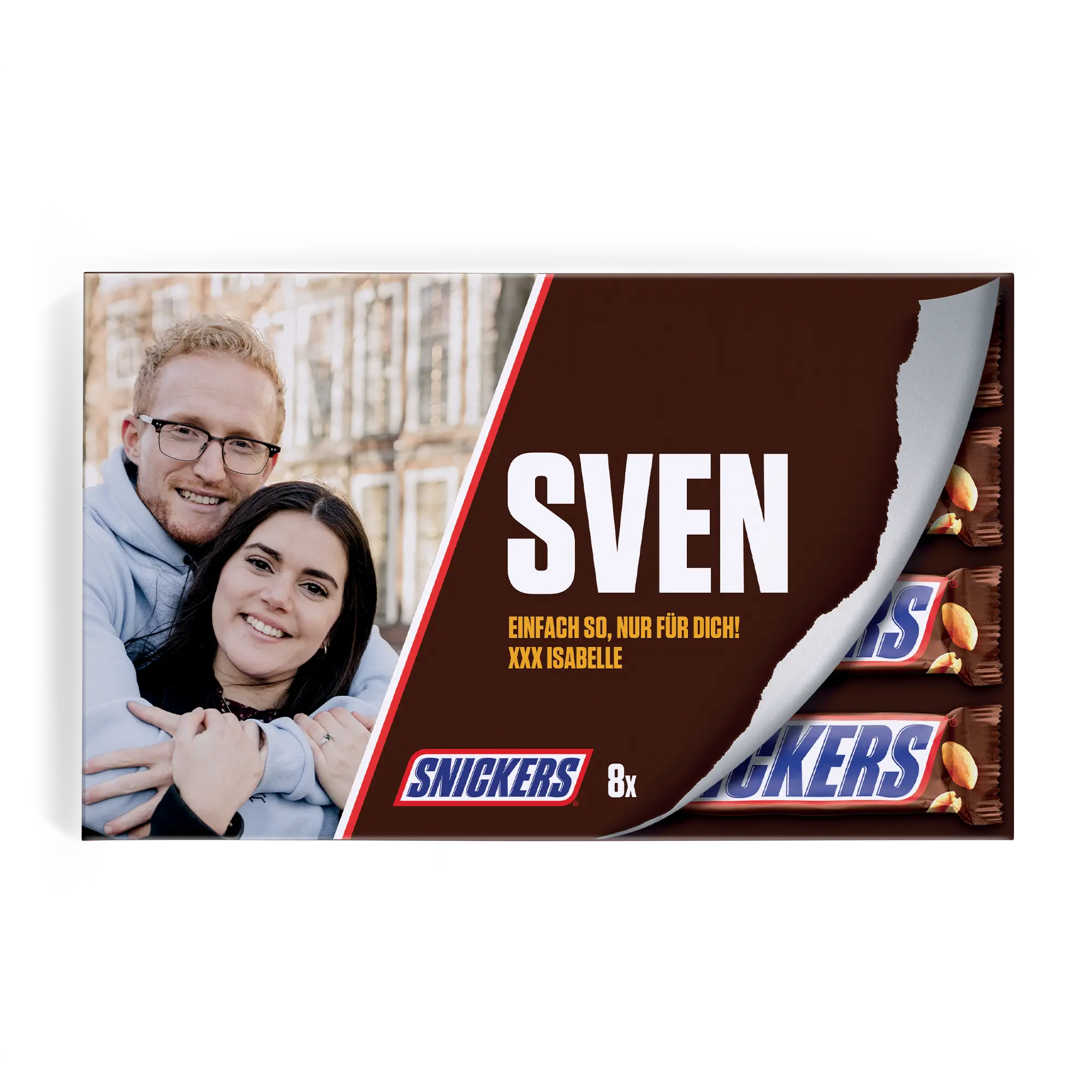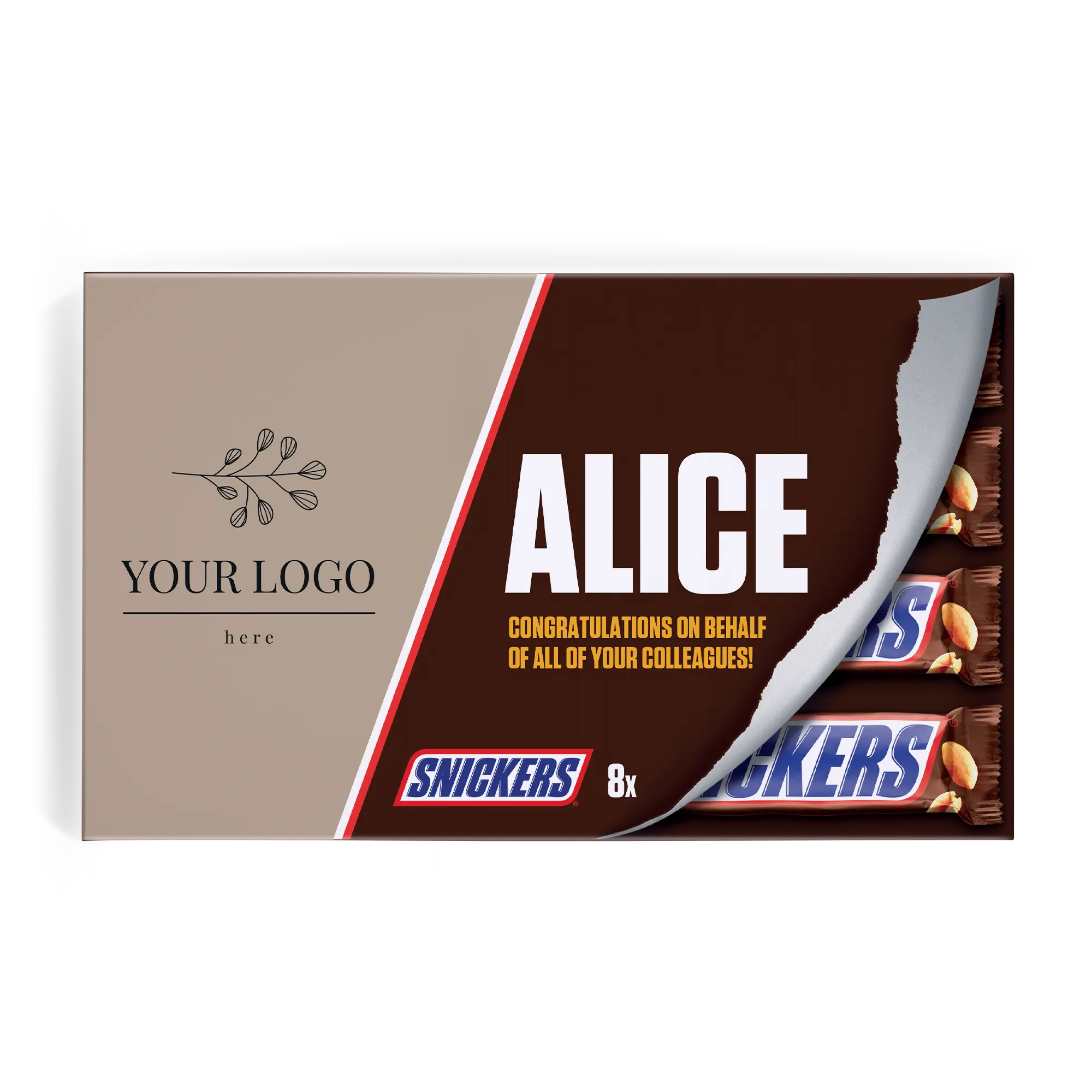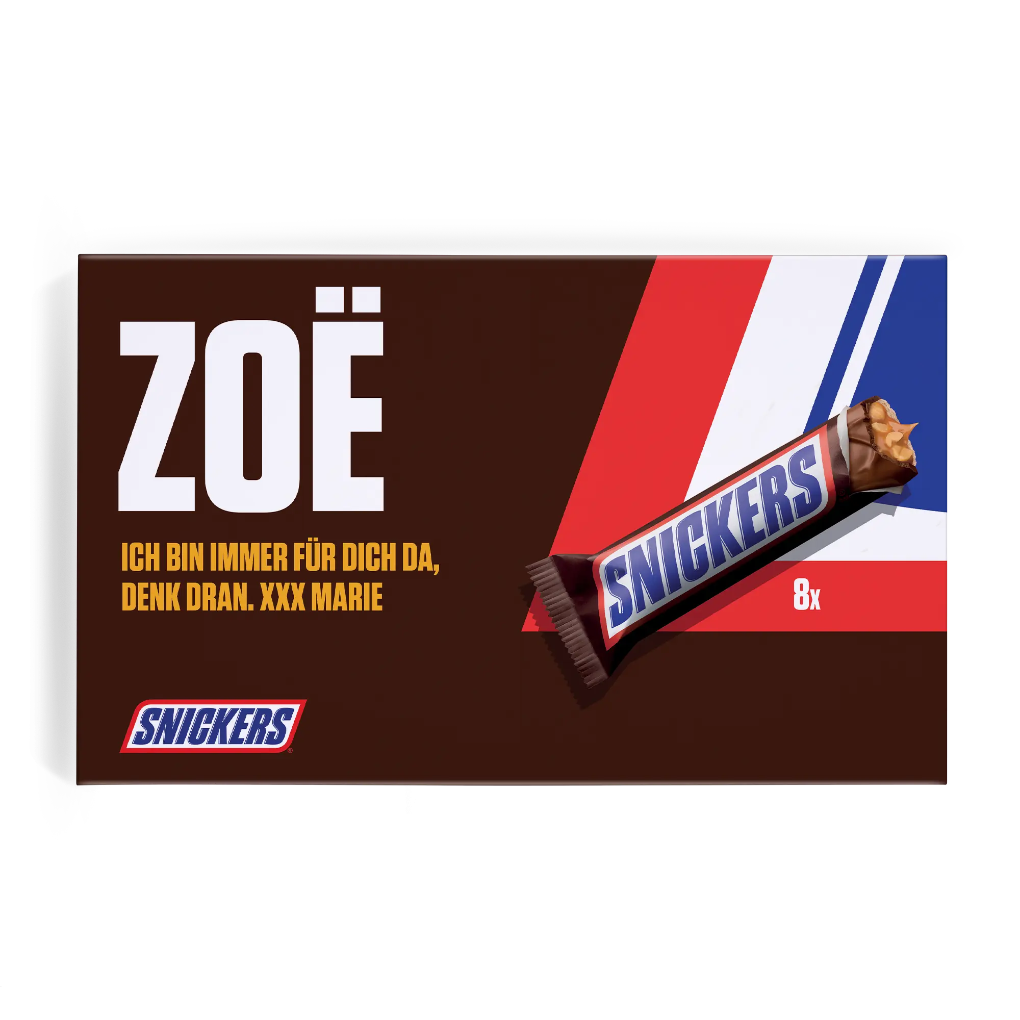 Spersonalizowane pudełko prezentowe Snickers ze zdjęciem, imieniem i/lub osobistym napisem do wyboru – idealne dla miłośników czekolady!Więcej informacji o pudełku prezentowym Snickers: Wymiary: 24,2 x 14,5 x 2,4 cm Waga: 8 x 50 gramów Personalizacja: imieniem, zdjęciem i/lub tekstem Nadruk: perfekcyjny i pełnokolorowy Składniki: Cukier, syrop glukozowy, orzeszki ziemne, odtłuszczone MLEKO w proszku, masło kakaowe, miazga kakaowa, laktoza, olej słonecznikowy, tłuszcz mleczny, serwatka w proszku, tłuszcz palmowy, sól, emulgator (lecytyna sojowa), proszek z białek jaj kurzych, hydrolizowany olej kokosowy, białko mleka, naturalny ekstrakt waniliowy. Alergeny: może zawierać orzechy laskowe