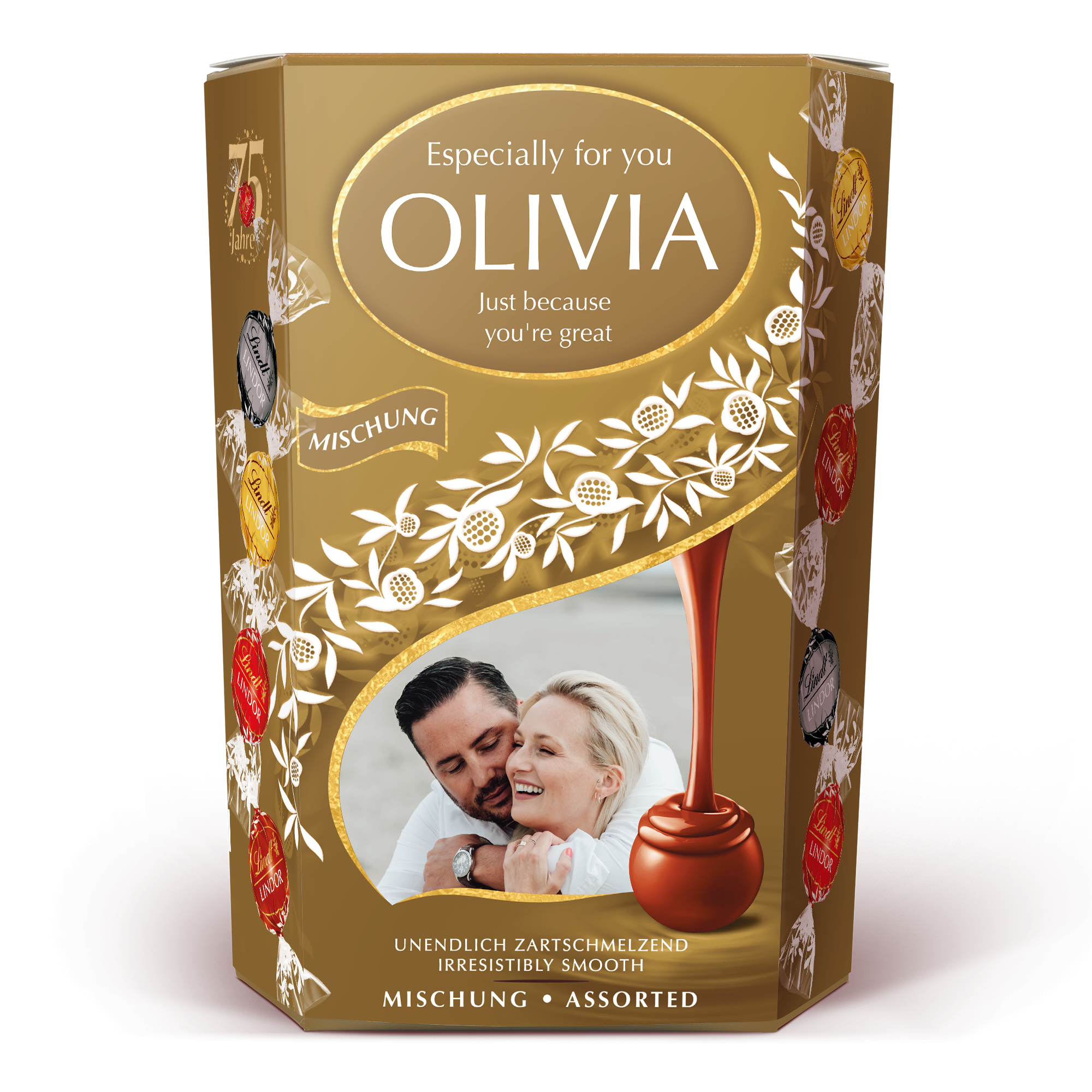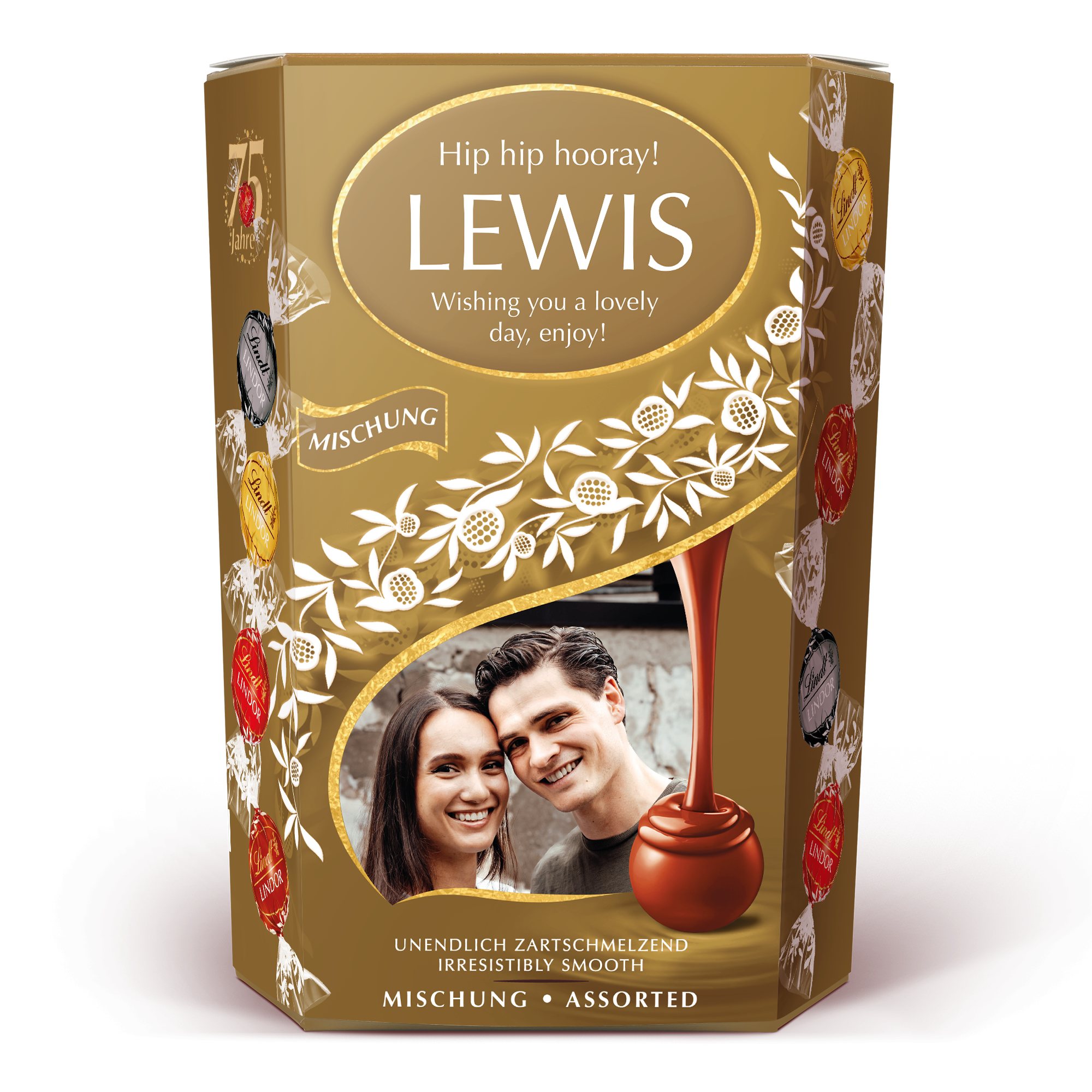 Lindor mleczna, orzechowa, biała i gorzka czekolada z delikatnym, rozpływającym się wnętrzem. Personalizacja ze zdjęciem, imieniem i osobistą wiadomością.