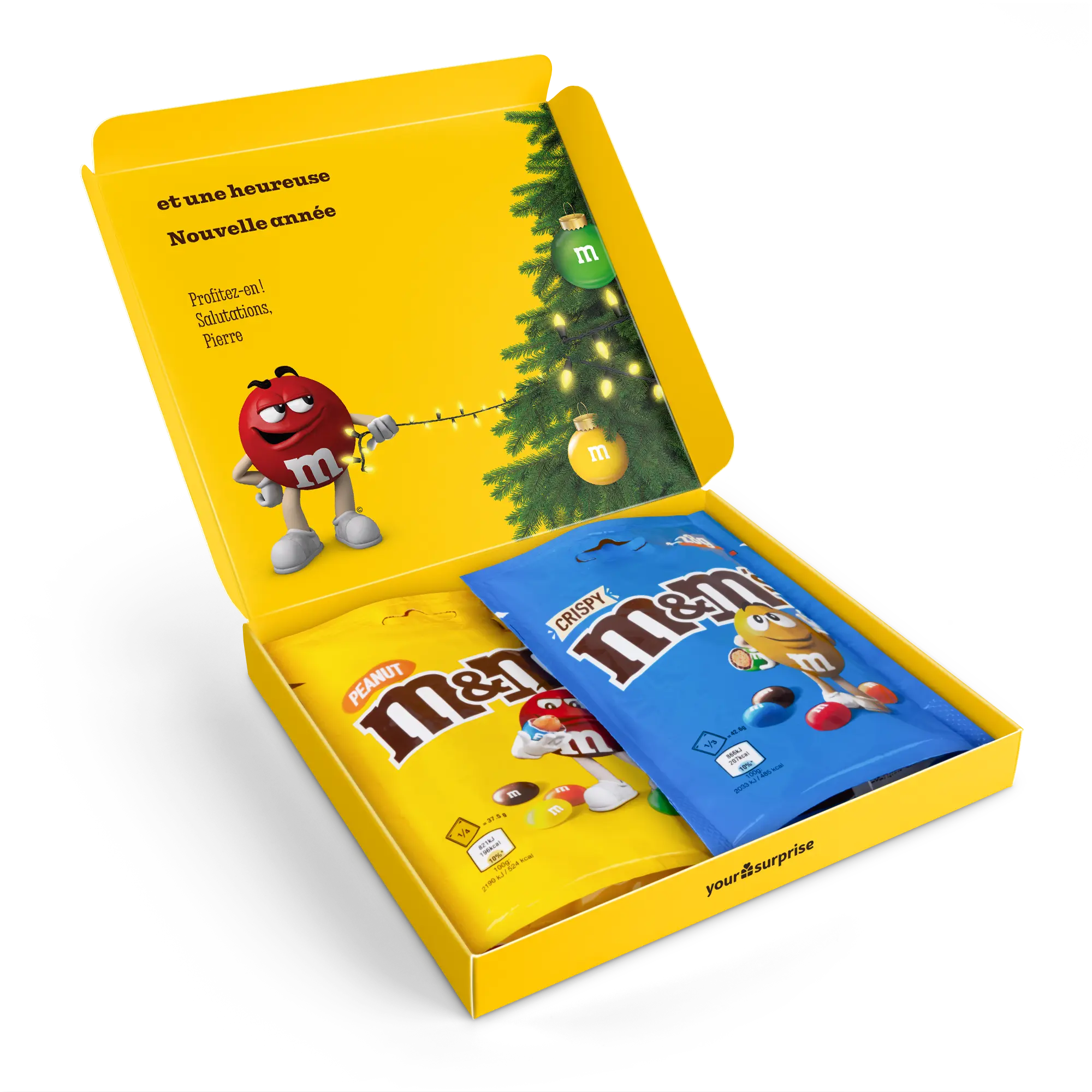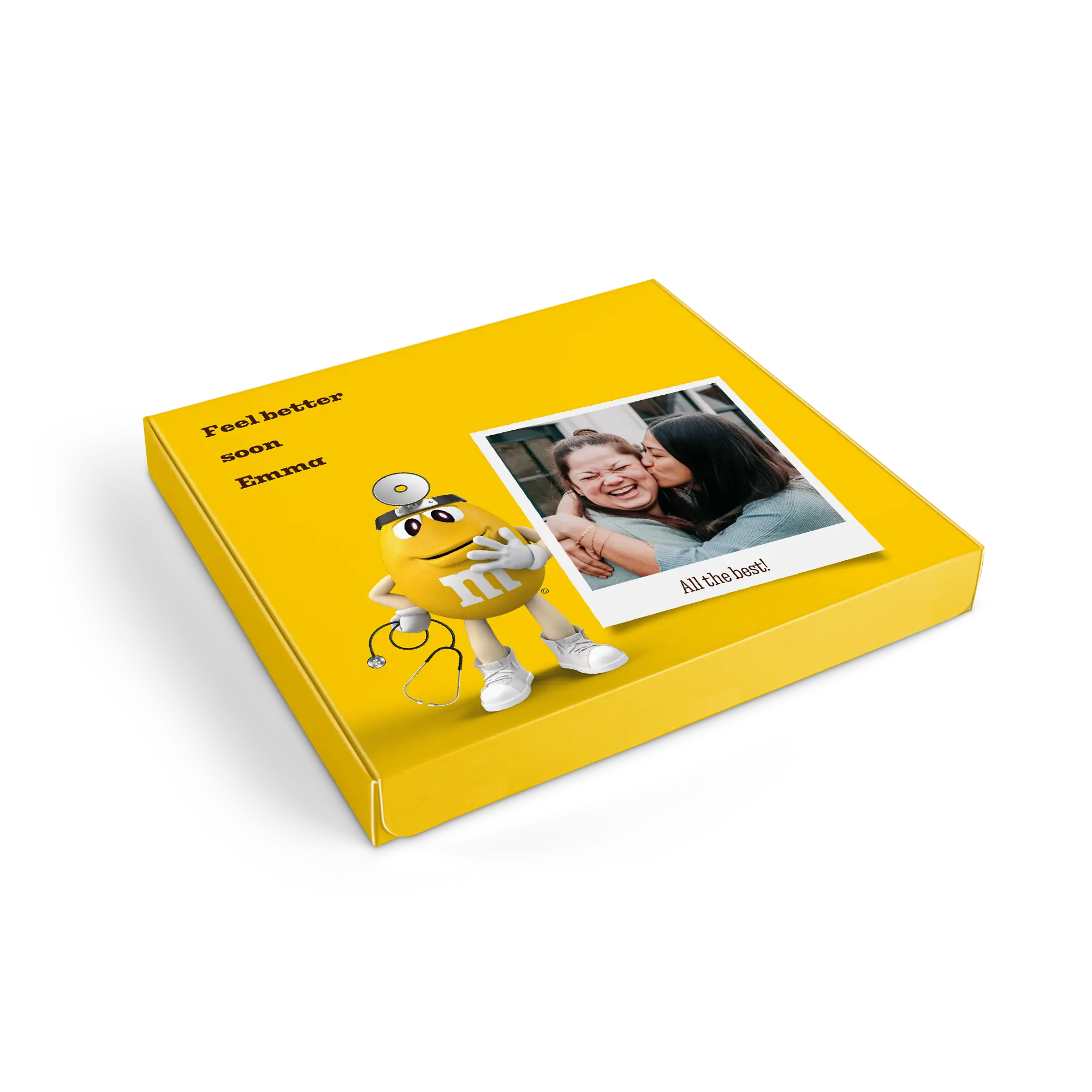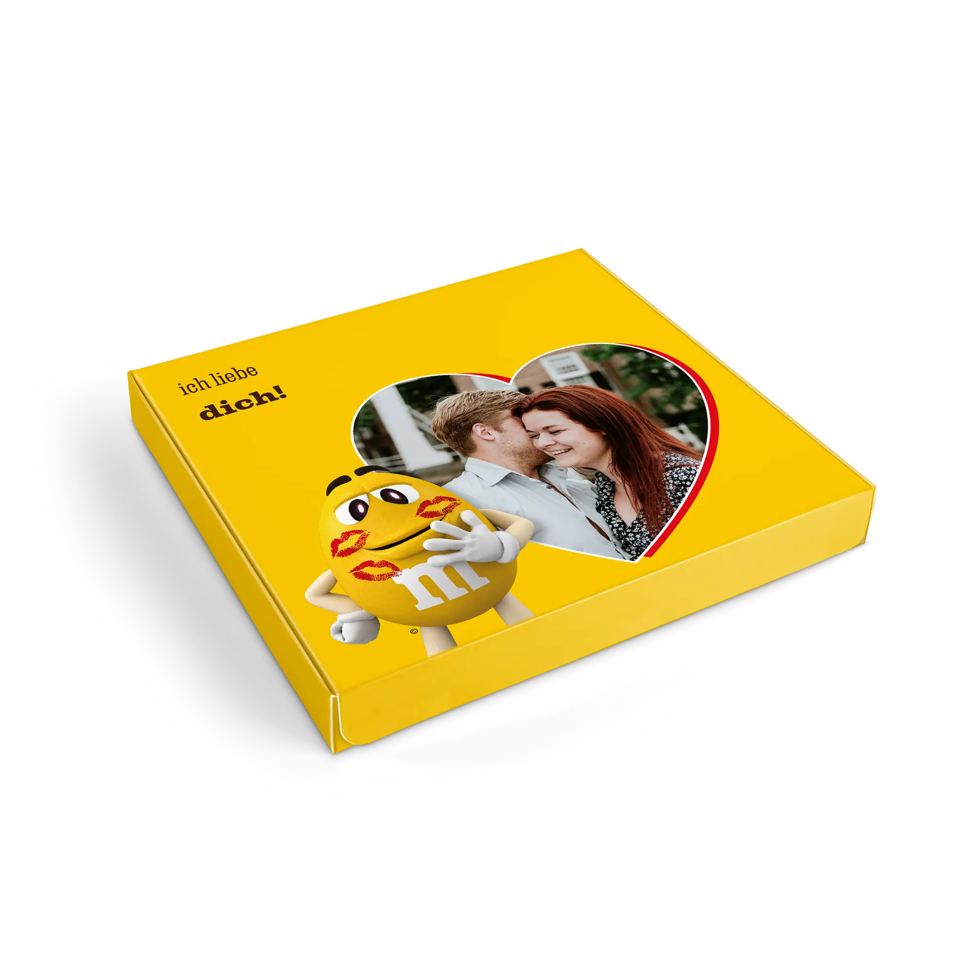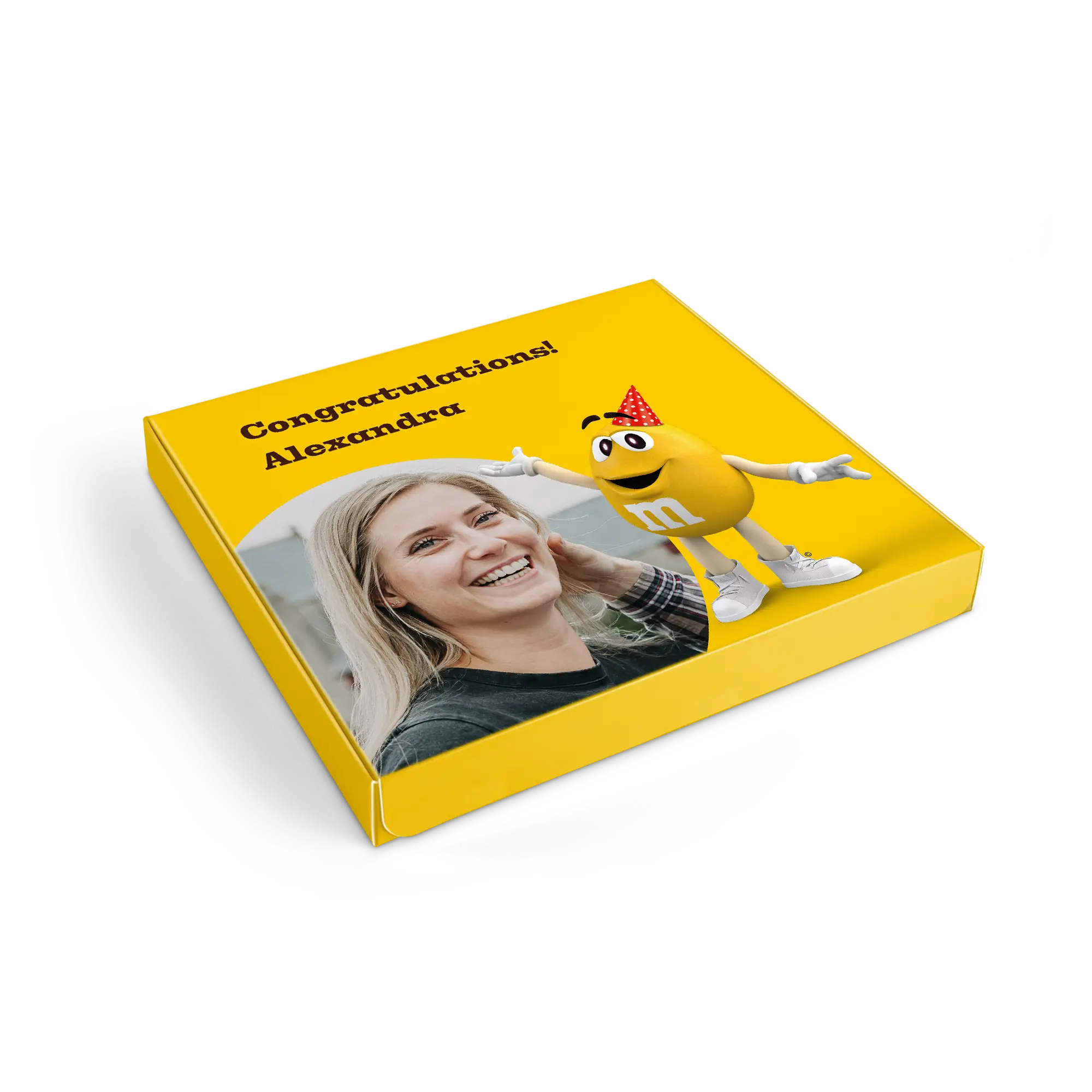 kogo chcesz zaskoczyć? Chrupiące tabletki M&M's z imieniem, zdjęciem i wiadomością w specjalnie zaprojektowanym pudełku prezentowym w stylu M&M'sWięcej informacji o pudełku prezentowym M&M's:Zawartość: 2 torebkiSmaki: jedna torebka M&M's Crispy (107 gramów), jedna torebka M&M's Peanut (125 gramów)Wymiary: 19,50 x 18 x 2 cmPersonalizacja: imieniem, zdjęciem lub logo i wiadomościąNadruk: przezroczysty i w pełnym kolorzeSkładniki M&M'S Crispy 107 g: Cukier, masło kakaowe, odtłuszczone mleko w proszku, miazga kakaowa, tłuszcz maślany (z mleka), laktoza, proszek maślankowy (z mleka), mąka ryżowa, pełne mleko w proszku, mąka pełnoziarnista, emulgator (lecytyna sojowa, E471), słodowana pszenica mąka, skrobia, tłuszcz palmowy, masło shea, syrop glukozowy, sól, olej rzepakowy, stabilizator (guma arabska), barwniki (E100, E133, E160a, E162, E170, E172), dekstryna, substancja glazurująca (wosk Carnauba), naturalny ekstrakt waniliowy, olej z pestek palmowych, aromat. ALERGENY: Może zawierać śladowe ilości orzeszków ziemnych, orzechów laskowych i migdałów. Składniki M&M'S Peanut 125g: Cukier, masło kakaowe, odtłuszczone mleko w proszku, masa kakaowa, orzeszki ziemne, tłuszcz maślany (z mleka), laktoza, serwatka w proszku (z mleka), pełne mleko w proszku, emulgator (lecytyna sojowa), skrobia, tłuszcz palmowy, masło shea, syrop glukozowy, sól, stabilizator (guma arabska), barwniki (E100, E133, E160a, E162, E170, E172), dekstryna, substancja glazurująca (wosk Carnauba), naturalny ekstrakt waniliowy, olej z pestek palmowych, aromat. ALERGENY: Może zawierać śladowe ilości migdałów, orzechów laskowych i pszenicy. Ważne: w temperaturach powyżej 25 stopni Celsjusza nie gwarantujemy, że otrzymasz swój czekoladowy prezent w idealnym stanie. Masz pytania? Niestety, ze względów technicznych nie możemy przetwarzać cyfr, cyrylicy, znaków tureckich ani znaków specjalnych.