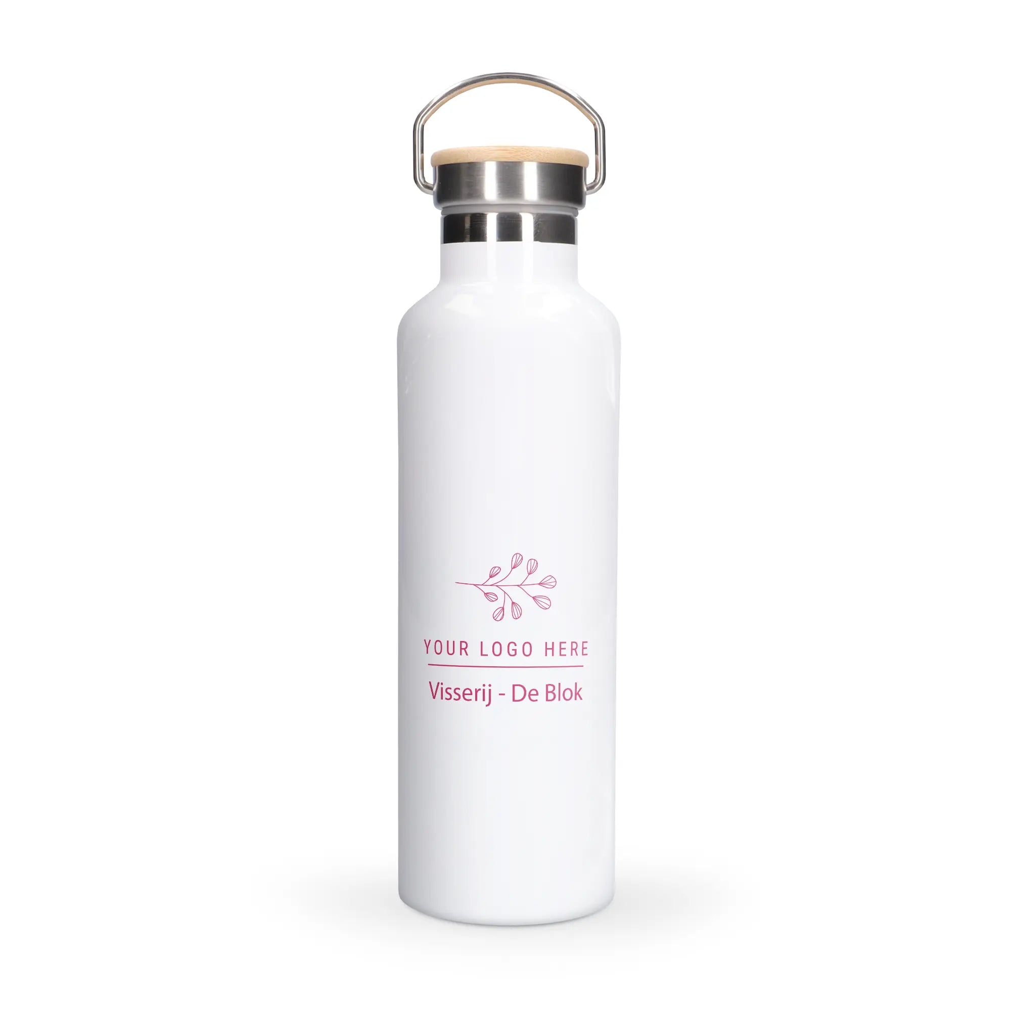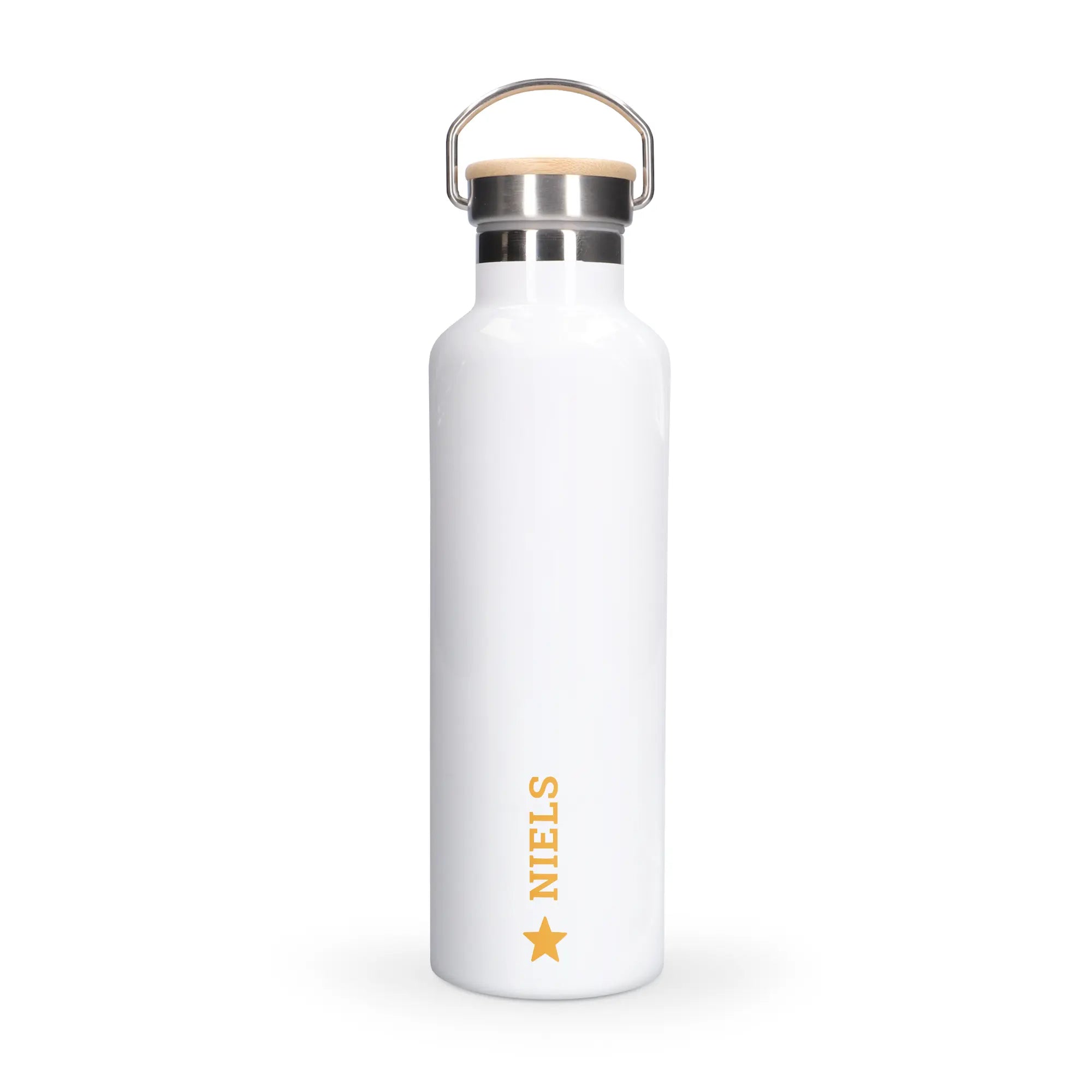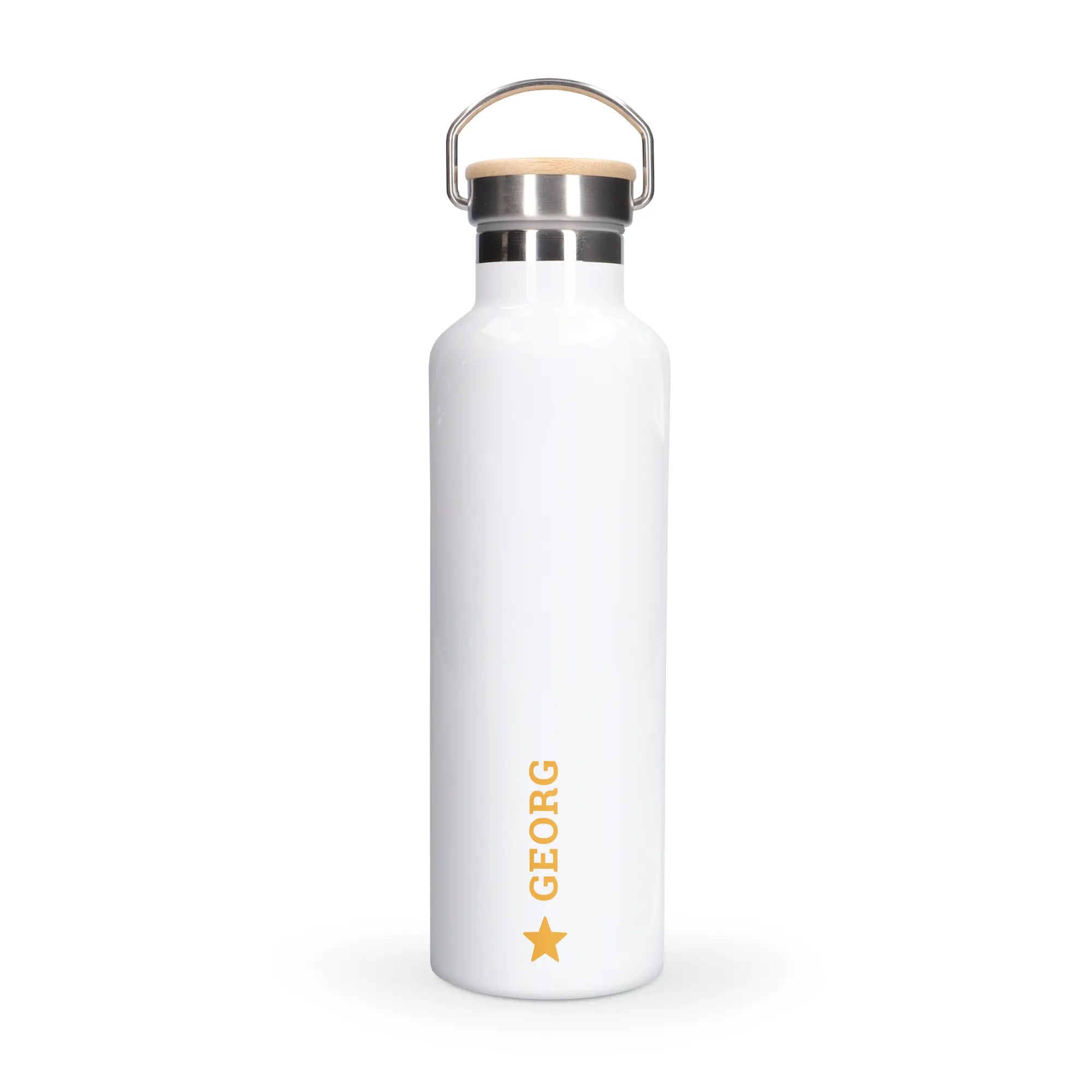 Spersonalizuj butelkę na wodę ze stali nierdzewnej, umieszczając na niej zdjęcie, tekst lub logo według własnego wyboru. Stwórz swoją już teraz!Więcej informacji o personalizowanej butelce na wodę: Materiał: wysokiej jakości stal nierdzewna i aluminium Kolor: biały z bambusową pokrywką Pojemność: 750 ml Personalizacja: zdjęcie, tekst i/lub logo Nadruk: idealny i w pełnym kolorze Termos: chłodzi do 24 godzin, utrzymuje ciepło do 12 godzin Dodatkowo: szczelny i izolowany, zaleca się mycie ręczne Warto wiedzieć: Butelka na wodę ma stylowy, aluminiowy wygląd. Oznacza to, że Twój projekt zostanie nadrukowany bezpośrednio na powierzchni butelki, nadając Twojemu prezentowi stylowy, industrialny wygląd. Oznacza to również, że efekt końcowy może różnić się od tego, co widzisz na ekranie.