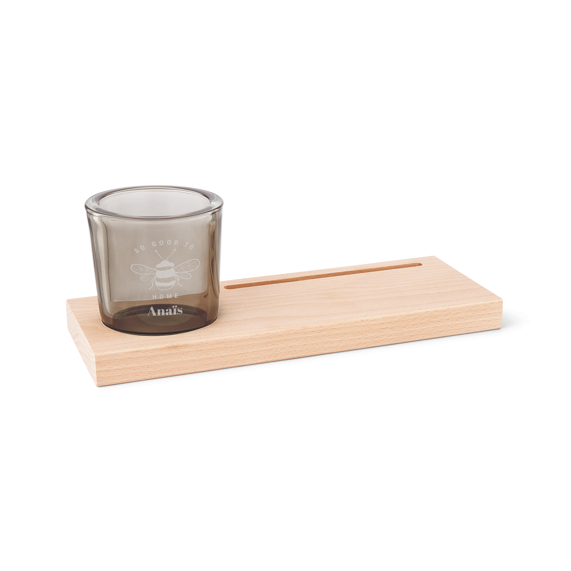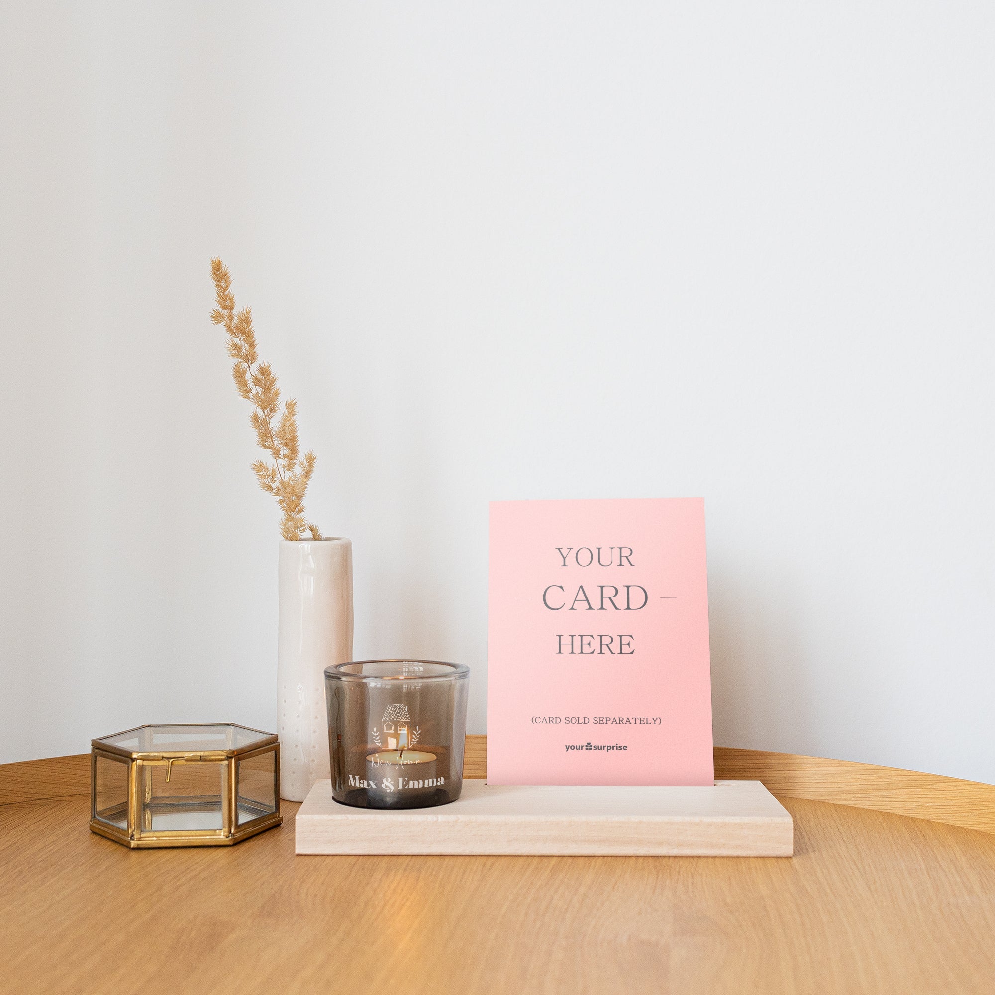 Drewniany wizytownik z grawerowanym, spersonalizowanym świecznikiem z imieniem lub datą do wyboru.
