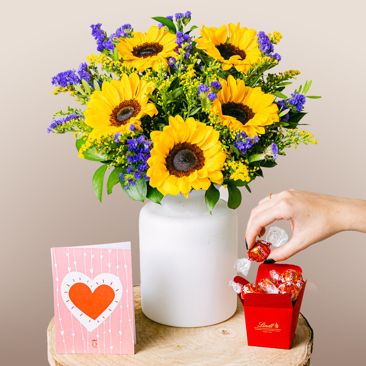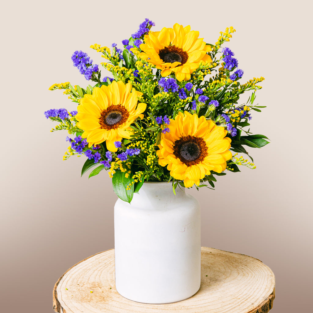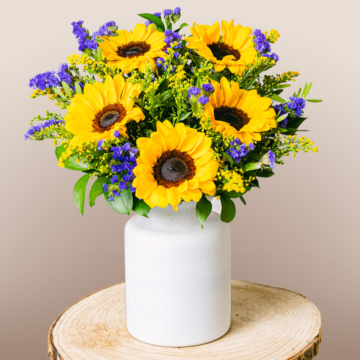 Łącząc jasność słoneczników i świeżość styksu, stworzyliśmy urzekającą mieszankę czystego szczęścia. Promienne słoneczniki to niezapomniany prezent dla wyjątkowej osoby, który może natychmiast zmienić jej dzień za pomocą jednej wiadomości tekstowej. To najlepszy sposób, aby powiedzieć "dziękuję" i przekazać radość lata.