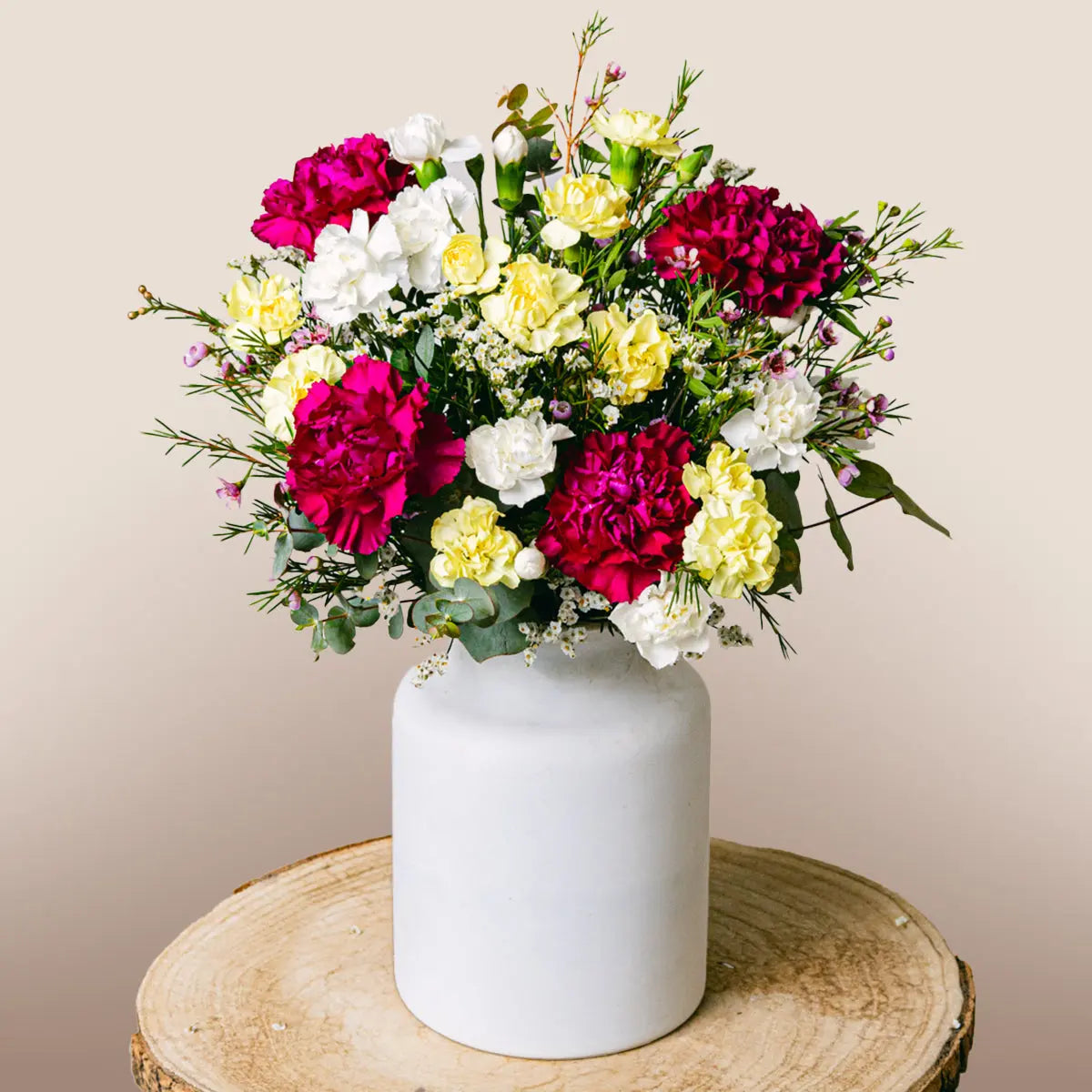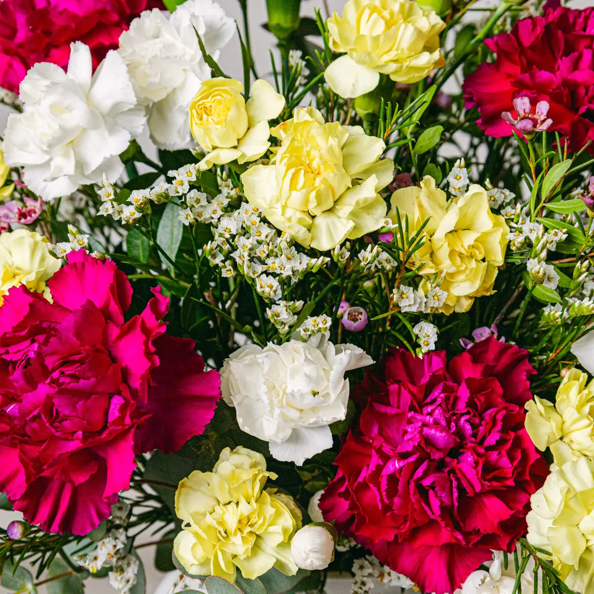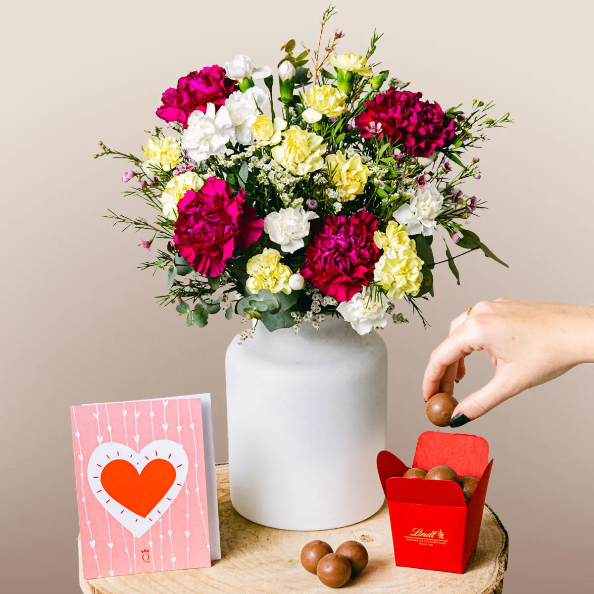 Poczuj ciepłe objęcie uczucia z naszym bukietem „Harmonia Serca”, zachwycającym połączeniem żywych goździków i delikatnego lisianthusa. Ta starannie wykonana kompozycja przemawia językiem miłości i podziwu, dzięki czemu stanowi idealny prezent dla osób, które chcą połączyć serca pomimo dzielącej je odległości. Bogate, głębokie odcienie czerwieni i różu goździków symbolizują głęboką miłość i uczucie, a biały lisianthus symbolizuje czystość i niewinność, niosąc przesłanie równie słodkie, jak dołączone do niego czekoladki.