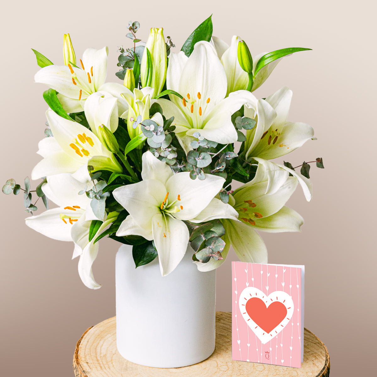 Romantyczne związki otaczają szczęśliwców szczególną magią, wypełniają serce szczęściem i tworzą to wyjątkowe uczucie unoszenia się na chmurze. Towarzyszy im piękno białego lilium azjatyckiego, kwiatu powszechnie używanego podczas uroczystości i kojarzonego z szczęściem. Idealny do... Wyrażenia radości z nowego romansu.