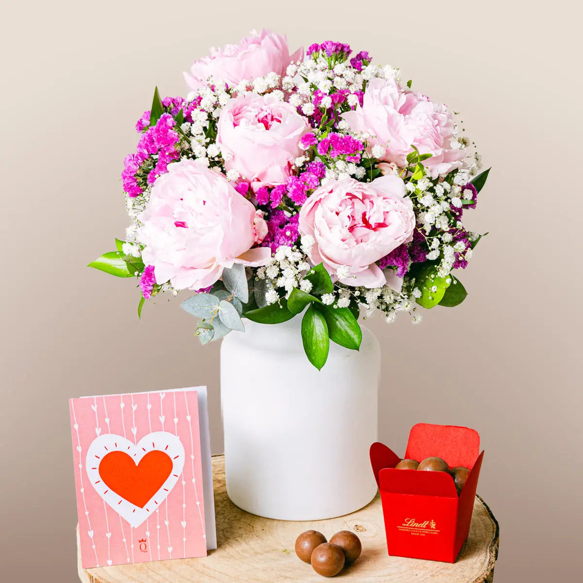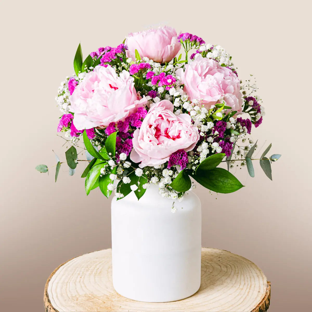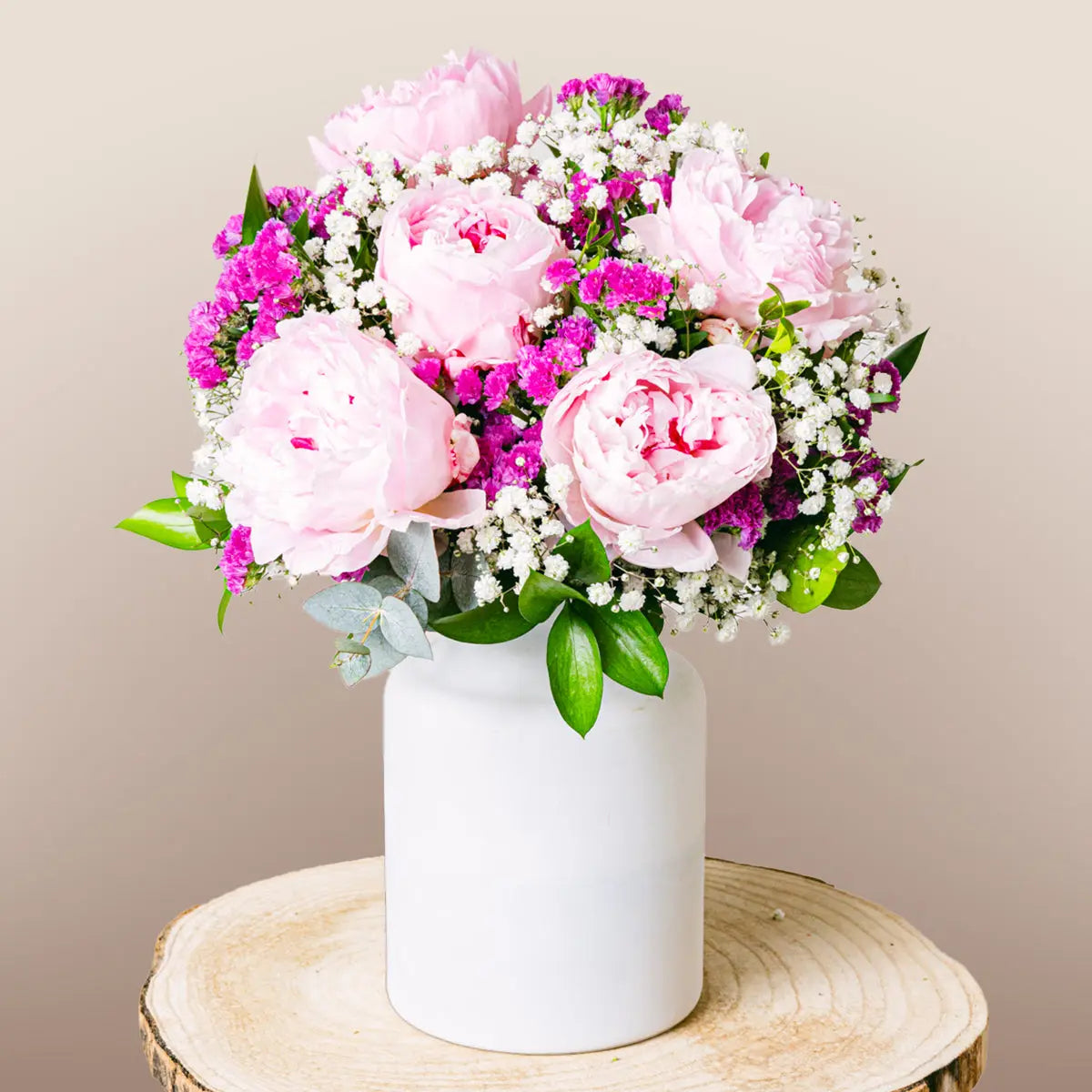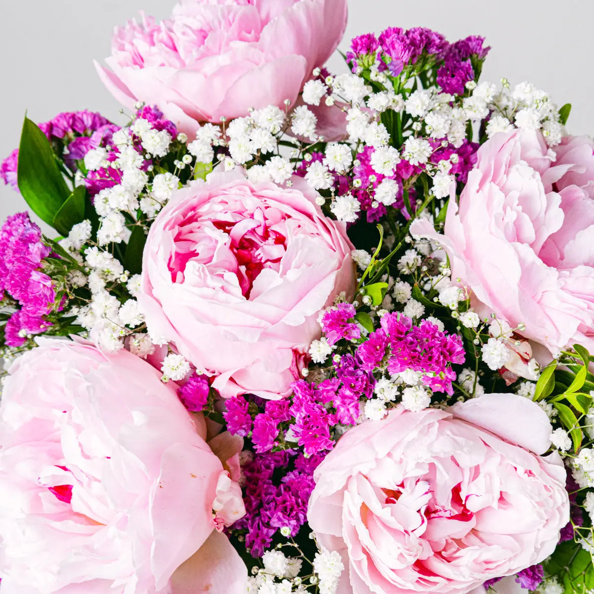 Ta piękna i romantyczna aranżacja składa się z różowych peonii, gipsofili i fuksjowej statyki. Różowe peonie nadają słodki i romantyczny ton, a gipsówka i fuksja dodają odrobinę koloru i radości. Piwonie o dużych, głębokich kwiatach, wraz z gipsówką i fuksjową statuetką tworzą wyjątkowy i ekskluzywny bukiet. Idealny na specjalną okazję, ponieważ jest to piękny sposób na wyrażenie swojej miłości.