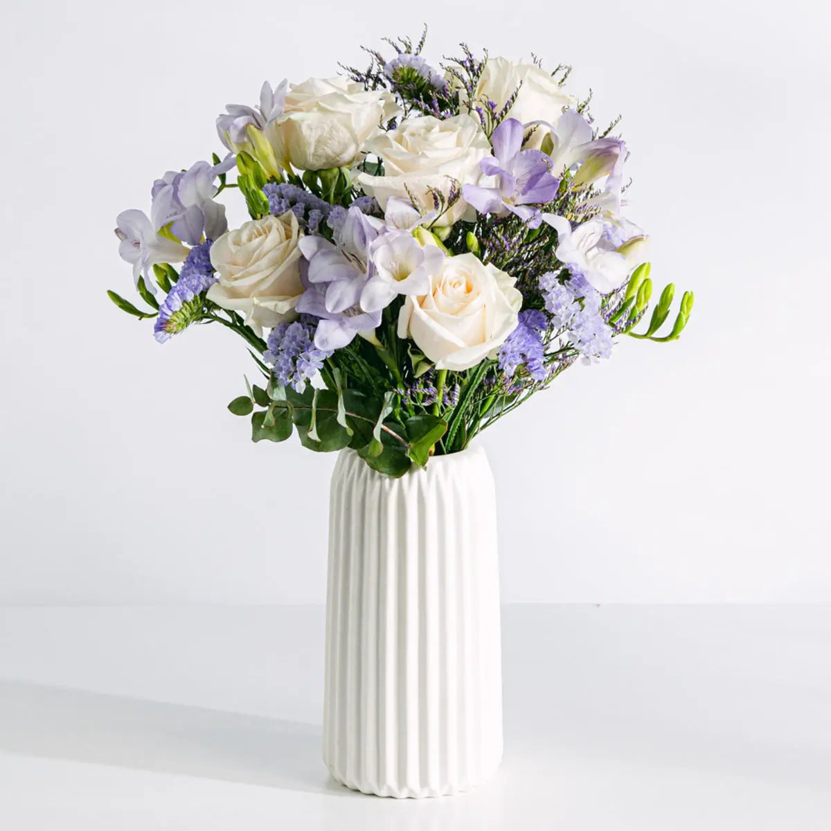 Po przybyciu: Umieść swój bukiet w czystej wazie ze świeżą, letnią wodą natychmiast po dostawie.