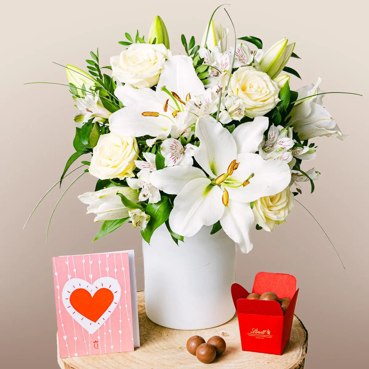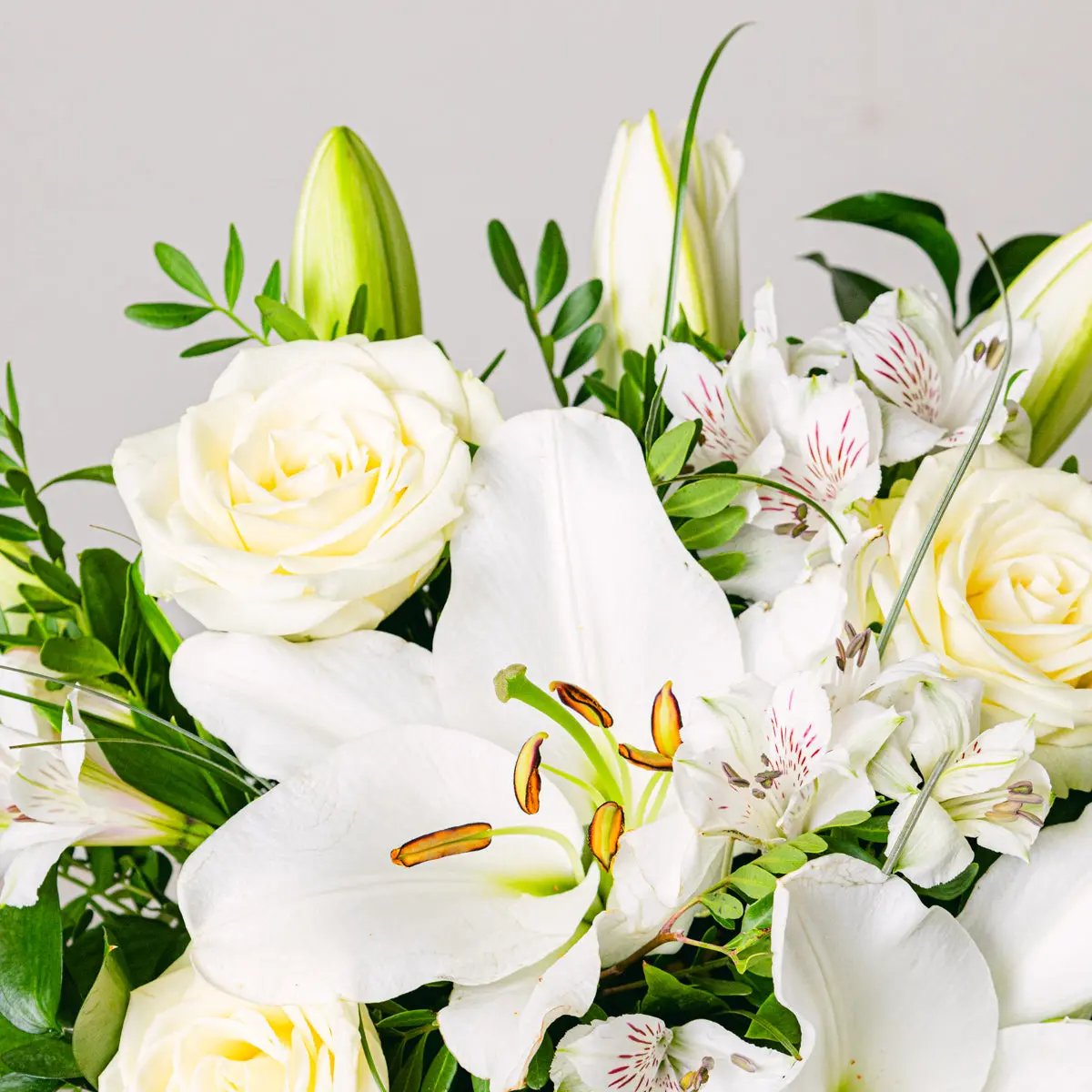 Nasza wspaniała kompozycja kwiatowa z lilii, róż i białej alstremerii jest ucieleśnieniem ponadczasowej elegancji, idealna jako doskonały prezent na niezapomniane chwile. Ta kompozycja jest sublime wyrazem miłości i oddania, przeznaczona do rozświetlenia serc tych, którzy ją otrzymają w szczególnych momentach.