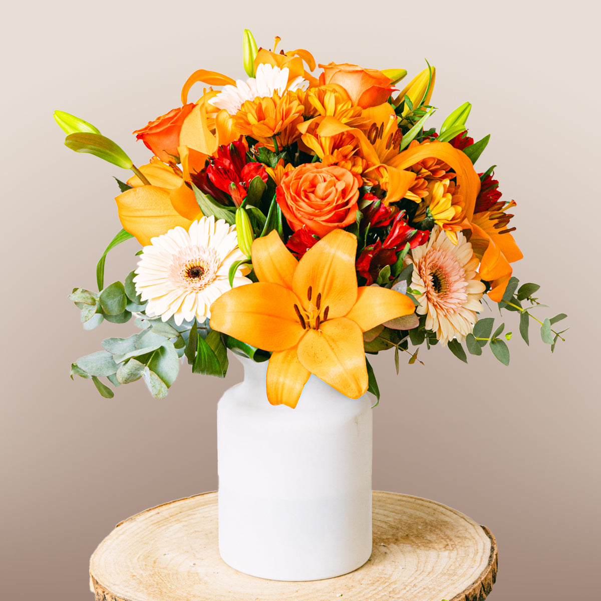 Ciepłe tony budzą pokój i spokój oraz przekazują wiadomość bezwarunkowego wsparcia. Ten bukiet symbolizuje przemijające piękno życia i znaczenie wspomnień.