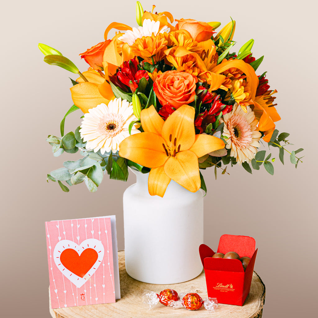 Rozkoszuj się tą elegancką demonstracją doskonałości w kolorze pomarańczowo -brzoskwiniowym oraz jej pozytywnymi wibracjami. Dzięki różom, liliom i alstromeriom prezentującym te wesołe brzoskwiniowe i pomarańczowe kolory jest to idealny bukiet do uczczenia radosnej okazji.