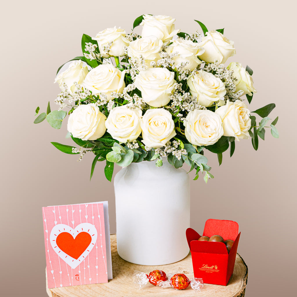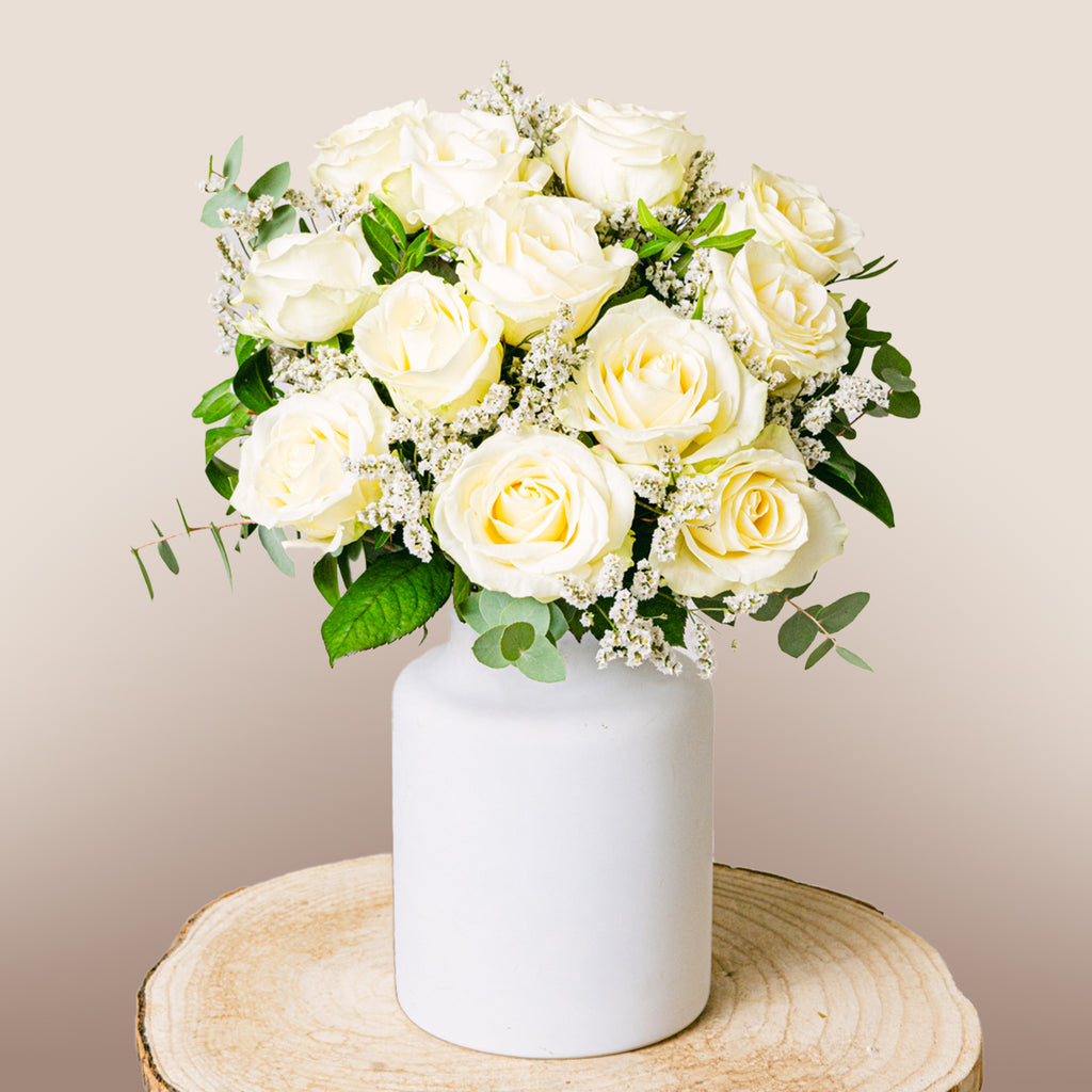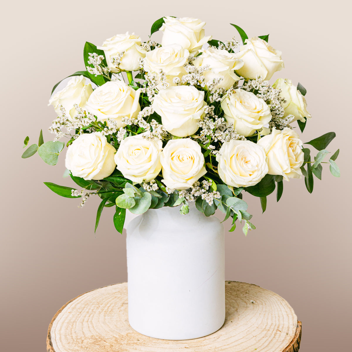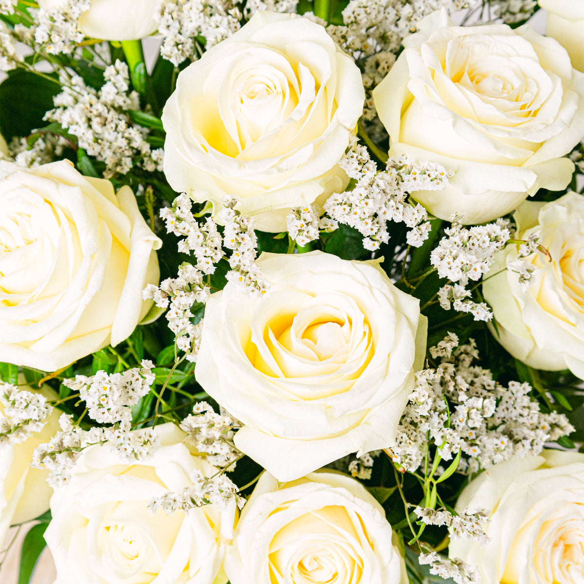 Podziel się odrobiną klasy z najbliższymi dzięki naszemu bukietowi z białych róż. Z elegancją, klasą i czytelnie, tuzin białych róż, w pełen wdzięku sposób, wyrazi Twoje uczucia w sytuacjach, w których wystarczą tylko klarowne emocje, takie jak wesela, rocznice i wyrazy miłości.