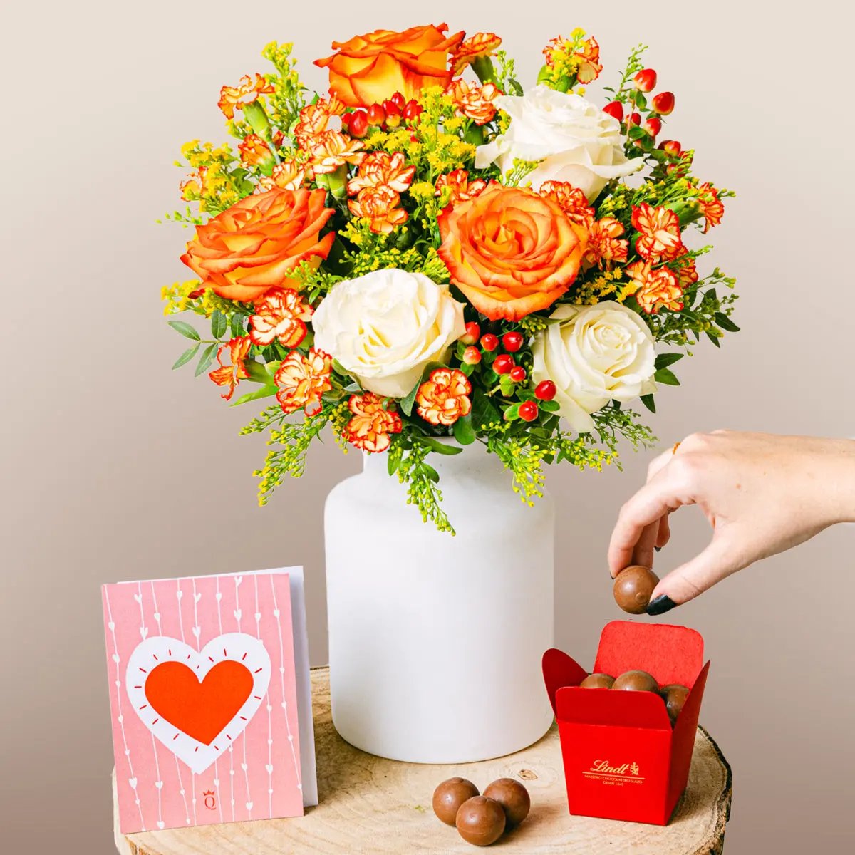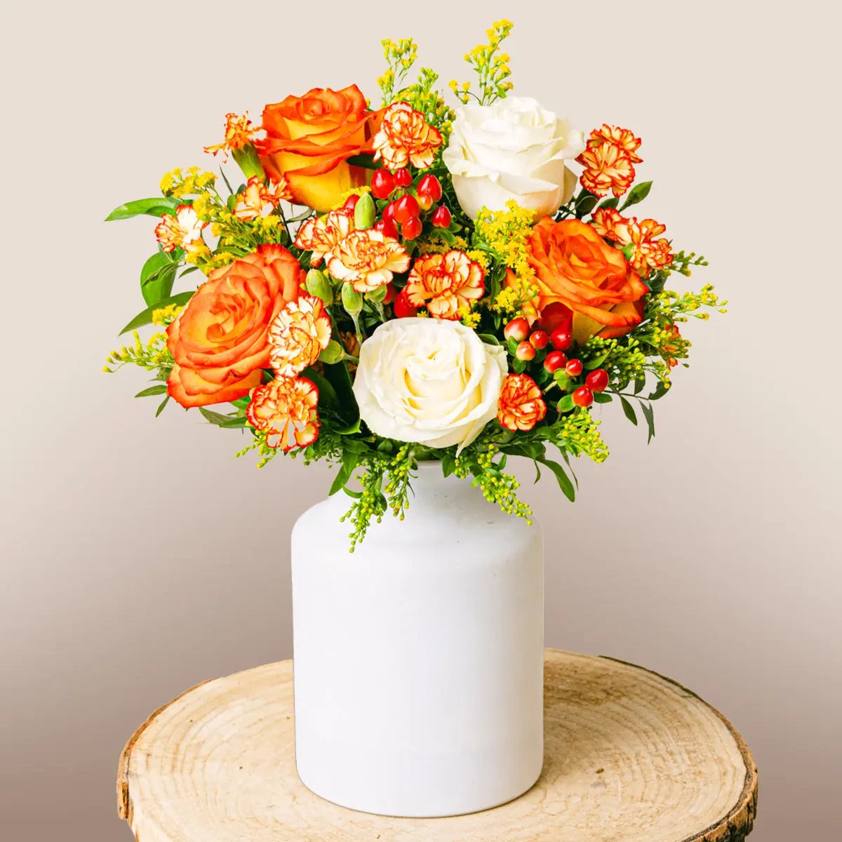 Ciesz się tym eleganckim połączeniem pomarańczowo-różowych wibracji, ciepła i radości, a jednocześnie eleganckiego połączenia. Równowaga między białymi i pomarańczowymi różami oraz pomarańczowymi goździkami tworzy idealne połączenie, które idealnie sprawdzi się jako prezent do radosnej dekoracji. Bukiet idealnie nadaje się na specjalne okazje i do stworzenia przytulnego domu, który wypełni się ciepłem i radością.