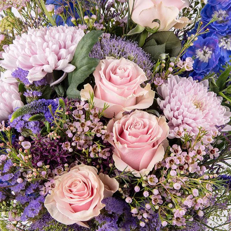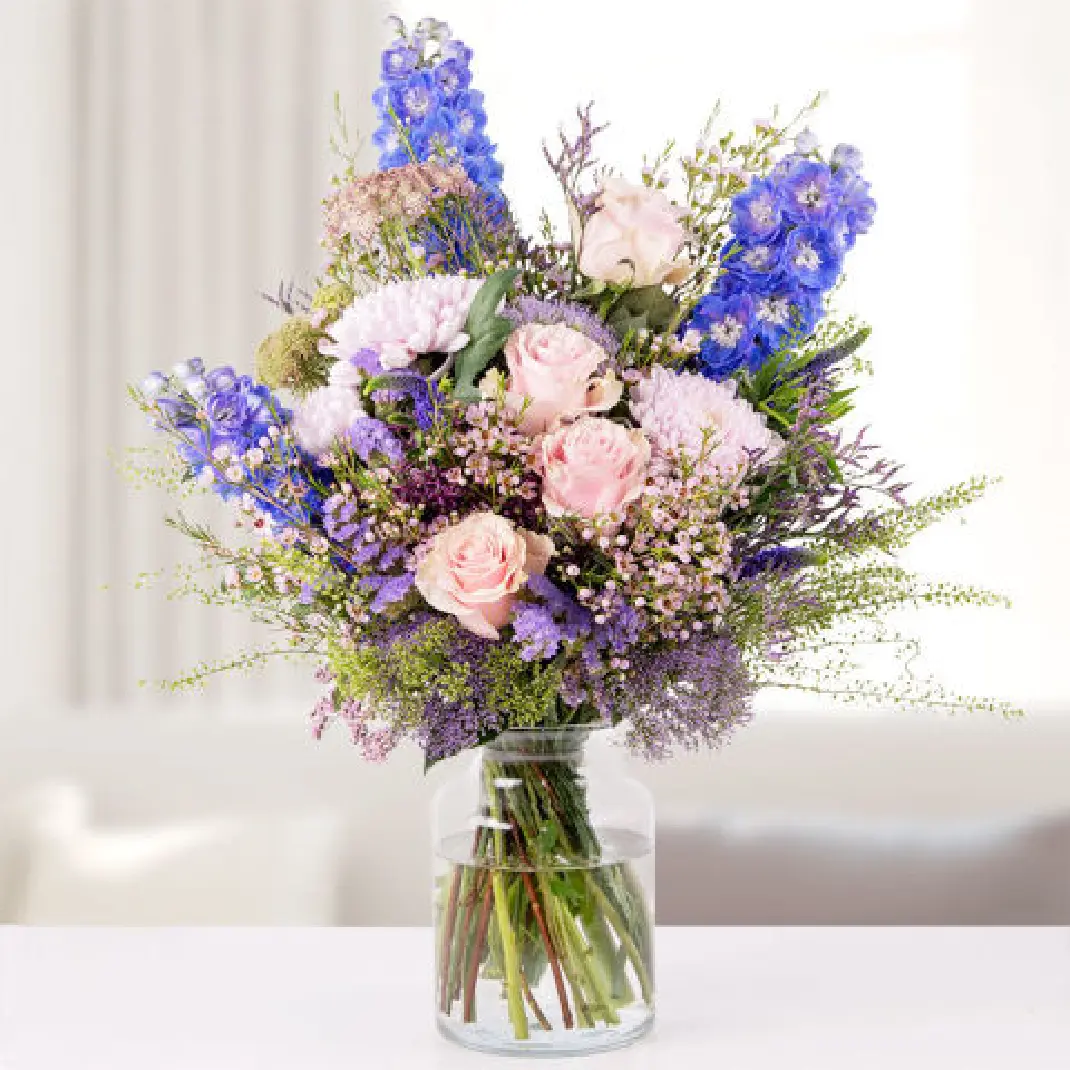 Ekskluzywna, unikatowa kompozycja zaprojektowana specjalnie z myślą o niespodziankach. Intensywnie niebieskie ostróżki dumnie urzekają i z pewnością przyciągną wzrok. Roślina ta, zwana również ostróżką, zawdzięcza swoją nazwę kwiatom w kształcie delfina, które czynią ją prawdziwie egzotycznym i niezwykle pożądanym kwiatem. Delikatne łodygi fioletowego limonium dodają delikatnego i nieco dzikiego akcentu, a eleganckie róże i anastazje nadają kompozycji radosny akcent, wprowadzając magiczne poczucie równowagi.