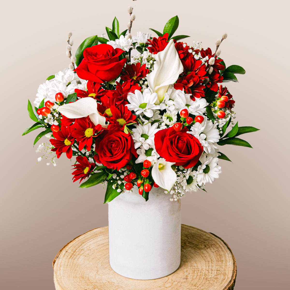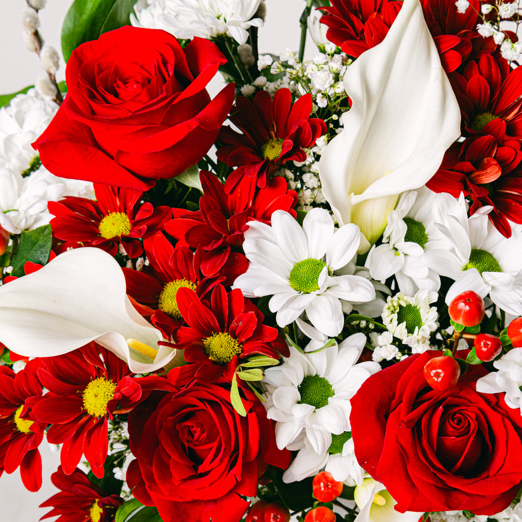 Kwiaty calla zostały nazwane od greckiego słowa oznaczającego piękno - Calla. Uważa się, że są one talizmanem przynoszącym szczęście i radość przez cały rok. Ich świętość i czystość są uzupełnione klasycznymi i namiętnymi czerwonymi różami, tworząc oszałamiający bukiet yin-yang.