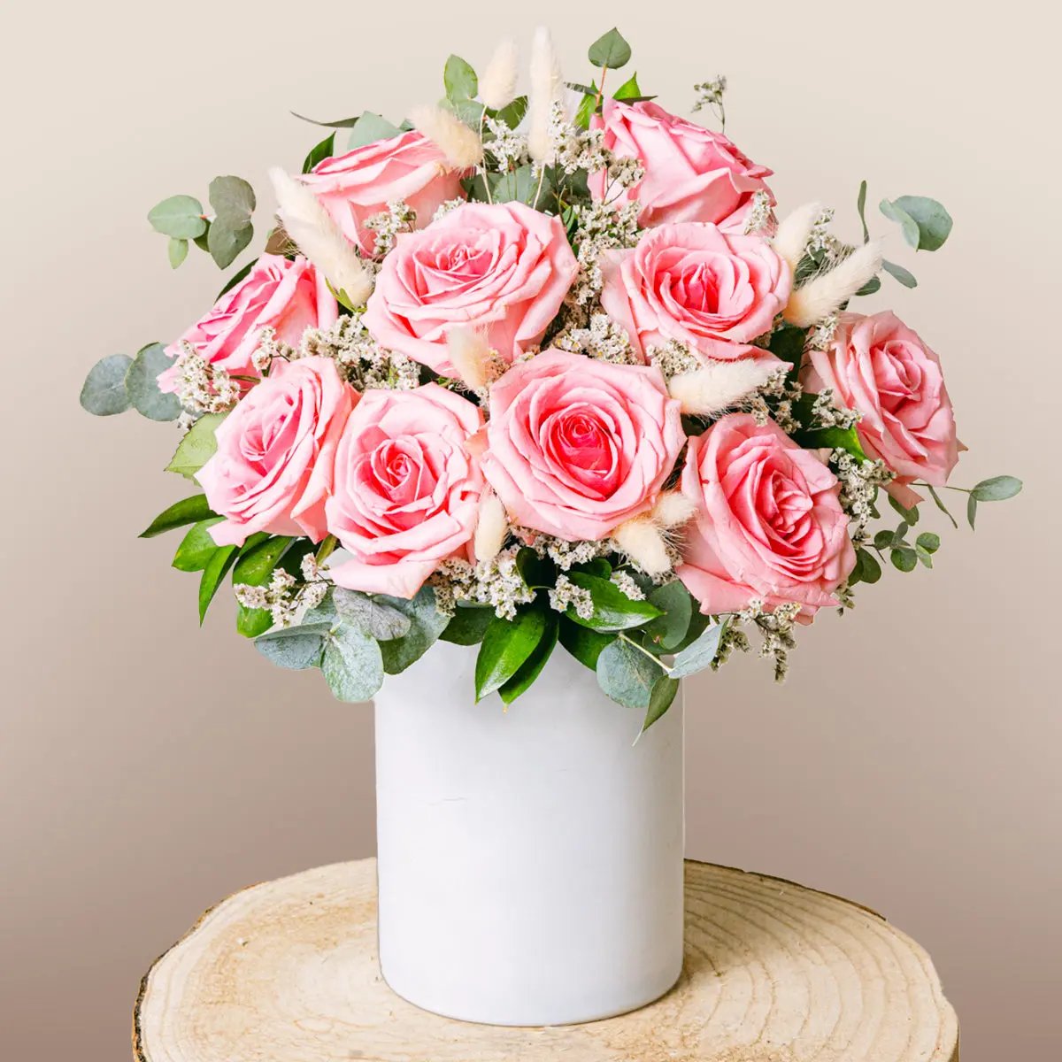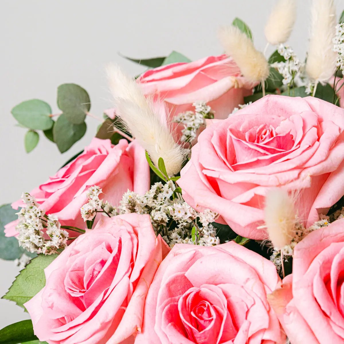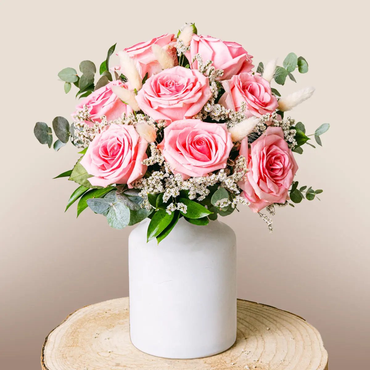 Klasyczna kompozycja z różowych róż i zatrwiana oferująca prostotę, tak potrzebną do pożegnania się z bliską osobą. To minimalistyczny i elegancki bukiet, który towarzyszy delikatnym uczuciom.
