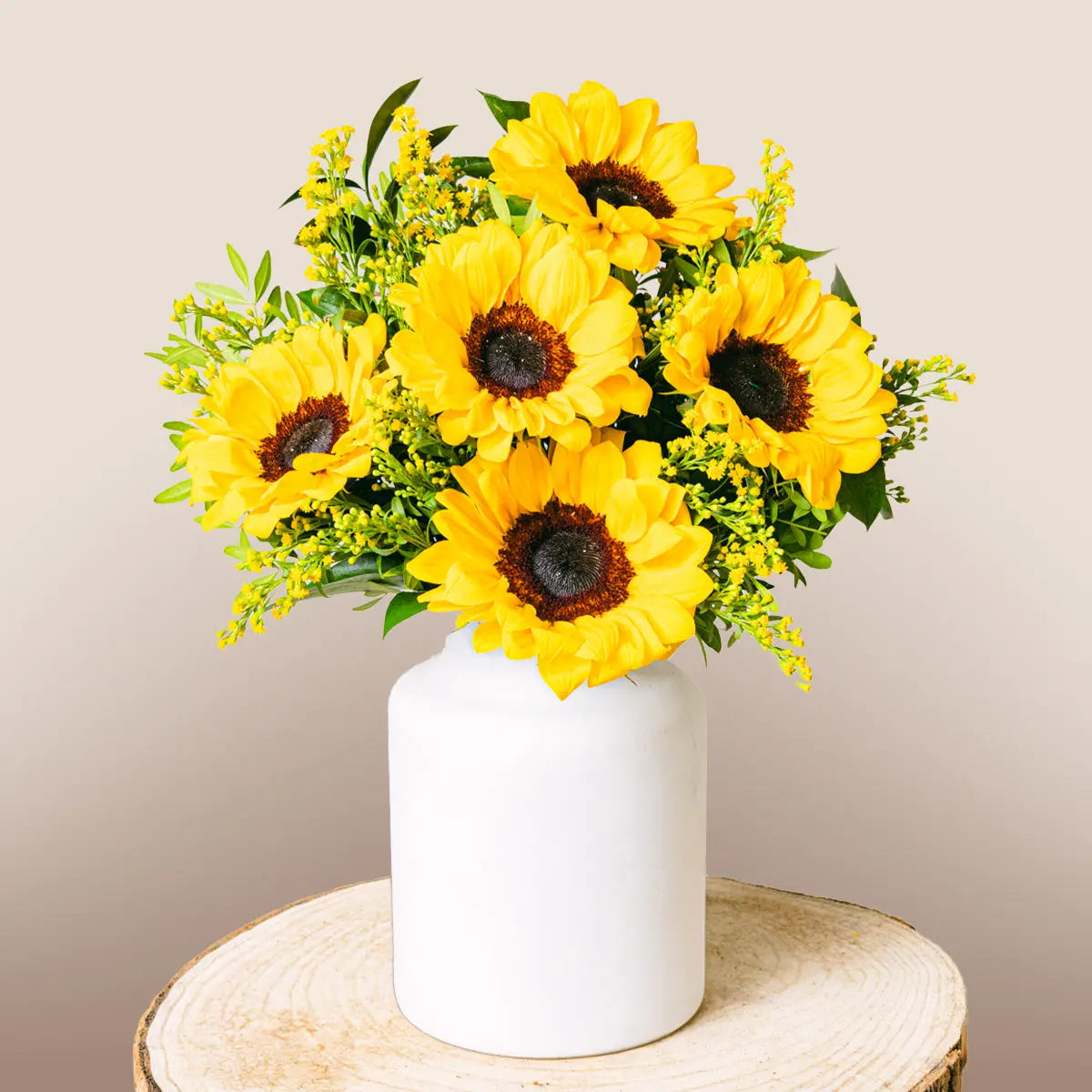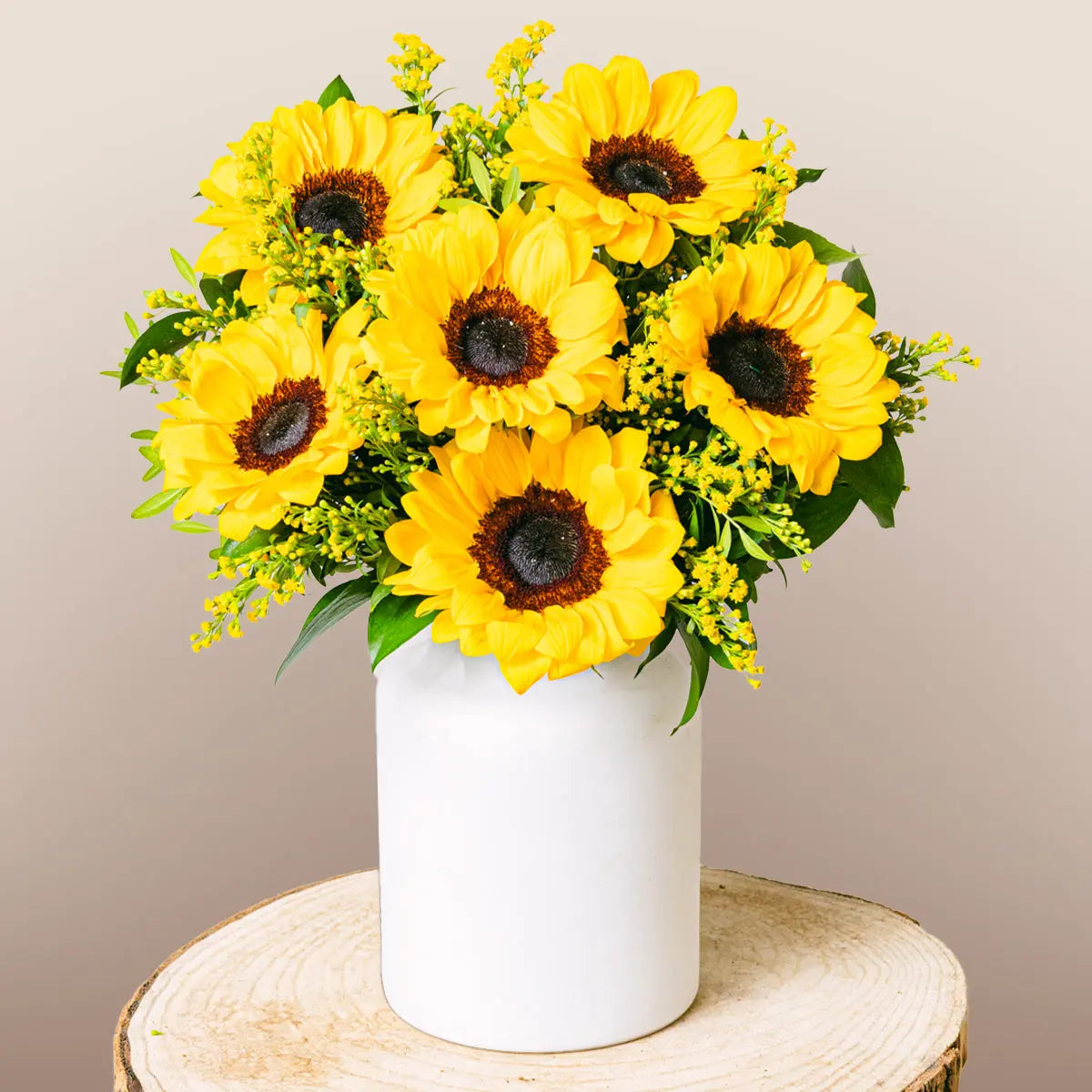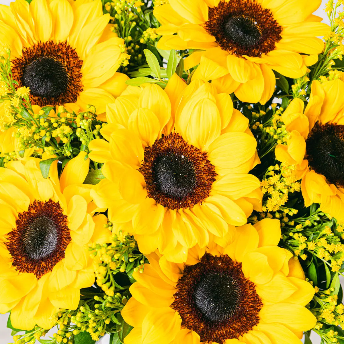 Nasz promienny bukiet Złota Melodia łączy radość słoneczników z elegancją nawłoci, wszystko otulone liśćmi aspidistry, lentiska i eukaliptusa. Ta żywa kompozycja kwiatowa jest idealna, aby rozświetlić dzień każdej wyjątkowej osoby. Słoneczniki, znane ze swojego symbolizmu szczęścia i witalności, harmonijnie mieszają się z nawłocią, tworząc bukiet pełen energii i pozytywności.
