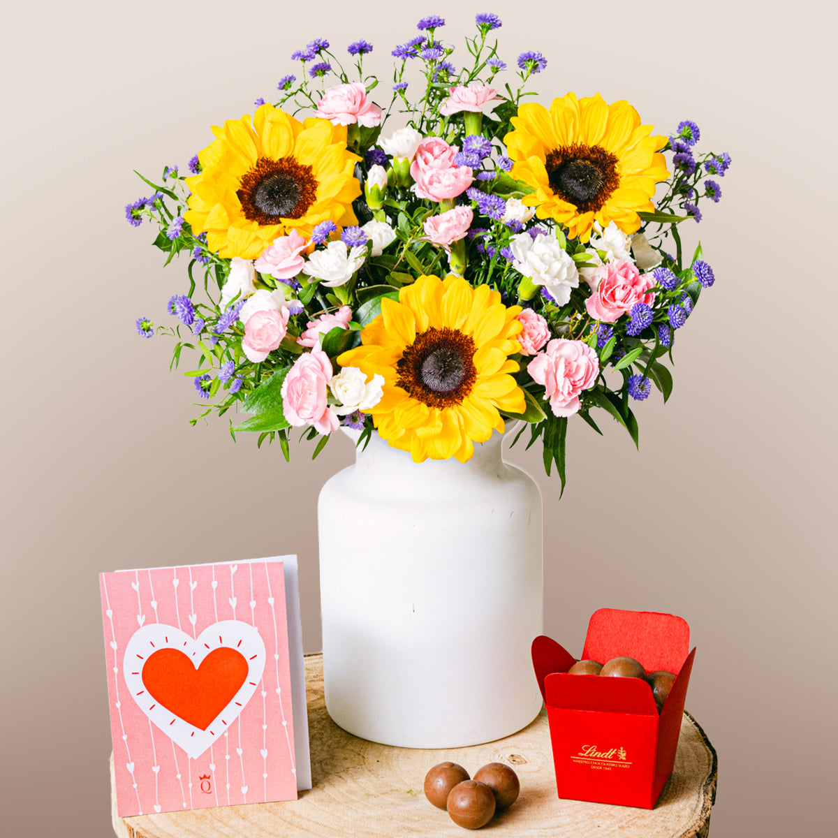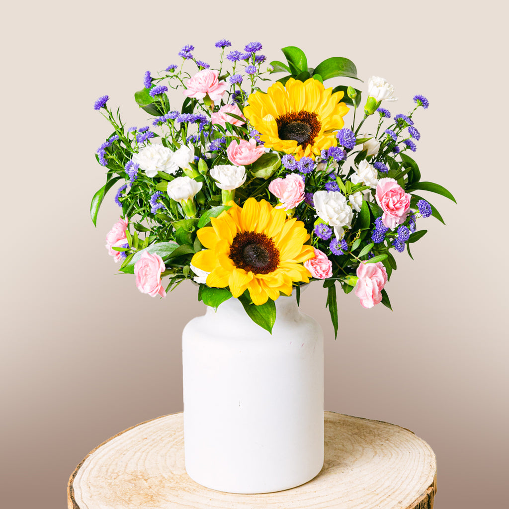 Zapewnij wyjątkowej dla Ciebie osobie kolorowy zachód słońca w salonie. Żółty kolor słoneczników, purpura zatrwiana i czerwonawe odcienie lentyszka sprawiają, iż bukiet Vibrant Sunset przywodzi na myśl piękne, letnie popołudnie.
