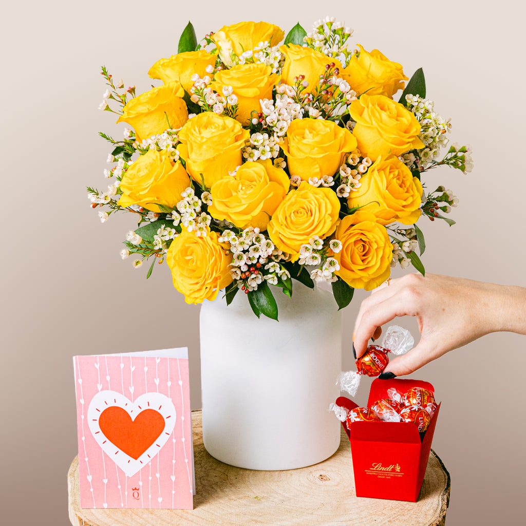 Tak jak ta osoba, która zawsze wprawia Cię w dobry nastrój, ten bukiet został stworzony, by rozjaśnić nawet najbardziej ponury dzień. Nasza promienna kompozycja, która zapewnia przyjemną atmosferę, składa się z żółtych róż uzupełnionych o białe kwiaty woskownicy, tworzące kontrast z ruszczykiem i lentyszkiem.