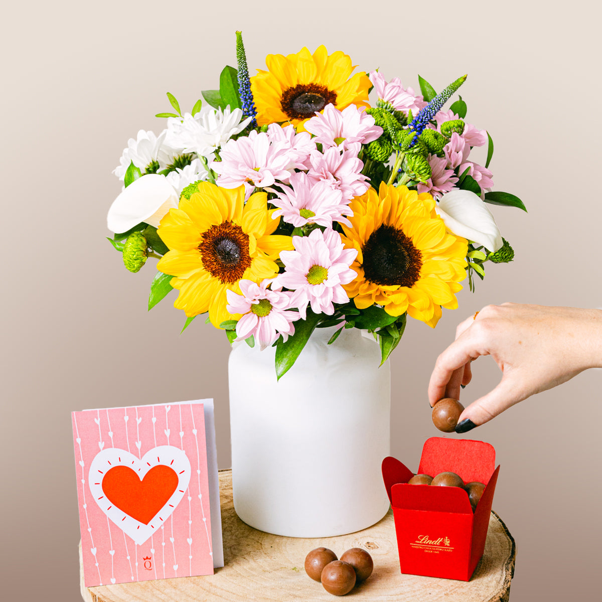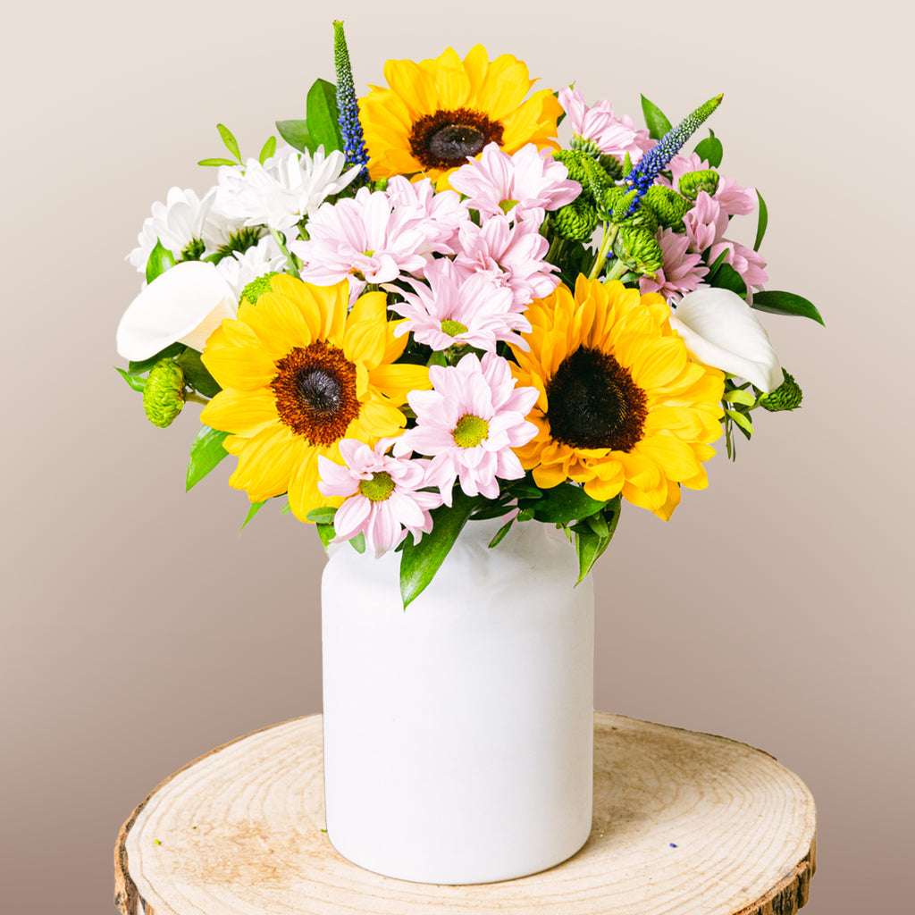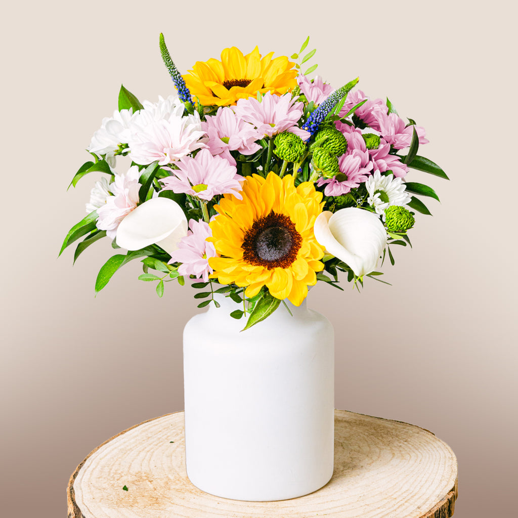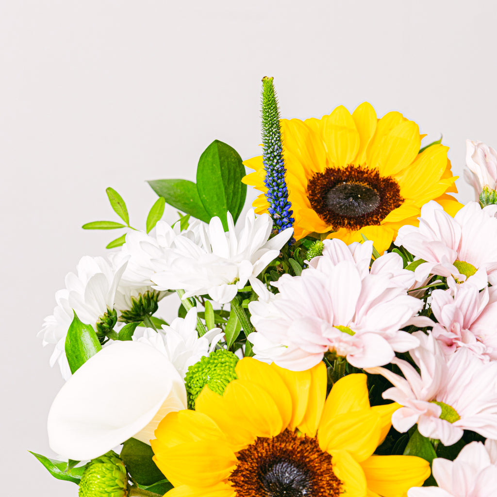 Sunny Lily to bukiet z ciepłych słoneczników, symbolizujących czystość kalii, chryzantem w różnych kolorach i przetacznika Veronica White. Zaskocz bliską osobę tą radosną kompozycją świeżych kwiatów.