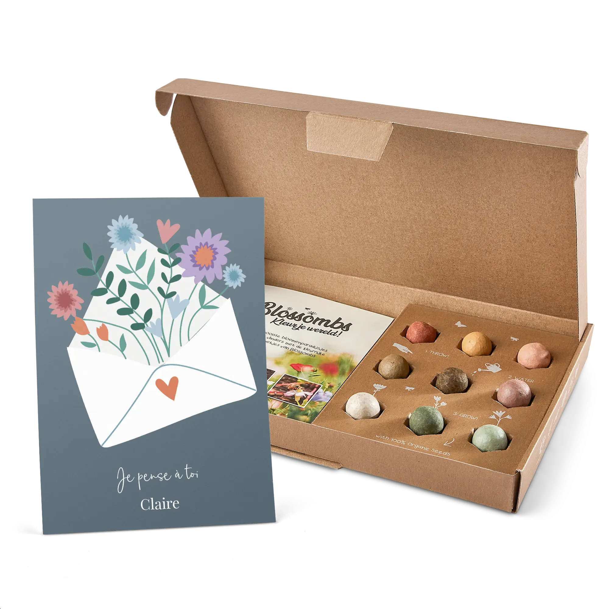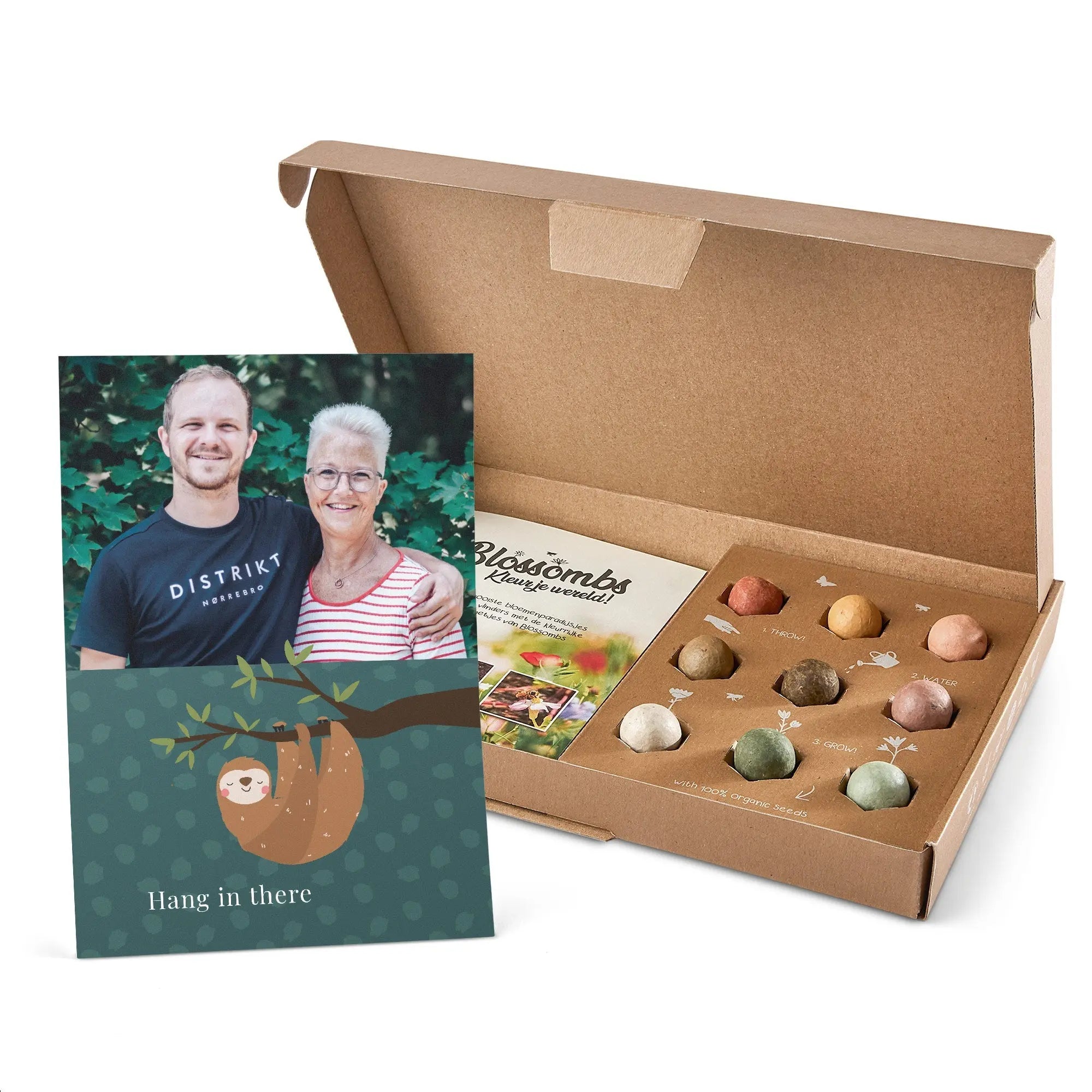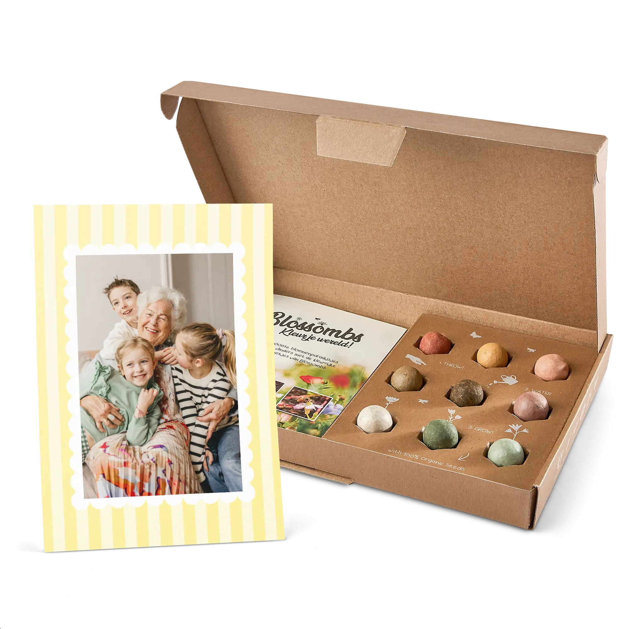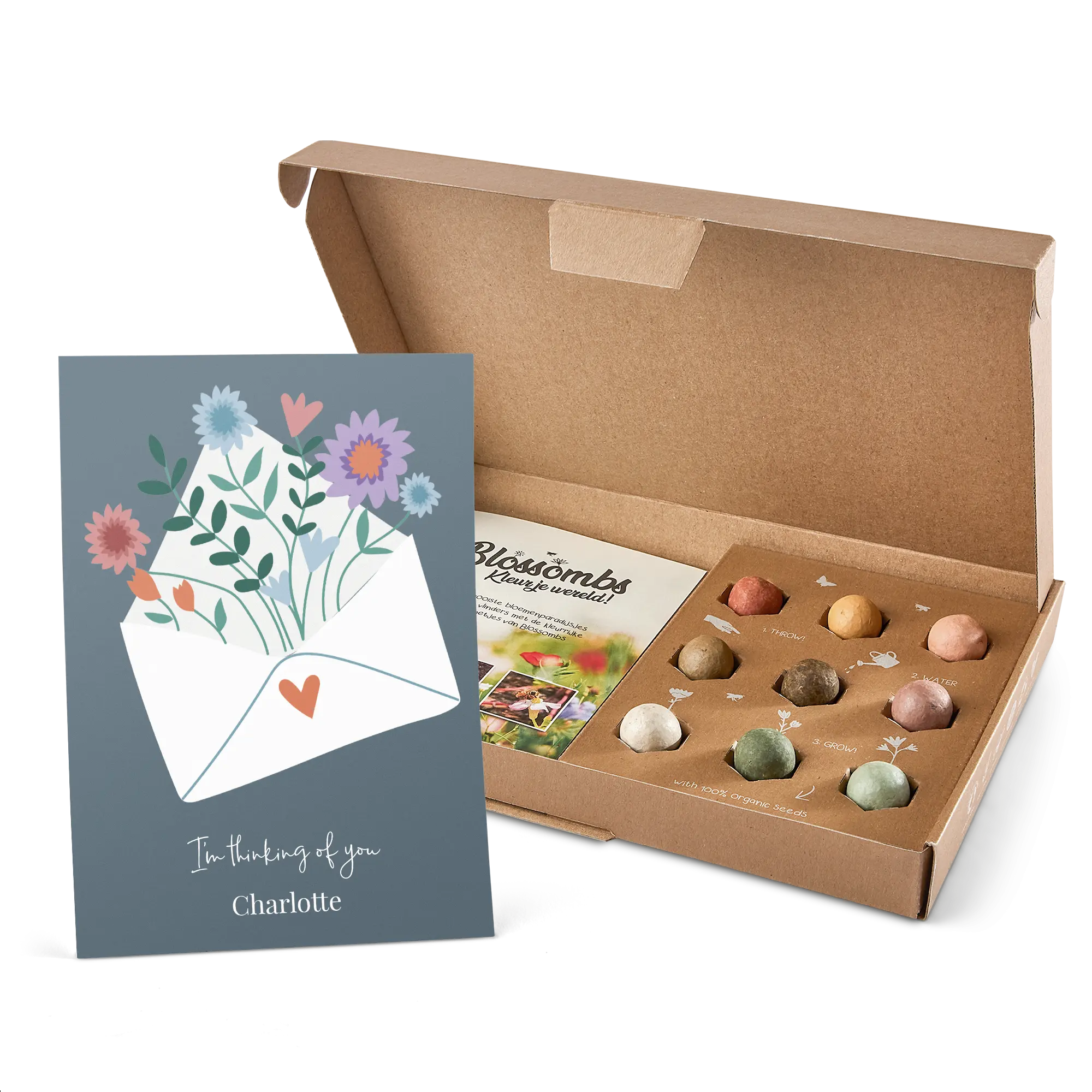 Bomby nasienne z dzikimi kwiatami w pudełku prezentowym z personalizowaną kartką z życzeniami. Stwórz swoją już teraz!Więcej informacji o bombach nasiennych z dzikimi kwiatami:Marka: BlossombsLiczba bomb nasiennych w zestawie: 9Sposób użycia: od marca do wrześniaOkres przydatności do użycia: 2 lataMateriał: organiczne nasiona dzikich kwiatów i 100% organiczne składnikiZastosowanie: na zewnątrzWaga: 150 gramówWymiary pudełka prezentowego: 24 x 16 x 2,6 cmDodatkowe informacje: w zależności od momentu użycia bomb nasiennych, wyrośnięcie dzikich kwiatów zajmie od 2 do 3 miesięcy. Więcej informacji na temat kartki z życzeniami:Rodzaj kartki: w stylu pocztówkiWymiary: 14,8 x 10,5 cmOrientacja: poziomaWykończenie: matowe wykończenie deluxeDruk: idealny, w pełnym kolorzePersonalizacja: zdjęciem i/lub tekstemKoperta: w zestawie 1 biała kopertaZe względów technicznych nie jest możliwe użycie znaków cyrylicy, arabskich, azjatyckich, greckich ani znaków specjalnych.