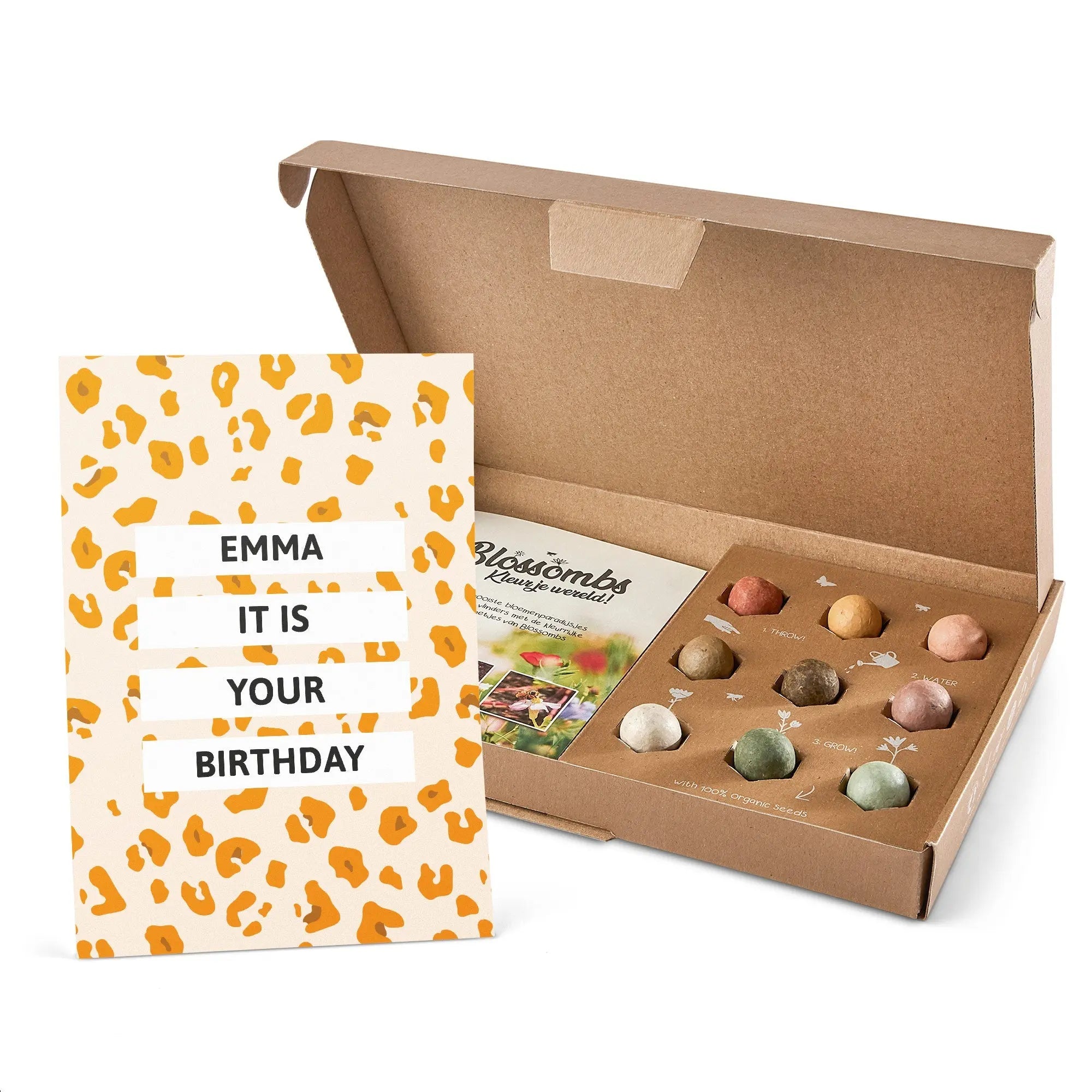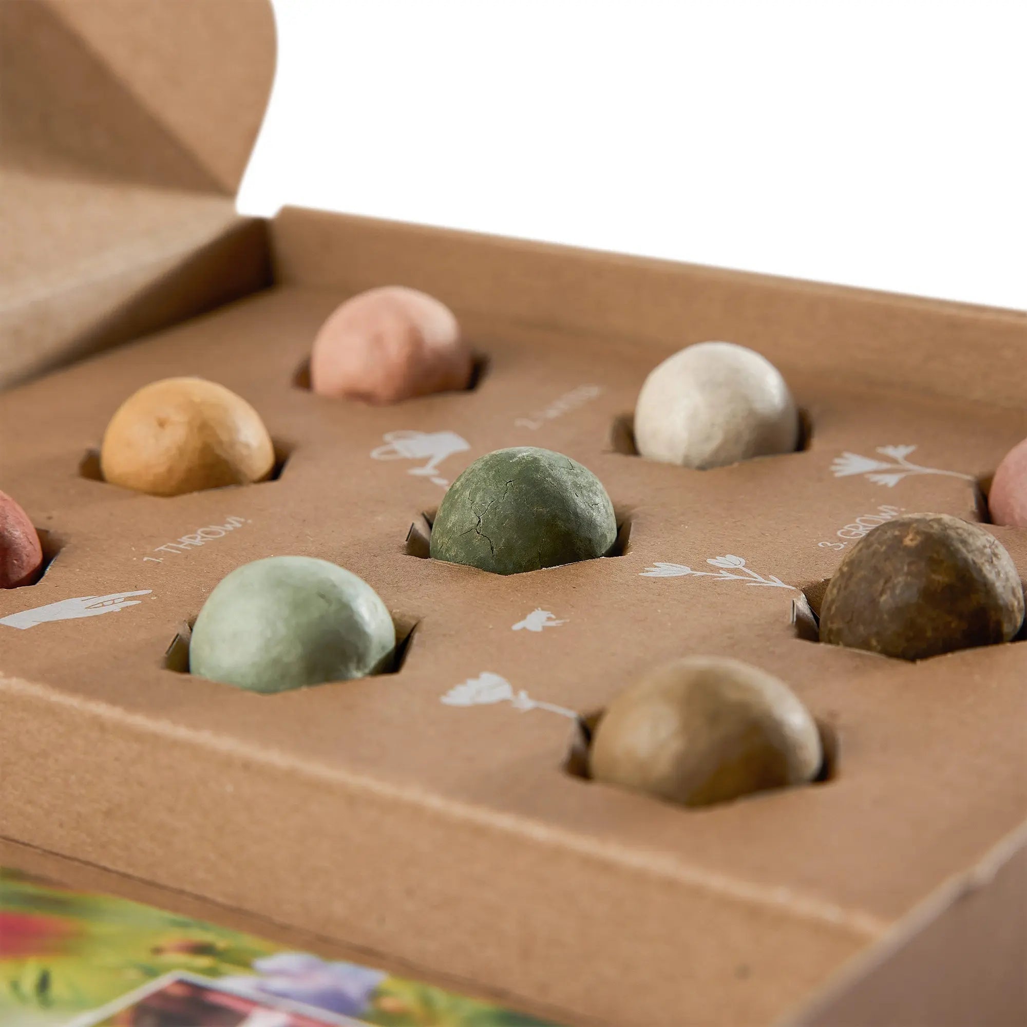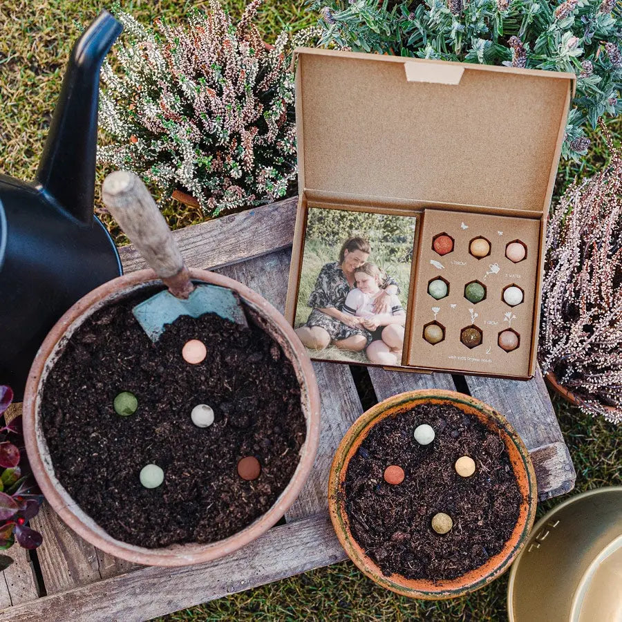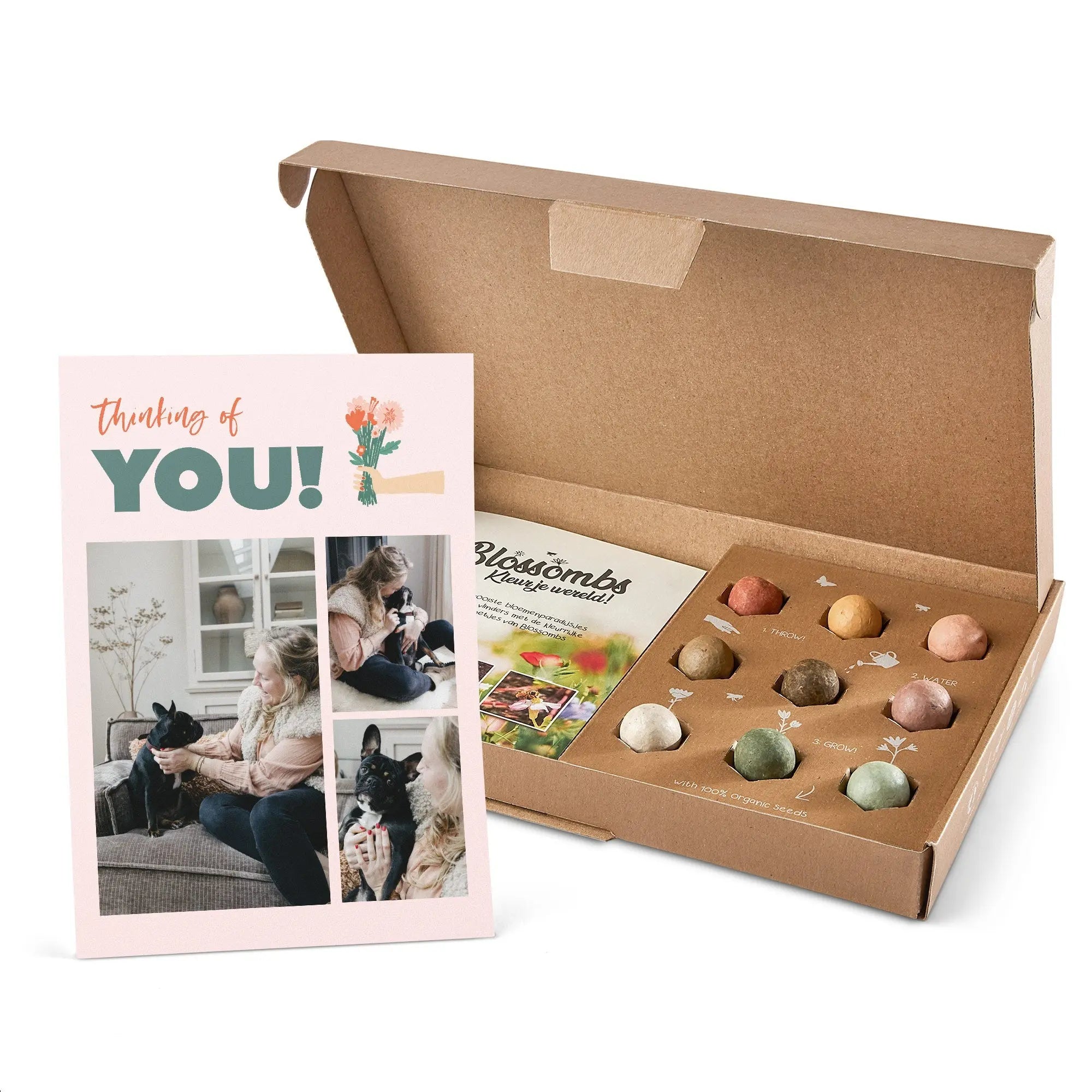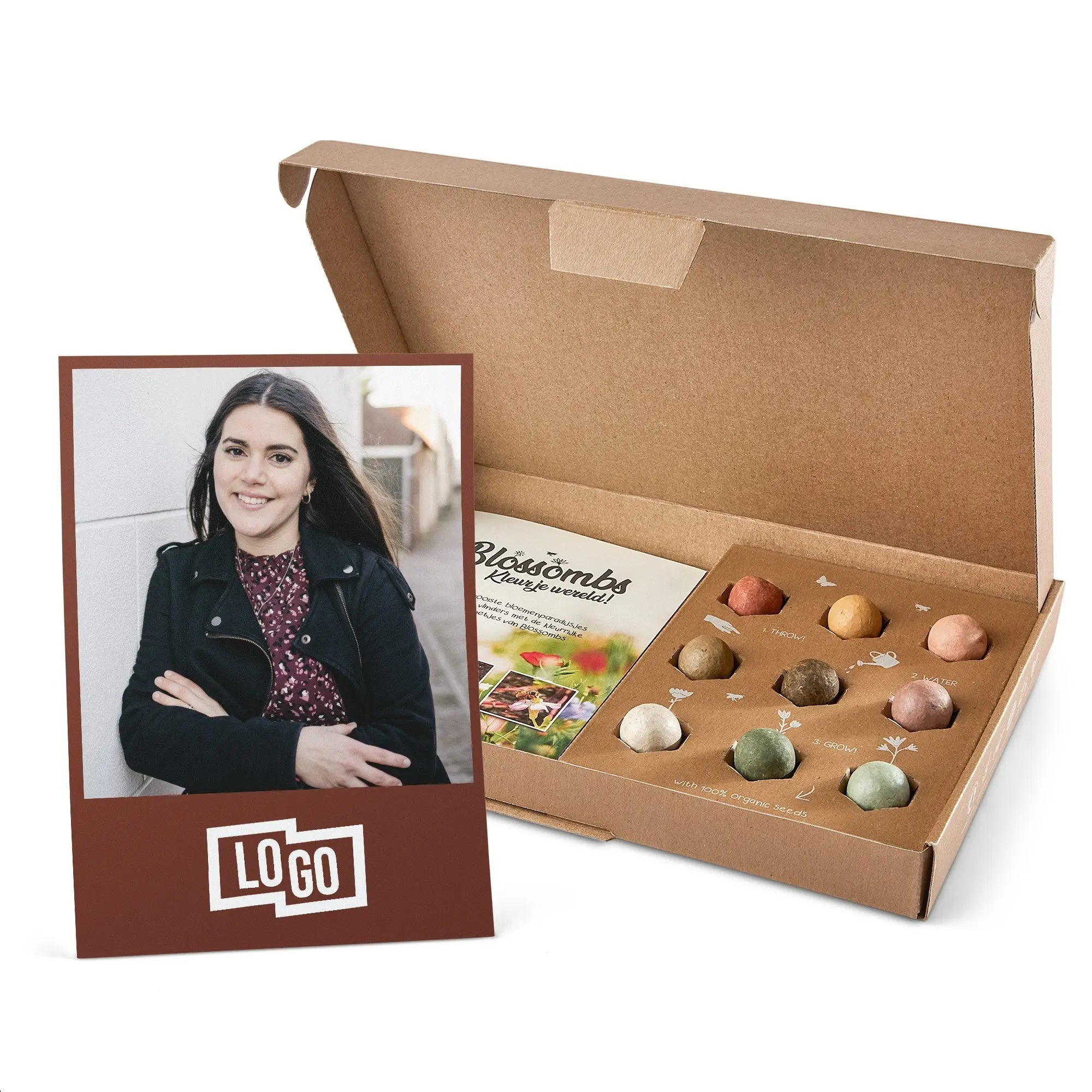 Bomby nasienne z dzikimi kwiatami w pudełku prezentowym z personalizowaną kartką z życzeniami. Stwórz swoją już teraz!Więcej informacji o bombach nasiennych z dzikimi kwiatami:Marka: BlossombsLiczba bomb nasiennych w zestawie: 9Sposób użycia: od marca do wrześniaOkres przydatności do użycia: 2 lataMateriał: organiczne nasiona dzikich kwiatów i 100% organiczne składnikiZastosowanie: na zewnątrzWaga: 150 gramówWymiary pudełka prezentowego: 24 x 16 x 2,6 cmDodatkowe informacje: w zależności od momentu użycia bomb nasiennych, wyrośnięcie dzikich kwiatów zajmie od 2 do 3 miesięcy. Więcej informacji na temat kartki z życzeniami:Rodzaj kartki: w stylu pocztówkiWymiary: 14,8 x 10,5 cmOrientacja: poziomaWykończenie: matowe wykończenie deluxeDruk: idealny, w pełnym kolorzePersonalizacja: zdjęciem i/lub tekstemKoperta: w zestawie 1 biała kopertaZe względów technicznych nie jest możliwe użycie znaków cyrylicy, arabskich, azjatyckich, greckich ani znaków specjalnych.