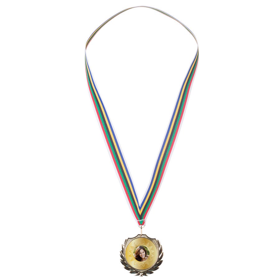 Więcej informacjiMateriał: metal ze wstążkąKolor: złotyWymiary medalu: ø 7cm / 2.8"Wymiary nadruku: ø 5cm / 2"